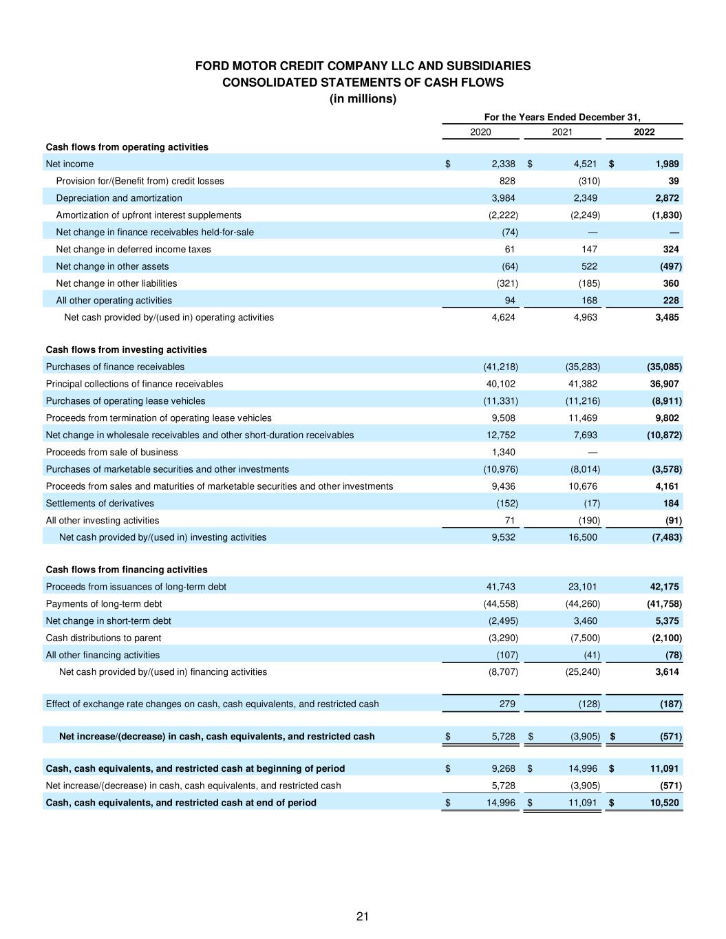 21 FORD MOTOR CREDIT COMPANY LLC AND SUBSIDIARIES CONSOLIDATED STATEMENTS OF CASH FLOWS (in millions) For the Years Ended December 31, 2020 2021 2022 Cash flows from operating activities Net income $ 2,338 $ 4,521 $ 1,989 Provision for/(Benefit from) credit losses 828 (310) 39 Depreciation and amortization 3,984 2,349 2,872 Amortization of upfront interest supplements (2,222) (2,249) (1,830) Net change in finance receivables held-for-sale (74) — — Net change in deferred income taxes 61 147 324 Net change in other assets (64) 522 (497) Net change in other liabilities (321) (185) 360 All other operating activities 94 168 228 Net cash provided by/(used in) operating activities 4,624 4,963 3,485 Cash flows from investing activities Purchases of finance receivables (41,218) (35,283) (35,085) Principal collections of finance receivables 40,102 41,382 36,907 Purchases of operating lease vehicles (11,331) (11,216) (8,911) Proceeds from termination of operating lease vehicles 9,508 11,469 9,802 Net change in wholesale receivables and other short-duration receivables 12,752 7,693 (10,872) Proceeds from sale of business 1,340 — Purchases of marketable securities and other investments (10,976) (8,014) (3,578) Proceeds from sales and maturities of marketable securities and other investments 9,436 10,676 4,161 Settlements of derivatives (152) (17) 184 All other investing activities 71 (190) (91) Net cash provided by/(used in) investing activities 9,532 16,500 (7,483) Cash flows from financing activities Proceeds from issuances of long-term debt 41,743 23,101 42,175 Payments of long-term debt (44,558) (44,260) (41,758) Net change in short-term debt (2,495) 3,460 5,375 Cash distributions to parent (3,290) (7,500) (2,100) All other financing activities (107) (41) (78) Net cash provided by/(used in) financing activities (8,707) (25,240) 3,614 Effect of exchange rate changes on cash, cash equivalents, and restricted cash 279 (128) (187) Net increase/(decrease) in cash, cash equivalents, and restricted cash $ 5,728 $ (3,905) $ (571) Cash, cash equivalents, and restricted cash at beginning of period $ 9,268 $ 14,996 $ 11,091 Net increase/(decrease) in cash, cash equivalents, and restricted cash 5,728 (3,905) (571) Cash, cash equivalents, and restricted cash at end of period $ 14,996 $ 11,091 $ 10,520