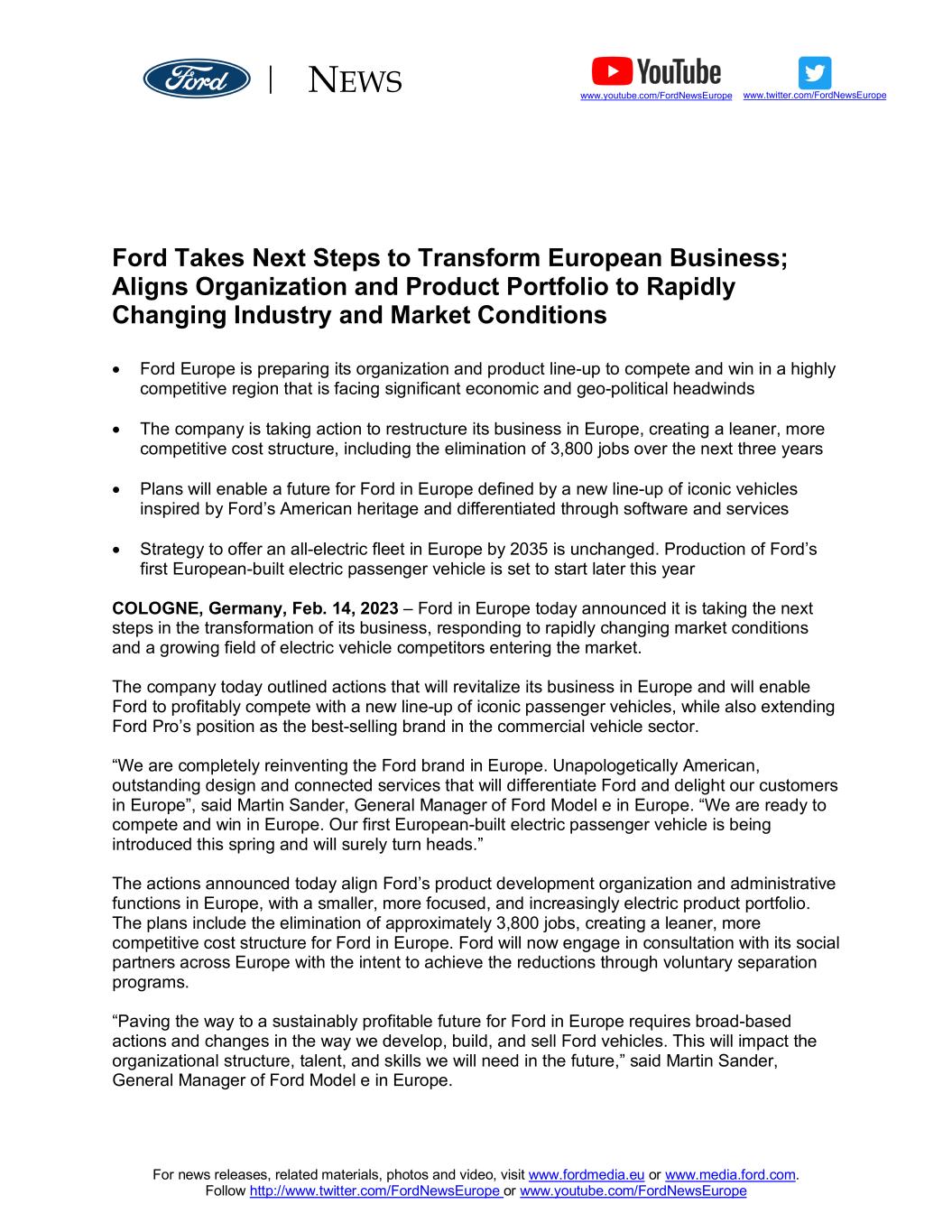 NEWS For news releases, related materials, photos and video, visit www.fordmedia.eu or www.media.ford.com. Follow http://www.twitter.com/FordNewsEurope or www.youtube.com/FordNewsEurope www.youtube.com/FordNewsEurope www.twitter.com/FordNewsEurope Ford Takes Next Steps to Transform European Business; Aligns Organization and Product Portfolio to Rapidly Changing Industry and Market Conditions • Ford Europe is preparing its organization and product line-up to compete and win in a highly competitive region that is facing significant economic and geo-political headwinds • The company is taking action to restructure its business in Europe, creating a leaner, more competitive cost structure, including the elimination of 3,800 jobs over the next three years • Plans will enable a future for Ford in Europe defined by a new line-up of iconic vehicles inspired by Ford’s American heritage and differentiated through software and services • Strategy to offer an all-electric fleet in Europe by 2035 is unchanged. Production of Ford’s first European-built electric passenger vehicle is set to start later this year COLOGNE, Germany, Feb. 14, 2023 – Ford in Europe today announced it is taking the next steps in the transformation of its business, responding to rapidly changing market conditions and a growing field of electric vehicle competitors entering the market. The company today outlined actions that will revitalize its business in Europe and will enable Ford to profitably compete with a new line-up of iconic passenger vehicles, while also extending Ford Pro’s position as the best-selling brand in the commercial vehicle sector. “We are completely reinventing the Ford brand in Europe. Unapologetically American, outstanding design and connected services that will differentiate Ford and delight our customers in Europe”, said Martin Sander, General Manager of Ford Model e in Europe. “We are ready to compete and win in Europe. Our first European-built electric passenger vehicle is being introduced this spring and will surely turn heads.” The actions announced today align Ford’s product development organization and administrative functions in Europe, with a smaller, more focused, and increasingly electric product portfolio. The plans include the elimination of approximately 3,800 jobs, creating a leaner, more competitive cost structure for Ford in Europe. Ford will now engage in consultation with its social partners across Europe with the intent to achieve the reductions through voluntary separation programs. “Paving the way to a sustainably profitable future for Ford in Europe requires broad-based actions and changes in the way we develop, build, and sell Ford vehicles. This will impact the organizational structure, talent, and skills we will need in the future,” said Martin Sander, General Manager of Ford Model e in Europe.