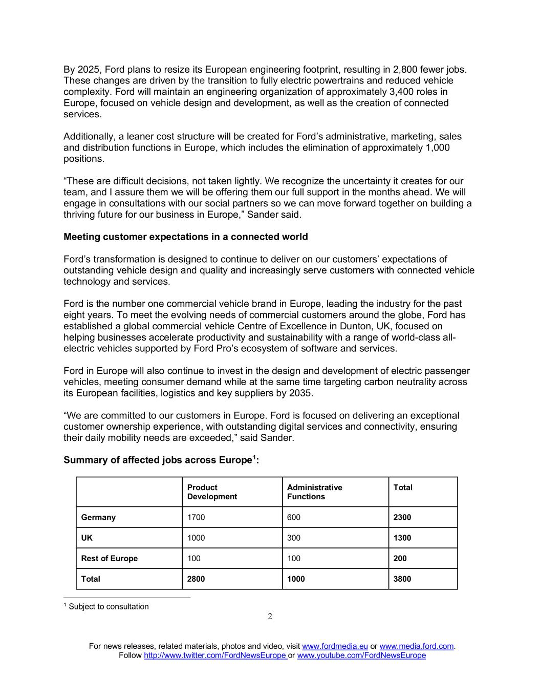 For news releases, related materials, photos and video, visit www.fordmedia.eu or www.media.ford.com. Follow http://www.twitter.com/FordNewsEurope or www.youtube.com/FordNewsEurope 2 By 2025, Ford plans to resize its European engineering footprint, resulting in 2,800 fewer jobs. These changes are driven by the transition to fully electric powertrains and reduced vehicle complexity. Ford will maintain an engineering organization of approximately 3,400 roles in Europe, focused on vehicle design and development, as well as the creation of connected services. Additionally, a leaner cost structure will be created for Ford’s administrative, marketing, sales and distribution functions in Europe, which includes the elimination of approximately 1,000 positions. “These are difficult decisions, not taken lightly. We recognize the uncertainty it creates for our team, and I assure them we will be offering them our full support in the months ahead. We will engage in consultations with our social partners so we can move forward together on building a thriving future for our business in Europe,” Sander said. Meeting customer expectations in a connected world Ford’s transformation is designed to continue to deliver on our customers’ expectations of outstanding vehicle design and quality and increasingly serve customers with connected vehicle technology and services. Ford is the number one commercial vehicle brand in Europe, leading the industry for the past eight years. To meet the evolving needs of commercial customers around the globe, Ford has established a global commercial vehicle Centre of Excellence in Dunton, UK, focused on helping businesses accelerate productivity and sustainability with a range of world-class all- electric vehicles supported by Ford Pro’s ecosystem of software and services. Ford in Europe will also continue to invest in the design and development of electric passenger vehicles, meeting consumer demand while at the same time targeting carbon neutrality across its European facilities, logistics and key suppliers by 2035. “We are committed to our customers in Europe. Ford is focused on delivering an exceptional customer ownership experience, with outstanding digital services and connectivity, ensuring their daily mobility needs are exceeded,” said Sander. Summary of affected jobs across Europe1: Product Development Administrative Functions Total Germany 1700 600 2300 UK 1000 300 1300 Rest of Europe 100 100 200 Total 2800 1000 3800 1 Subject to consultation