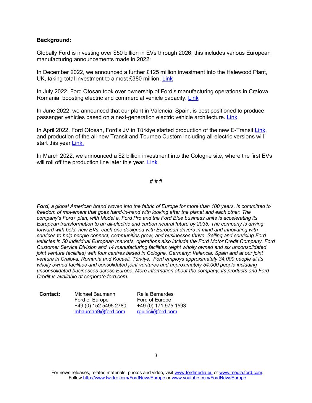 For news releases, related materials, photos and video, visit www.fordmedia.eu or www.media.ford.com. Follow http://www.twitter.com/FordNewsEurope or www.youtube.com/FordNewsEurope 3 Background: Globally Ford is investing over $50 billion in EVs through 2026, this includes various European manufacturing announcements made in 2022: In December 2022, we announced a further £125 million investment into the Halewood Plant, UK, taking total investment to almost £380 million. Link In July 2022, Ford Otosan took over ownership of Ford’s manufacturing operations in Craiova, Romania, boosting electric and commercial vehicle capacity. Link In June 2022, we announced that our plant in Valencia, Spain, is best positioned to produce passenger vehicles based on a next-generation electric vehicle architecture. Link In April 2022, Ford Otosan, Ford’s JV in Türkiye started production of the new E-Transit Link, and production of the all-new Transit and Tourneo Custom including all-electric versions will start this year Link. In March 2022, we announced a $2 billion investment into the Cologne site, where the first EVs will roll off the production line later this year. Link # # # Ford, a global American brand woven into the fabric of Europe for more than 100 years, is committed to freedom of movement that goes hand-in-hand with looking after the planet and each other. The company’s Ford+ plan, with Model e, Ford Pro and the Ford Blue business units is accelerating its European transformation to an all-electric and carbon neutral future by 2035. The company is driving forward with bold, new EVs, each one designed with European drivers in mind and innovating with services to help people connect, communities grow, and businesses thrive. Selling and servicing Ford vehicles in 50 individual European markets, operations also include the Ford Motor Credit Company, Ford Customer Service Division and 14 manufacturing facilities (eight wholly owned and six unconsolidated joint venture facilities) with four centres based in Cologne, Germany; Valencia, Spain and at our joint venture in Craiova, Romania and Kocaeli, Türkiye. Ford employs approximately 34,000 people at its wholly owned facilities and consolidated joint ventures and approximately 54,000 people including unconsolidated businesses across Europe. More information about the company, its products and Ford Credit is available at corporate.ford.com. Contact: Michael Baumann Rella Bernardes Ford of Europe Ford of Europe +49 (0) 152 5495 2780 +49 (0) 171 975 1593 mbauman9@ford.com rgiurici@ford.com