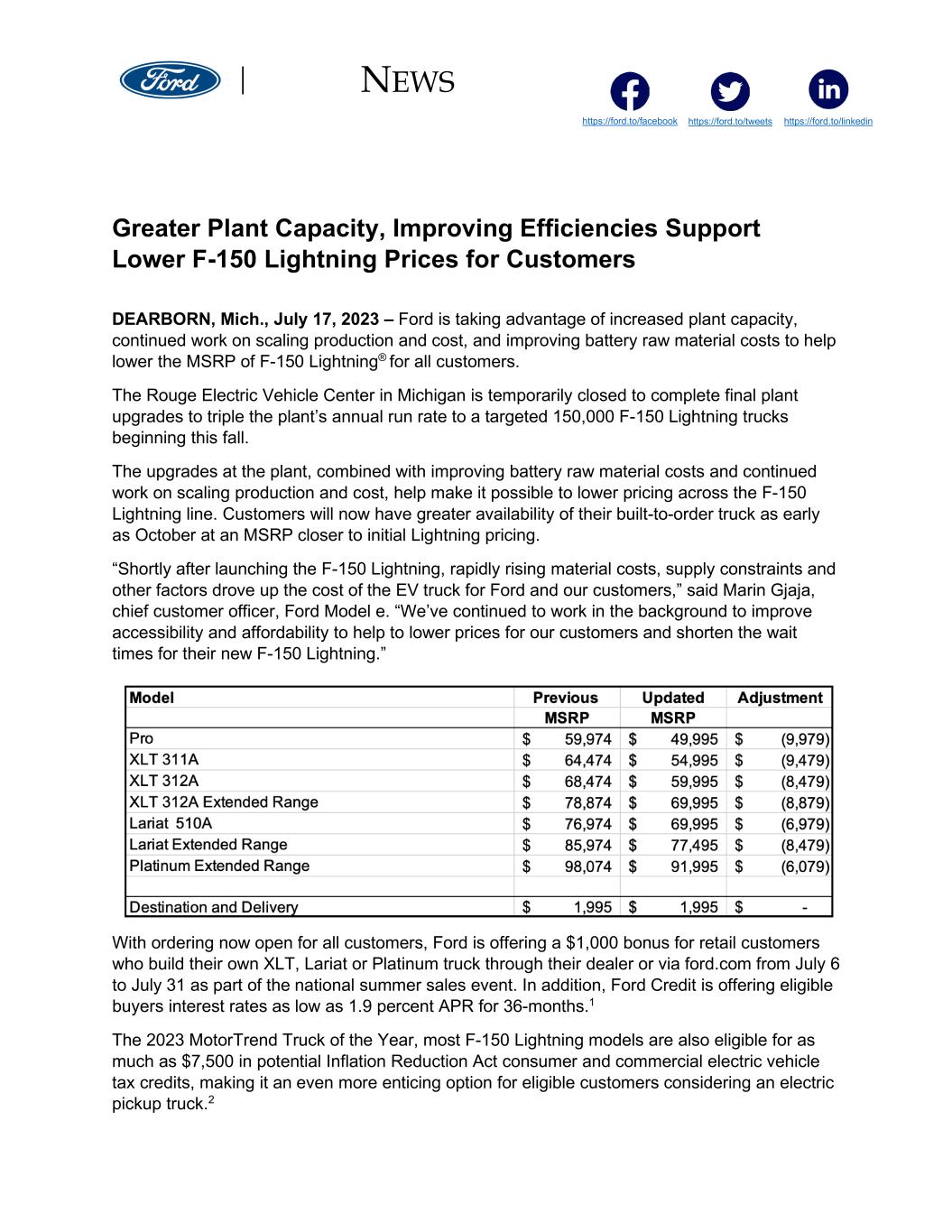 NEWS https://ford.to/tweets https://ford.to/facebook https://ford.to/linkedin Greater Plant Capacity, Improving Efficiencies Support Lower F-150 Lightning Prices for Customers DEARBORN, Mich., July 17, 2023 – Ford is taking advantage of increased plant capacity, continued work on scaling production and cost, and improving battery raw material costs to help lower the MSRP of F-150 Lightning® for all customers. The Rouge Electric Vehicle Center in Michigan is temporarily closed to complete final plant upgrades to triple the plant’s annual run rate to a targeted 150,000 F-150 Lightning trucks beginning this fall. The upgrades at the plant, combined with improving battery raw material costs and continued work on scaling production and cost, help make it possible to lower pricing across the F-150 Lightning line. Customers will now have greater availability of their built-to-order truck as early as October at an MSRP closer to initial Lightning pricing. “Shortly after launching the F-150 Lightning, rapidly rising material costs, supply constraints and other factors drove up the cost of the EV truck for Ford and our customers,” said Marin Gjaja, chief customer officer, Ford Model e. “We’ve continued to work in the background to improve accessibility and affordability to help to lower prices for our customers and shorten the wait times for their new F-150 Lightning.” With ordering now open for all customers, Ford is offering a $1,000 bonus for retail customers who build their own XLT, Lariat or Platinum truck through their dealer or via ford.com from July 6 to July 31 as part of the national summer sales event. In addition, Ford Credit is offering eligible buyers interest rates as low as 1.9 percent APR for 36-months.1 The 2023 MotorTrend Truck of the Year, most F-150 Lightning models are also eligible for as much as $7,500 in potential Inflation Reduction Act consumer and commercial electric vehicle tax credits, making it an even more enticing option for eligible customers considering an electric pickup truck.2