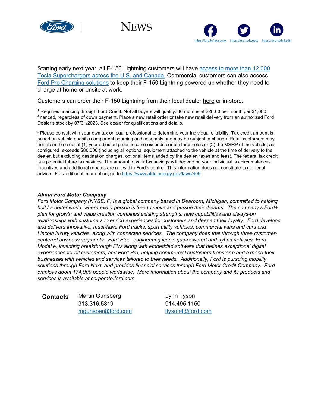 NEWS https://ford.to/tweets https://ford.to/facebook https://ford.to/linkedin Starting early next year, all F-150 Lightning customers will have access to more than 12,000 Tesla Superchargers across the U.S. and Canada. Commercial customers can also access Ford Pro Charging solutions to keep their F-150 Lightning powered up whether they need to charge at home or onsite at work. Customers can order their F-150 Lightning from their local dealer here or in-store. 1 Requires financing through Ford Credit. Not all buyers will qualify. 36 months at $28.60 per month per $1,000 financed, regardless of down payment. Place a new retail order or take new retail delivery from an authorized Ford Dealer’s stock by 07/31/2023. See dealer for qualifications and details. 2 Please consult with your own tax or legal professional to determine your individual eligibility. Tax credit amount is based on vehicle-specific component sourcing and assembly and may be subject to change. Retail customers may not claim the credit if (1) your adjusted gross income exceeds certain thresholds or (2) the MSRP of the vehicle, as configured, exceeds $80,000 (including all optional equipment attached to the vehicle at the time of delivery to the dealer, but excluding destination charges, optional items added by the dealer, taxes and fees). The federal tax credit is a potential future tax savings. The amount of your tax savings will depend on your individual tax circumstances. Incentives and additional rebates are not within Ford’s control. This information does not constitute tax or legal advice. For additional information, go to https://www.afdc.energy.gov/laws/409. About Ford Motor Company Ford Motor Company (NYSE: F) is a global company based in Dearborn, Michigan, committed to helping build a better world, where every person is free to move and pursue their dreams. The company’s Ford+ plan for growth and value creation combines existing strengths, new capabilities and always-on relationships with customers to enrich experiences for customers and deepen their loyalty. Ford develops and delivers innovative, must-have Ford trucks, sport utility vehicles, commercial vans and cars and Lincoln luxury vehicles, along with connected services. The company does that through three customer- centered business segments: Ford Blue, engineering iconic gas-powered and hybrid vehicles; Ford Model e, inventing breakthrough EVs along with embedded software that defines exceptional digital experiences for all customers; and Ford Pro, helping commercial customers transform and expand their businesses with vehicles and services tailored to their needs. Additionally, Ford is pursuing mobility solutions through Ford Next, and provides financial services through Ford Motor Credit Company. Ford employs about 174,000 people worldwide. More information about the company and its products and services is available at corporate.ford.com. Contacts Martin Gunsberg Lynn Tyson 313.316.5319 914.495.1150 mgunsber@ford.com ltyson4@ford.com