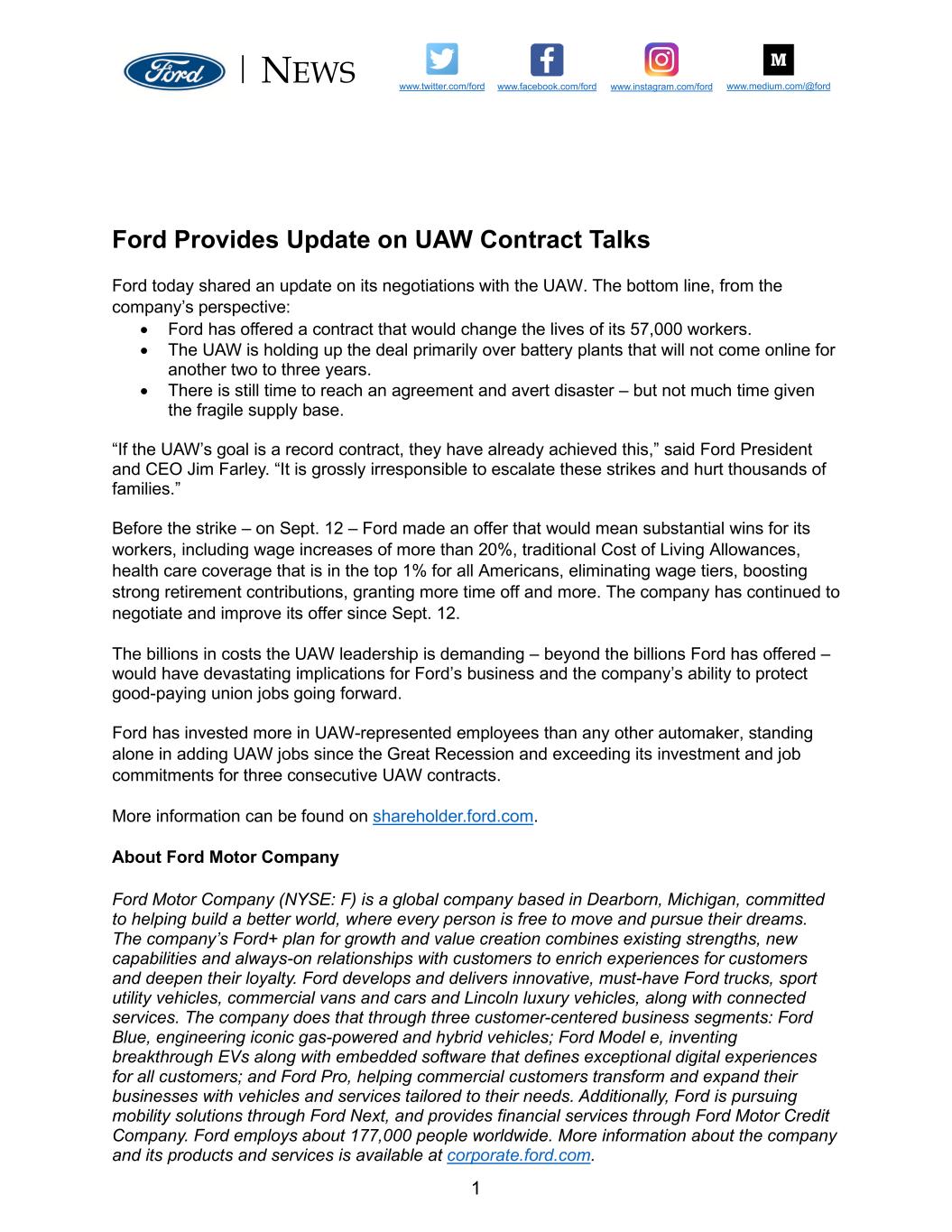 NEWS 1 www.facebook.com/ford www.medium.com/@ford www.twitter.com/ford www.instagram.com/ford Ford Provides Update on UAW Contract Talks Ford today shared an update on its negotiations with the UAW. The bottom line, from the company’s perspective: • Ford has offered a contract that would change the lives of its 57,000 workers. • The UAW is holding up the deal primarily over battery plants that will not come online for another two to three years. • There is still time to reach an agreement and avert disaster – but not much time given the fragile supply base. “If the UAW’s goal is a record contract, they have already achieved this,” said Ford President and CEO Jim Farley. “It is grossly irresponsible to escalate these strikes and hurt thousands of families.” Before the strike – on Sept. 12 – Ford made an offer that would mean substantial wins for its workers, including wage increases of more than 20%, traditional Cost of Living Allowances, health care coverage that is in the top 1% for all Americans, eliminating wage tiers, boosting strong retirement contributions, granting more time off and more. The company has continued to negotiate and improve its offer since Sept. 12. The billions in costs the UAW leadership is demanding – beyond the billions Ford has offered – would have devastating implications for Ford’s business and the company’s ability to protect good-paying union jobs going forward. Ford has invested more in UAW-represented employees than any other automaker, standing alone in adding UAW jobs since the Great Recession and exceeding its investment and job commitments for three consecutive UAW contracts. More information can be found on shareholder.ford.com. About Ford Motor Company Ford Motor Company (NYSE: F) is a global company based in Dearborn, Michigan, committed to helping build a better world, where every person is free to move and pursue their dreams. The company’s Ford+ plan for growth and value creation combines existing strengths, new capabilities and always-on relationships with customers to enrich experiences for customers and deepen their loyalty. Ford develops and delivers innovative, must-have Ford trucks, sport utility vehicles, commercial vans and cars and Lincoln luxury vehicles, along with connected services. The company does that through three customer-centered business segments: Ford Blue, engineering iconic gas-powered and hybrid vehicles; Ford Model e, inventing breakthrough EVs along with embedded software that defines exceptional digital experiences for all customers; and Ford Pro, helping commercial customers transform and expand their businesses with vehicles and services tailored to their needs. Additionally, Ford is pursuing mobility solutions through Ford Next, and provides financial services through Ford Motor Credit Company. Ford employs about 177,000 people worldwide. More information about the company and its products and services is available at corporate.ford.com.