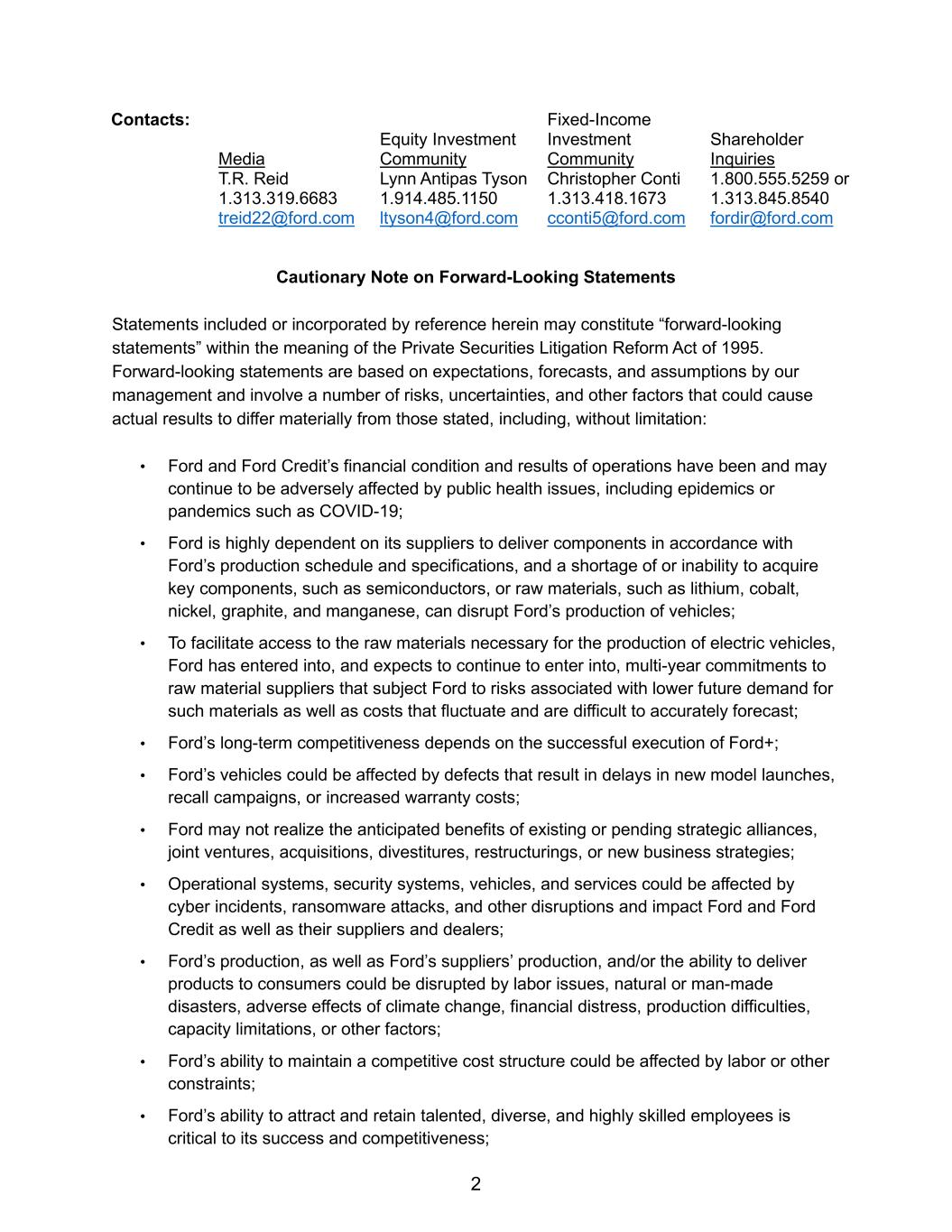 2 Contacts: Fixed-Income Media T.R. Reid 1.313.319.6683 Equity Investment Community Lynn Antipas Tyson 1.914.485.1150 Investment Community Christopher Conti 1.313.418.1673 Shareholder Inquiries 1.800.555.5259 or 1.313.845.8540 treid22@ford.com ltyson4@ford.com cconti5@ford.com fordir@ford.com Cautionary Note on Forward-Looking Statements Statements included or incorporated by reference herein may constitute “forward-looking statements” within the meaning of the Private Securities Litigation Reform Act of 1995. Forward-looking statements are based on expectations, forecasts, and assumptions by our management and involve a number of risks, uncertainties, and other factors that could cause actual results to differ materially from those stated, including, without limitation: • Ford and Ford Credit’s financial condition and results of operations have been and may continue to be adversely affected by public health issues, including epidemics or pandemics such as COVID-19; • Ford is highly dependent on its suppliers to deliver components in accordance with Ford’s production schedule and specifications, and a shortage of or inability to acquire key components, such as semiconductors, or raw materials, such as lithium, cobalt, nickel, graphite, and manganese, can disrupt Ford’s production of vehicles; • To facilitate access to the raw materials necessary for the production of electric vehicles, Ford has entered into, and expects to continue to enter into, multi-year commitments to raw material suppliers that subject Ford to risks associated with lower future demand for such materials as well as costs that fluctuate and are difficult to accurately forecast; • Ford’s long-term competitiveness depends on the successful execution of Ford+; • Ford’s vehicles could be affected by defects that result in delays in new model launches, recall campaigns, or increased warranty costs; • Ford may not realize the anticipated benefits of existing or pending strategic alliances, joint ventures, acquisitions, divestitures, restructurings, or new business strategies; • Operational systems, security systems, vehicles, and services could be affected by cyber incidents, ransomware attacks, and other disruptions and impact Ford and Ford Credit as well as their suppliers and dealers; • Ford’s production, as well as Ford’s suppliers’ production, and/or the ability to deliver products to consumers could be disrupted by labor issues, natural or man-made disasters, adverse effects of climate change, financial distress, production difficulties, capacity limitations, or other factors; • Ford’s ability to maintain a competitive cost structure could be affected by labor or other constraints; • Ford’s ability to attract and retain talented, diverse, and highly skilled employees is critical to its success and competitiveness;
