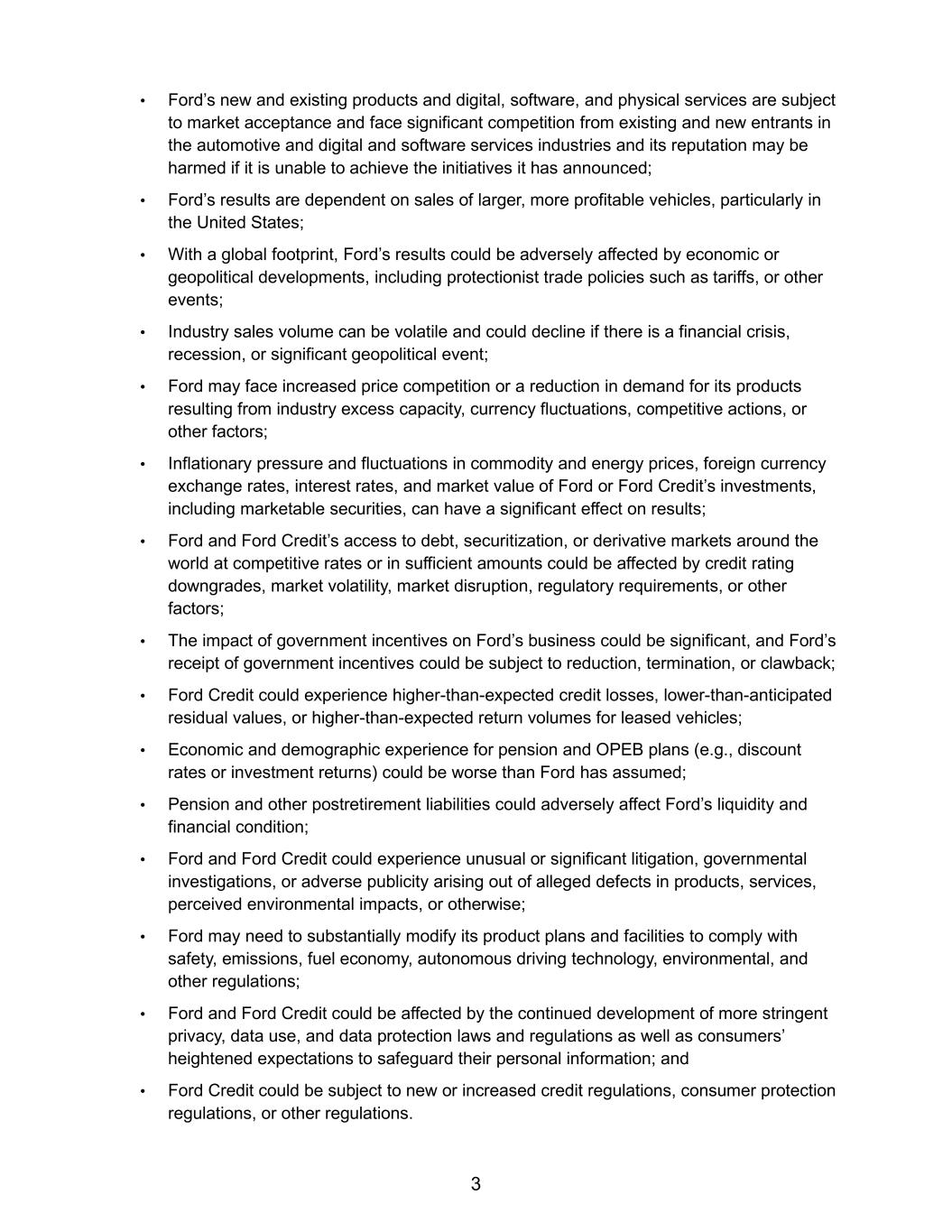 3 • Ford’s new and existing products and digital, software, and physical services are subject to market acceptance and face significant competition from existing and new entrants in the automotive and digital and software services industries and its reputation may be harmed if it is unable to achieve the initiatives it has announced; • Ford’s results are dependent on sales of larger, more profitable vehicles, particularly in the United States; • With a global footprint, Ford’s results could be adversely affected by economic or geopolitical developments, including protectionist trade policies such as tariffs, or other events; • Industry sales volume can be volatile and could decline if there is a financial crisis, recession, or significant geopolitical event; • Ford may face increased price competition or a reduction in demand for its products resulting from industry excess capacity, currency fluctuations, competitive actions, or other factors; • Inflationary pressure and fluctuations in commodity and energy prices, foreign currency exchange rates, interest rates, and market value of Ford or Ford Credit’s investments, including marketable securities, can have a significant effect on results; • Ford and Ford Credit’s access to debt, securitization, or derivative markets around the world at competitive rates or in sufficient amounts could be affected by credit rating downgrades, market volatility, market disruption, regulatory requirements, or other factors; • The impact of government incentives on Ford’s business could be significant, and Ford’s receipt of government incentives could be subject to reduction, termination, or clawback; • Ford Credit could experience higher-than-expected credit losses, lower-than-anticipated residual values, or higher-than-expected return volumes for leased vehicles; • Economic and demographic experience for pension and OPEB plans (e.g., discount rates or investment returns) could be worse than Ford has assumed; • Pension and other postretirement liabilities could adversely affect Ford’s liquidity and financial condition; • Ford and Ford Credit could experience unusual or significant litigation, governmental investigations, or adverse publicity arising out of alleged defects in products, services, perceived environmental impacts, or otherwise; • Ford may need to substantially modify its product plans and facilities to comply with safety, emissions, fuel economy, autonomous driving technology, environmental, and other regulations; • Ford and Ford Credit could be affected by the continued development of more stringent privacy, data use, and data protection laws and regulations as well as consumers’ heightened expectations to safeguard their personal information; and • Ford Credit could be subject to new or increased credit regulations, consumer protection regulations, or other regulations.