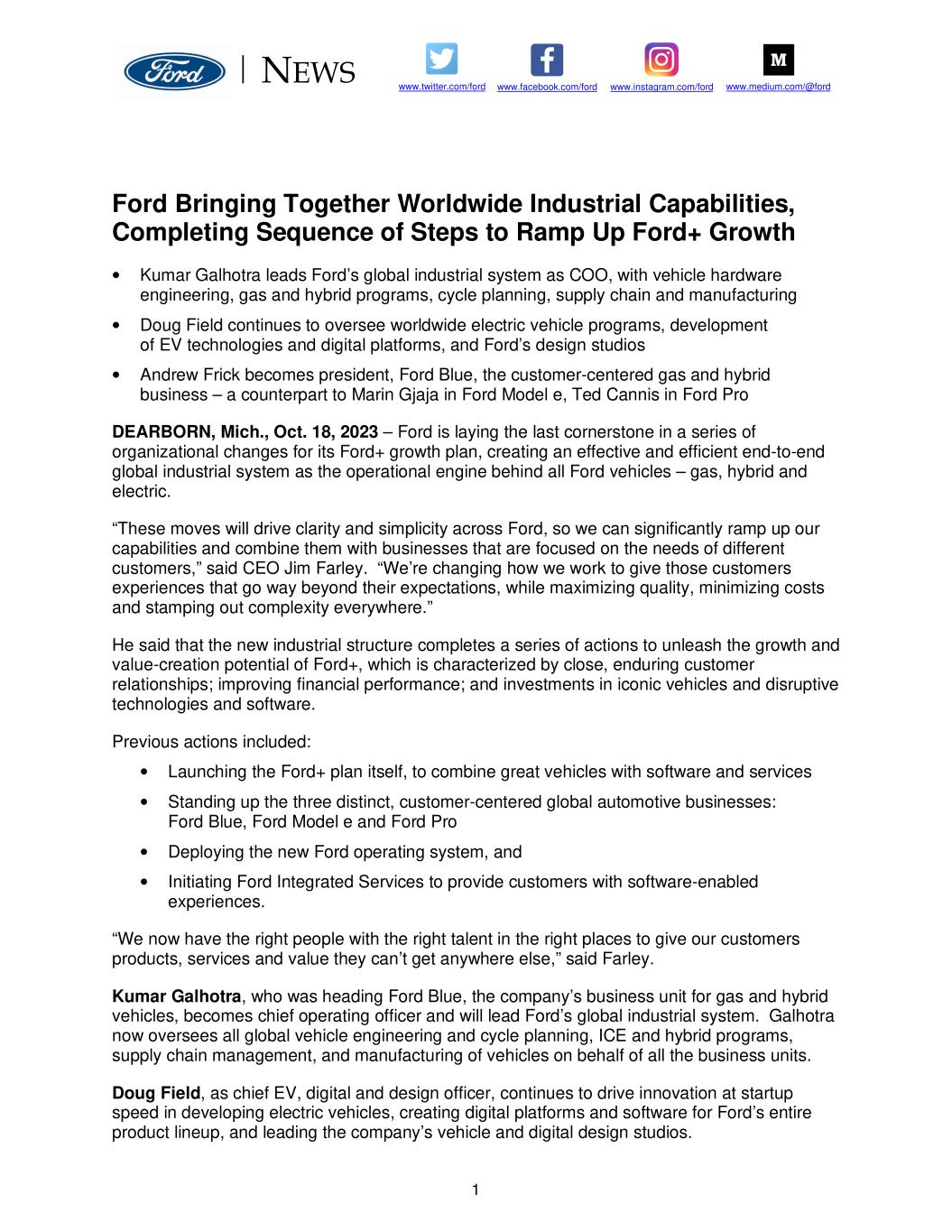 NEWS 1 www.facebook.com/ford www.medium.com/@ford www.twitter.com/ford www.instagram.com/ford Ford Bringing Together Worldwide Industrial Capabilities, Completing Sequence of Steps to Ramp Up Ford+ Growth • Kumar Galhotra leads Ford’s global industrial system as COO, with vehicle hardware engineering, gas and hybrid programs, cycle planning, supply chain and manufacturing • Doug Field continues to oversee worldwide electric vehicle programs, development of EV technologies and digital platforms, and Ford’s design studios • Andrew Frick becomes president, Ford Blue, the customer-centered gas and hybrid business – a counterpart to Marin Gjaja in Ford Model e, Ted Cannis in Ford Pro DEARBORN, Mich., Oct. 18, 2023 – Ford is laying the last cornerstone in a series of organizational changes for its Ford+ growth plan, creating an effective and efficient end-to-end global industrial system as the operational engine behind all Ford vehicles – gas, hybrid and electric. “These moves will drive clarity and simplicity across Ford, so we can significantly ramp up our capabilities and combine them with businesses that are focused on the needs of different customers,” said CEO Jim Farley. “We’re changing how we work to give those customers experiences that go way beyond their expectations, while maximizing quality, minimizing costs and stamping out complexity everywhere.” He said that the new industrial structure completes a series of actions to unleash the growth and value-creation potential of Ford+, which is characterized by close, enduring customer relationships; improving financial performance; and investments in iconic vehicles and disruptive technologies and software. Previous actions included: • Launching the Ford+ plan itself, to combine great vehicles with software and services • Standing up the three distinct, customer-centered global automotive businesses: Ford Blue, Ford Model e and Ford Pro • Deploying the new Ford operating system, and • Initiating Ford Integrated Services to provide customers with software-enabled experiences. “We now have the right people with the right talent in the right places to give our customers products, services and value they can’t get anywhere else,” said Farley. Kumar Galhotra, who was heading Ford Blue, the company’s business unit for gas and hybrid vehicles, becomes chief operating officer and will lead Ford’s global industrial system. Galhotra now oversees all global vehicle engineering and cycle planning, ICE and hybrid programs, supply chain management, and manufacturing of vehicles on behalf of all the business units. Doug Field, as chief EV, digital and design officer, continues to drive innovation at startup speed in developing electric vehicles, creating digital platforms and software for Ford’s entire product lineup, and leading the company’s vehicle and digital design studios.
