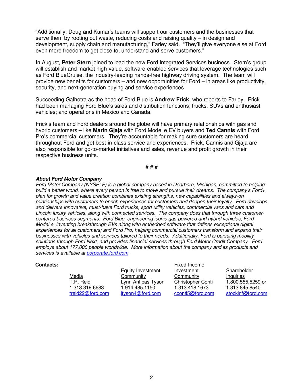 2 “Additionally, Doug and Kumar’s teams will support our customers and the businesses that serve them by rooting out waste, reducing costs and raising quality – in design and development, supply chain and manufacturing,” Farley said. “They’ll give everyone else at Ford even more freedom to get close to, understand and serve customers.” In August, Peter Stern joined to lead the new Ford Integrated Services business. Stern’s group will establish and market high-value, software-enabled services that leverage technologies such as Ford BlueCruise, the industry-leading hands-free highway driving system. The team will provide new benefits for customers – and new opportunities for Ford – in areas like productivity, security, and next-generation buying and service experiences. Succeeding Galhotra as the head of Ford Blue is Andrew Frick, who reports to Farley. Frick had been managing Ford Blue’s sales and distribution functions; trucks, SUVs and enthusiast vehicles; and operations in Mexico and Canada. Frick’s team and Ford dealers around the globe will have primary relationships with gas and hybrid customers – like Marin Gjaja with Ford Model e EV buyers and Ted Cannis with Ford Pro’s commercial customers. They’re accountable for making sure customers are heard throughout Ford and get best-in-class service and experiences. Frick, Cannis and Gjaja are also responsible for go-to-market initiatives and sales, revenue and profit growth in their respective business units. # # # About Ford Motor Company Ford Motor Company (NYSE: F) is a global company based in Dearborn, Michigan, committed to helping build a better world, where every person is free to move and pursue their dreams. The company’s Ford+ plan for growth and value creation combines existing strengths, new capabilities and always-on relationships with customers to enrich experiences for customers and deepen their loyalty. Ford develops and delivers innovative, must-have Ford trucks, sport utility vehicles, commercial vans and cars and Lincoln luxury vehicles, along with connected services. The company does that through three customer- centered business segments: Ford Blue, engineering iconic gas-powered and hybrid vehicles; Ford Model e, inventing breakthrough EVs along with embedded software that defines exceptional digital experiences for all customers; and Ford Pro, helping commercial customers transform and expand their businesses with vehicles and services tailored to their needs. Additionally, Ford is pursuing mobility solutions through Ford Next, and provides financial services through Ford Motor Credit Company. Ford employs about 177,000 people worldwide. More information about the company and its products and services is available at corporate.ford.com. Contacts: Fixed-Income Media T.R. Reid 1.313.319.6683 Equity Investment Community Lynn Antipas Tyson 1.914.485.1150 Investment Community Christopher Conti 1.313.418.1673 Shareholder Inquiries 1.800.555.5259 or 1.313.845.8540 treid22@ford.com ltyson4@ford.com cconti5@ford.com stockinf@ford.com