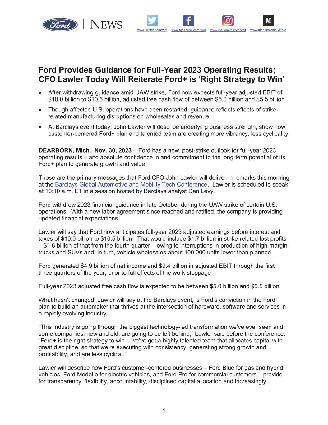 NEWS 1 www.facebook.com/ford www.medium.com/@fordwww.twitter.com/ford www.instagram.com/ford Ford Provides Guidance for Full-Year 2023 Operating Results; CFO Lawler Today Will Reiterate Ford+ is ‘Right Strategy to Win’ · After withdrawing guidance amid UAW strike, Ford now expects full-year adjusted EBIT of $10.0 billion to $10.5 billion, adjusted free cash flow of between $5.0 billion and $5.5 billion · Though affected U.S. operations have been restarted, guidance reflects effects of strike- related manufacturing disruptions on wholesales and revenue · At Barclays event today, John Lawler will describe underlying business strength, show how customer-centered Ford+ plan and talented team are creating more vibrancy, less cyclicality DEARBORN, Mich., Nov. 30, 2023 – Ford has a new, post-strike outlook for full-year 2023 operating results – and absolute confidence in and commitment to the long-term potential of its Ford+ plan to generate growth and value. Those are the primary messages that Ford CFO John Lawler will deliver in remarks this morning at the Barclays Global Automotive and Mobility Tech Conference. Lawler is scheduled to speak at 10:10 a.m. ET in a session hosted by Barclays analyst Dan Levy. Ford withdrew 2023 financial guidance in late October during the UAW strike of certain U.S. operations. With a new labor agreement since reached and ratified, the company is providing updated financial expectations. Lawler will say that Ford now anticipates full-year 2023 adjusted earnings before interest and taxes of $10.0 billion to $10.5 billion. That would include $1.7 billion in strike-related lost profits – $1.6 billion of that from the fourth quarter – owing to interruptions in production of high-margin trucks and SUVs and, in turn, vehicle wholesales about 100,000 units lower than planned. Ford generated $4.9 billion of net income and $9.4 billion in adjusted EBIT through the first three quarters of the year, prior to full effects of the work stoppage. Full-year 2023 adjusted free cash flow is expected to be between $5.0 billion and $5.5 billion. What hasn’t changed, Lawler will say at the Barclays event, is Ford’s conviction in the Ford+ plan to build an automaker that thrives at the intersection of hardware, software and services in a rapidly evolving industry. “This industry is going through the biggest technology-led transformation we’ve ever seen and some companies, new and old, are going to be left behind,” Lawler said before the conference. “Ford+ is the right strategy to win – we’ve got a highly talented team that allocates capital with great discipline, so that we’re executing with consistency, generating strong growth and profitability, and are less cyclical.” Lawler will describe how Ford’s customer-centered businesses – Ford Blue for gas and hybrid vehicles, Ford Model e for electric vehicles, and Ford Pro for commercial customers – provide for transparency, flexibility, accountability, disciplined capital allocation and increasingly