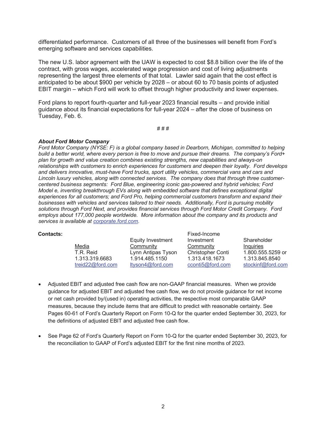 2 differentiated performance. Customers of all three of the businesses will benefit from Ford’s emerging software and services capabilities. The new U.S. labor agreement with the UAW is expected to cost $8.8 billion over the life of the contract, with gross wages, accelerated wage progression and cost of living adjustments representing the largest three elements of that total. Lawler said again that the cost effect is anticipated to be about $900 per vehicle by 2028 – or about 60 to 70 basis points of adjusted EBIT margin – which Ford will work to offset through higher productivity and lower expenses. Ford plans to report fourth-quarter and full-year 2023 financial results – and provide initial guidance about its financial expectations for full-year 2024 – after the close of business on Tuesday, Feb. 6. # # # About Ford Motor Company Ford Motor Company (NYSE: F) is a global company based in Dearborn, Michigan, committed to helping build a better world, where every person is free to move and pursue their dreams. The company’s Ford+ plan for growth and value creation combines existing strengths, new capabilities and always-on relationships with customers to enrich experiences for customers and deepen their loyalty. Ford develops and delivers innovative, must-have Ford trucks, sport utility vehicles, commercial vans and cars and Lincoln luxury vehicles, along with connected services. The company does that through three customer- centered business segments: Ford Blue, engineering iconic gas-powered and hybrid vehicles; Ford Model e, inventing breakthrough EVs along with embedded software that defines exceptional digital experiences for all customers; and Ford Pro, helping commercial customers transform and expand their businesses with vehicles and services tailored to their needs. Additionally, Ford is pursuing mobility solutions through Ford Next, and provides financial services through Ford Motor Credit Company. Ford employs about 177,000 people worldwide. More information about the company and its products and services is available at corporate.ford.com. Contacts: Fixed-Income Media T.R. Reid 1.313.319.6683 Equity Investment Community Lynn Antipas Tyson 1.914.485.1150 Investment Community Christopher Conti 1.313.418.1673 Shareholder Inquiries 1.800.555.5259 or 1.313.845.8540 treid22@ford.com ltyson4@ford.com cconti5@ford.com stockinf@ford.com · Adjusted EBIT and adjusted free cash flow are non-GAAP financial measures. When we provide guidance for adjusted EBIT and adjusted free cash flow, we do not provide guidance for net income or net cash provided by/(used in) operating activities, the respective most comparable GAAP measures, because they include items that are difficult to predict with reasonable certainty. See Pages 60-61 of Ford’s Quarterly Report on Form 10-Q for the quarter ended September 30, 2023, for the definitions of adjusted EBIT and adjusted free cash flow. · See Page 62 of Ford’s Quarterly Report on Form 10-Q for the quarter ended September 30, 2023, for the reconciliation to GAAP of Ford’s adjusted EBIT for the first nine months of 2023.