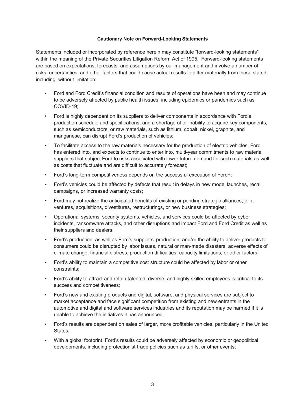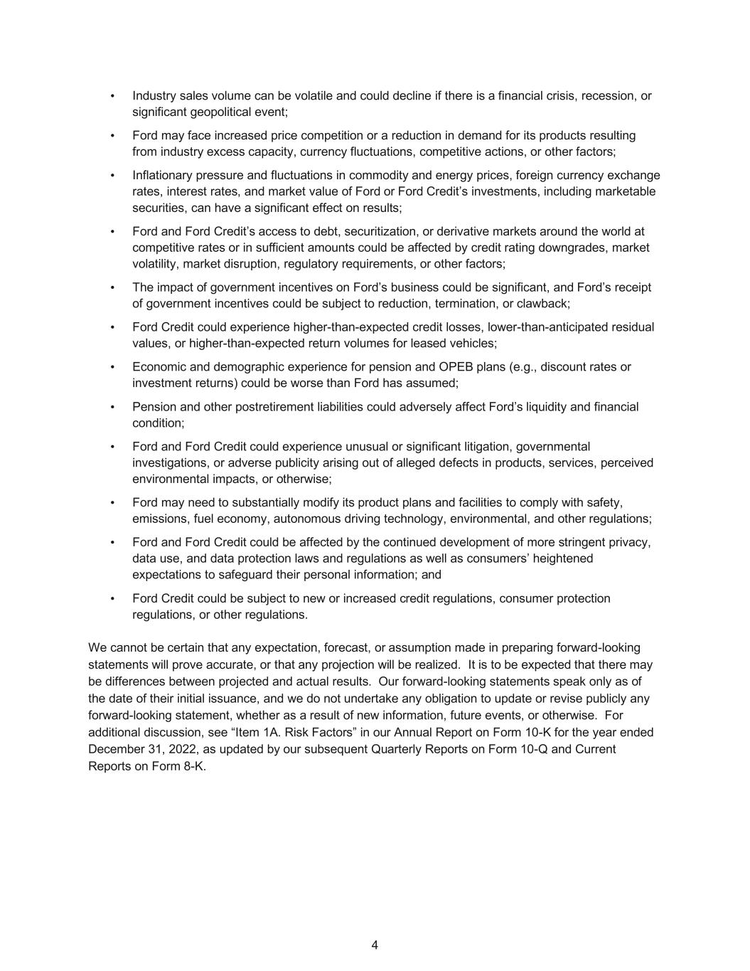 4 • Industry sales volume can be volatile and could decline if there is a financial crisis, recession, or significant geopolitical event; • Ford may face increased price competition or a reduction in demand for its products resulting from industry excess capacity, currency fluctuations, competitive actions, or other factors; • Inflationary pressure and fluctuations in commodity and energy prices, foreign currency exchange rates, interest rates, and market value of Ford or Ford Credit’s investments, including marketable securities, can have a significant effect on results; • Ford and Ford Credit’s access to debt, securitization, or derivative markets around the world at competitive rates or in sufficient amounts could be affected by credit rating downgrades, market volatility, market disruption, regulatory requirements, or other factors; • The impact of government incentives on Ford’s business could be significant, and Ford’s receipt of government incentives could be subject to reduction, termination, or clawback; • Ford Credit could experience higher-than-expected credit losses, lower-than-anticipated residual values, or higher-than-expected return volumes for leased vehicles; • Economic and demographic experience for pension and OPEB plans (e.g., discount rates or investment returns) could be worse than Ford has assumed; • Pension and other postretirement liabilities could adversely affect Ford’s liquidity and financial condition; • Ford and Ford Credit could experience unusual or significant litigation, governmental investigations, or adverse publicity arising out of alleged defects in products, services, perceived environmental impacts, or otherwise; • Ford may need to substantially modify its product plans and facilities to comply with safety, emissions, fuel economy, autonomous driving technology, environmental, and other regulations; • Ford and Ford Credit could be affected by the continued development of more stringent privacy, data use, and data protection laws and regulations as well as consumers’ heightened expectations to safeguard their personal information; and • Ford Credit could be subject to new or increased credit regulations, consumer protection regulations, or other regulations. We cannot be certain that any expectation, forecast, or assumption made in preparing forward-looking statements will prove accurate, or that any projection will be realized. It is to be expected that there may be differences between projected and actual results. Our forward-looking statements speak only as of the date of their initial issuance, and we do not undertake any obligation to update or revise publicly any forward-looking statement, whether as a result of new information, future events, or otherwise. For additional discussion, see “Item 1A. Risk Factors” in our Annual Report on Form 10-K for the year ended December 31, 2022, as updated by our subsequent Quarterly Reports on Form 10-Q and Current Reports on Form 8-K.