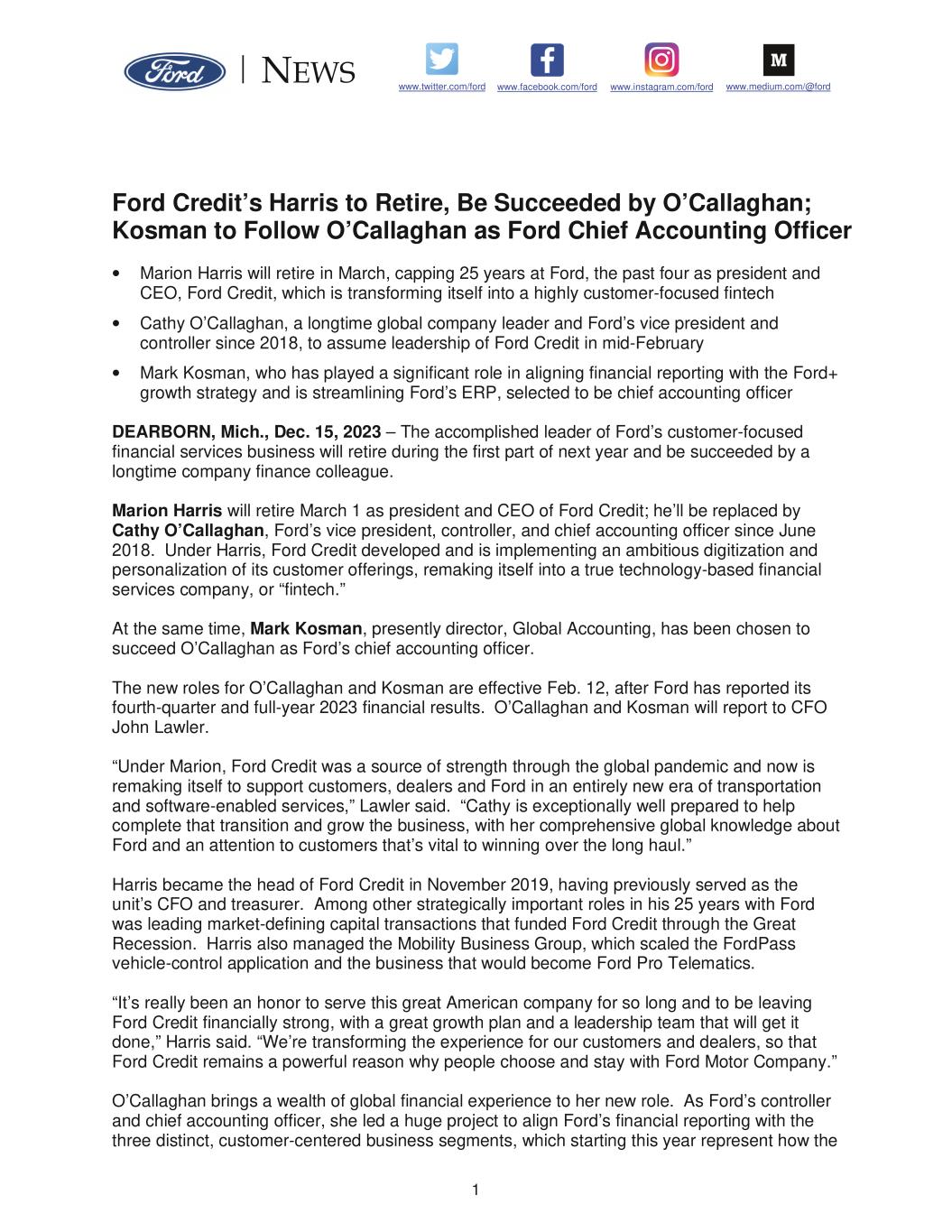 1 www.facebook.com/ford www.medium.com/@ford www.twitter.com/ford www.instagram.com/ford Ford Credit’s Harris to Retire, Be Succeeded by O’Callaghan; Kosman to Follow O’Callaghan as Ford Chief Accounting Officer • Marion Harris will retire in March, capping 25 years at Ford, the past four as president and CEO, Ford Credit, which is transforming itself into a highly customer-focused fintech • Cathy O’Callaghan, a longtime global company leader and Ford’s vice president and controller since 2018, to assume leadership of Ford Credit in mid-February • Mark Kosman, who has played a significant role in aligning financial reporting with the Ford+ growth strategy and is streamlining Ford’s ERP, selected to be chief accounting officer DEARBORN, Mich., Dec. 15, 2023 – The accomplished leader of Ford’s customer-focused financial services business will retire during the first part of next year and be succeeded by a longtime company finance colleague. Marion Harris will retire March 1 as president and CEO of Ford Credit; he’ll be replaced by Cathy O’Callaghan, Ford’s vice president, controller, and chief accounting officer since June 2018. Under Harris, Ford Credit developed and is implementing an ambitious digitization and personalization of its customer offerings, remaking itself into a true technology-based financial services company, or “fintech.” At the same time, Mark Kosman, presently director, Global Accounting, has been chosen to succeed O’Callaghan as Ford’s chief accounting officer. The new roles for O’Callaghan and Kosman are effective Feb. 12, after Ford has reported its fourth-quarter and full-year 2023 financial results. O’Callaghan and Kosman will report to CFO John Lawler. “Under Marion, Ford Credit was a source of strength through the global pandemic and now is remaking itself to support customers, dealers and Ford in an entirely new era of transportation and software-enabled services,” Lawler said. “Cathy is exceptionally well prepared to help complete that transition and grow the business, with her comprehensive global knowledge about Ford and an attention to customers that’s vital to winning over the long haul.” Harris became the head of Ford Credit in November 2019, having previously served as the unit’s CFO and treasurer. Among other strategically important roles in his 25 years with Ford was leading market-defining capital transactions that funded Ford Credit through the Great Recession. Harris also managed the Mobility Business Group, which scaled the FordPass vehicle-control application and the business that would become Ford Pro Telematics. “It’s really been an honor to serve this great American company for so long and to be leaving Ford Credit financially strong, with a great growth plan and a leadership team that will get it done,” Harris said. “We’re transforming the experience for our customers and dealers, so that Ford Credit remains a powerful reason why people choose and stay with Ford Motor Company.” O’Callaghan brings a wealth of global financial experience to her new role. As Ford’s controller and chief accounting officer, she led a huge project to align Ford’s financial reporting with the three distinct, customer-centered business segments, which starting this year represent how the