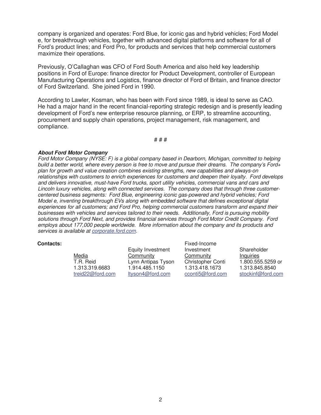 2 company is organized and operates: Ford Blue, for iconic gas and hybrid vehicles; Ford Model e, for breakthrough vehicles, together with advanced digital platforms and software for all of Ford’s product lines; and Ford Pro, for products and services that help commercial customers maximize their operations. Previously, O’Callaghan was CFO of Ford South America and also held key leadership positions in Ford of Europe: finance director for Product Development, controller of European Manufacturing Operations and Logistics, finance director of Ford of Britain, and finance director of Ford Switzerland. She joined Ford in 1990. According to Lawler, Kosman, who has been with Ford since 1989, is ideal to serve as CAO. He had a major hand in the recent financial-reporting strategic redesign and is presently leading development of Ford’s new enterprise resource planning, or ERP, to streamline accounting, procurement and supply chain operations, project management, risk management, and compliance. # # # About Ford Motor Company Ford Motor Company (NYSE: F) is a global company based in Dearborn, Michigan, committed to helping build a better world, where every person is free to move and pursue their dreams. The company’s Ford+ plan for growth and value creation combines existing strengths, new capabilities and always-on relationships with customers to enrich experiences for customers and deepen their loyalty. Ford develops and delivers innovative, must-have Ford trucks, sport utility vehicles, commercial vans and cars and Lincoln luxury vehicles, along with connected services. The company does that through three customer- centered business segments: Ford Blue, engineering iconic gas-powered and hybrid vehicles; Ford Model e, inventing breakthrough EVs along with embedded software that defines exceptional digital experiences for all customers; and Ford Pro, helping commercial customers transform and expand their businesses with vehicles and services tailored to their needs. Additionally, Ford is pursuing mobility solutions through Ford Next, and provides financial services through Ford Motor Credit Company. Ford employs about 177,000 people worldwide. More information about the company and its products and services is available at corporate.ford.com. Contacts: Fixed-Income Media T.R. Reid 1.313.319.6683 Equity Investment Community Lynn Antipas Tyson 1.914.485.1150 Investment Community Christopher Conti 1.313.418.1673 Shareholder Inquiries 1.800.555.5259 or 1.313.845.8540 treid22@ford.com ltyson4@ford.com cconti5@ford.com stockinf@ford.com