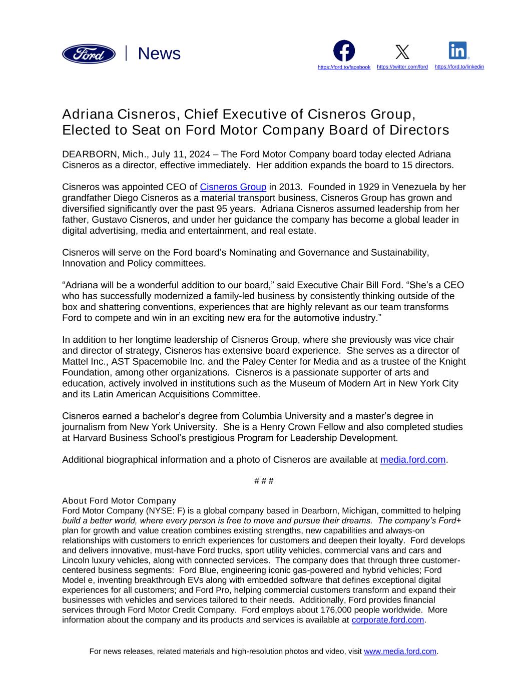 For news releases, related materials and high-resolution photos and video, visit www.media.ford.com. https://twitter.com/ford https://ford.to/facebook https://ford.to/linkedin News Adriana Cisneros, Chief Executive of Cisneros Group, Elected to Seat on Ford Motor Company Board of Directors DEARBORN, Mich., July 11, 2024 – The Ford Motor Company board today elected Adriana Cisneros as a director, effective immediately. Her addition expands the board to 15 directors. Cisneros was appointed CEO of Cisneros Group in 2013. Founded in 1929 in Venezuela by her grandfather Diego Cisneros as a material transport business, Cisneros Group has grown and diversified significantly over the past 95 years. Adriana Cisneros assumed leadership from her father, Gustavo Cisneros, and under her guidance the company has become a global leader in digital advertising, media and entertainment, and real estate. Cisneros will serve on the Ford board’s Nominating and Governance and Sustainability, Innovation and Policy committees. “Adriana will be a wonderful addition to our board,” said Executive Chair Bill Ford. “She’s a CEO who has successfully modernized a family-led business by consistently thinking outside of the box and shattering conventions, experiences that are highly relevant as our team transforms Ford to compete and win in an exciting new era for the automotive industry.” In addition to her longtime leadership of Cisneros Group, where she previously was vice chair and director of strategy, Cisneros has extensive board experience. She serves as a director of Mattel Inc., AST Spacemobile Inc. and the Paley Center for Media and as a trustee of the Knight Foundation, among other organizations. Cisneros is a passionate supporter of arts and education, actively involved in institutions such as the Museum of Modern Art in New York City and its Latin American Acquisitions Committee. Cisneros earned a bachelor’s degree from Columbia University and a master’s degree in journalism from New York University. She is a Henry Crown Fellow and also completed studies at Harvard Business School’s prestigious Program for Leadership Development. Additional biographical information and a photo of Cisneros are available at media.ford.com. # # # About Ford Motor Company Ford Motor Company (NYSE: F) is a global company based in Dearborn, Michigan, committed to helping build a better world, where every person is free to move and pursue their dreams. The company’s Ford+ plan for growth and value creation combines existing strengths, new capabilities and always-on relationships with customers to enrich experiences for customers and deepen their loyalty. Ford develops and delivers innovative, must-have Ford trucks, sport utility vehicles, commercial vans and cars and Lincoln luxury vehicles, along with connected services. The company does that through three customer- centered business segments: Ford Blue, engineering iconic gas-powered and hybrid vehicles; Ford Model e, inventing breakthrough EVs along with embedded software that defines exceptional digital experiences for all customers; and Ford Pro, helping commercial customers transform and expand their businesses with vehicles and services tailored to their needs. Additionally, Ford provides financial services through Ford Motor Credit Company. Ford employs about 176,000 people worldwide. More information about the company and its products and services is available at corporate.ford.com.