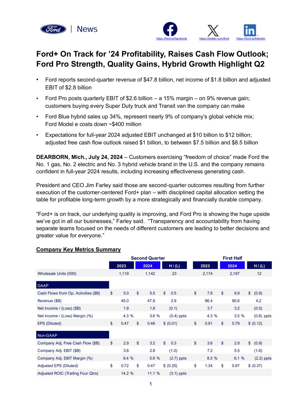 1 https://ford.to/facebook https://twitter.com/ford https://ford.to/linkedin Ford+ On Track for ’24 Profitability, Raises Cash Flow Outlook; Ford Pro Strength, Quality Gains, Hybrid Growth Highlight Q2 • Ford reports second-quarter revenue of $47.8 billion, net income of $1.8 billion and adjusted EBIT of $2.8 billion • Ford Pro posts quarterly EBIT of $2.6 billion – a 15% margin – on 9% revenue gain; customers buying every Super Duty truck and Transit van the company can make • Ford Blue hybrid sales up 34%, represent nearly 9% of company’s global vehicle mix; Ford Model e costs down ~$400 million • Expectations for full-year 2024 adjusted EBIT unchanged at $10 billion to $12 billion; adjusted free cash flow outlook raised $1 billion, to between $7.5 billion and $8.5 billion DEARBORN, Mich., July 24, 2024 – Customers exercising “freedom of choice” made Ford the No. 1 gas, No. 2 electric and No. 3 hybrid vehicle brand in the U.S. and the company remains confident in full-year 2024 results, including increasing effectiveness generating cash. President and CEO Jim Farley said those are second-quarter outcomes resulting from further execution of the customer-centered Ford+ plan – with disciplined capital allocation setting the table for profitable long-term growth by a more strategically and financially durable company. “Ford+ is on track, our underlying quality is improving, and Ford Pro is showing the huge upside we’ve got in all our businesses,” Farley said. “Transparency and accountability from having separate teams focused on the needs of different customers are leading to better decisions and greater value for everyone.” Company Key Metrics Summary Second Quarter First Half 2023 2024 H / (L) 2023 2024 H / (L) Wholesale Units (000) 1,119 1,142 23 2,174 2,187 12 GAAP Cash Flows from Op. Activities ($B) $ 5.0 $ 5.5 $ 0.5 $ 7.8 $ 6.9 $ (0.9) Revenue ($B) 45.0 47.8 2.9 86.4 90.6 4.2 Net Income / (Loss) ($B) 1.9 1.8 (0.1) 3.7 3.2 (0.5) Net Income / (Loss) Margin (%) 4.3 % 3.8 % (0.4) ppts 4.3 % 3.5 % (0.8) ppts EPS (Diluted) $ 0.47 $ 0.46 $ (0.01) $ 0.91 $ 0.79 $ (0.12) Non-GAAP Company Adj. Free Cash Flow ($B) $ 2.9 $ 3.2 $ 0.3 $ 3.6 $ 2.8 $ (0.9) Company Adj. EBIT ($B) 3.8 2.8 (1.0) 7.2 5.5 (1.6) Company Adj. EBIT Margin (%) 8.4 % 5.8 % (2.7) ppts 8.3 % 6.1 % (2.2) ppts Adjusted EPS (Diluted) $ 0.72 $ 0.47 $ (0.25) $ 1.34 $ 0.97 $ (0.37) Adjusted ROIC (Trailing Four Qtrs) 14.2 % 11.1 % (3.1) ppts
