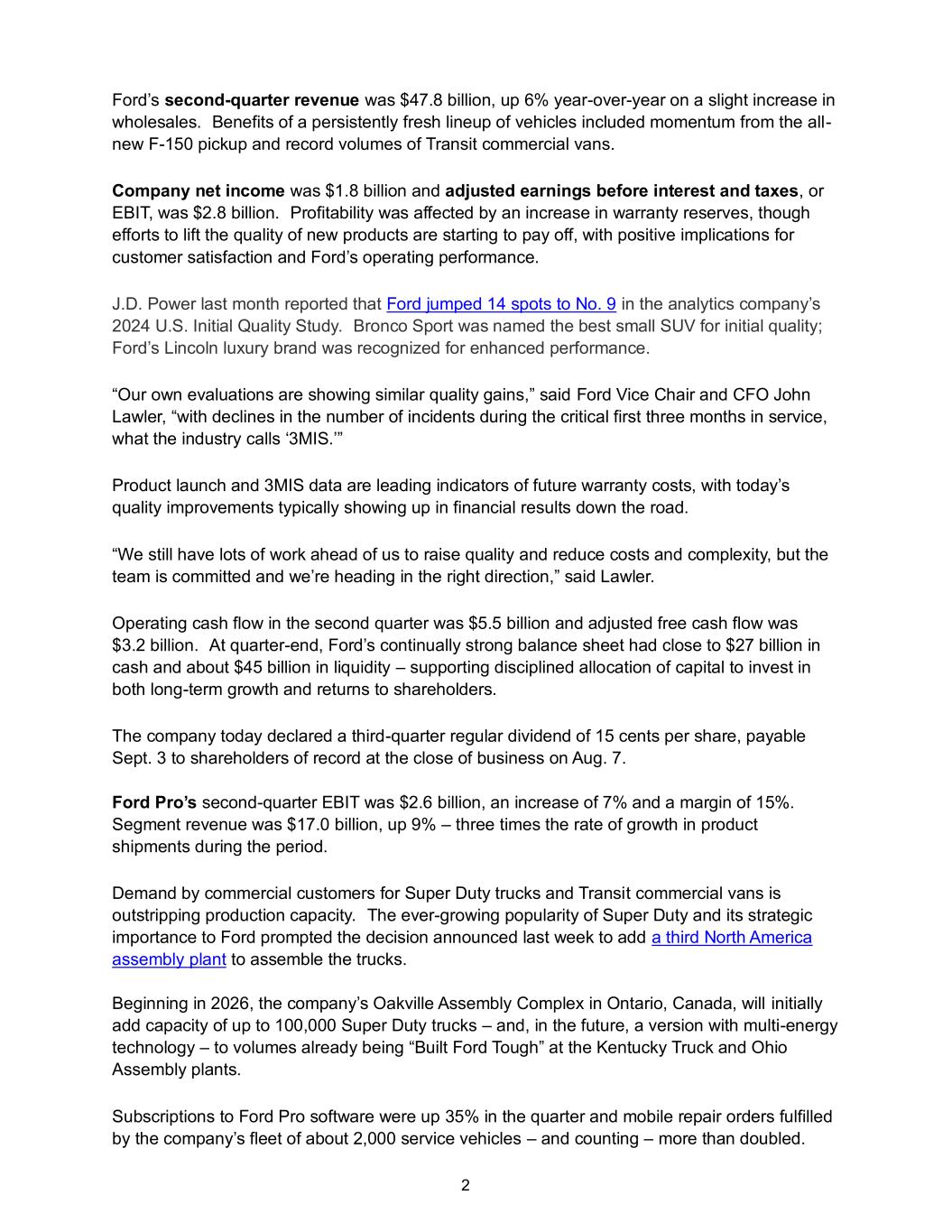2 Ford’s second-quarter revenue was $47.8 billion, up 6% year-over-year on a slight increase in wholesales. Benefits of a persistently fresh lineup of vehicles included momentum from the all- new F-150 pickup and record volumes of Transit commercial vans. Company net income was $1.8 billion and adjusted earnings before interest and taxes, or EBIT, was $2.8 billion. Profitability was affected by an increase in warranty reserves, though efforts to lift the quality of new products are starting to pay off, with positive implications for customer satisfaction and Ford’s operating performance. J.D. Power last month reported that Ford jumped 14 spots to No. 9 in the analytics company’s 2024 U.S. Initial Quality Study. Bronco Sport was named the best small SUV for initial quality; Ford’s Lincoln luxury brand was recognized for enhanced performance. “Our own evaluations are showing similar quality gains,” said Ford Vice Chair and CFO John Lawler, “with declines in the number of incidents during the critical first three months in service, what the industry calls ‘3MIS.’” Product launch and 3MIS data are leading indicators of future warranty costs, with today’s quality improvements typically showing up in financial results down the road. “We still have lots of work ahead of us to raise quality and reduce costs and complexity, but the team is committed and we’re heading in the right direction,” said Lawler. Operating cash flow in the second quarter was $5.5 billion and adjusted free cash flow was $3.2 billion. At quarter-end, Ford’s continually strong balance sheet had close to $27 billion in cash and about $45 billion in liquidity – supporting disciplined allocation of capital to invest in both long-term growth and returns to shareholders. The company today declared a third-quarter regular dividend of 15 cents per share, payable Sept. 3 to shareholders of record at the close of business on Aug. 7. Ford Pro’s second-quarter EBIT was $2.6 billion, an increase of 7% and a margin of 15%. Segment revenue was $17.0 billion, up 9% – three times the rate of growth in product shipments during the period. Demand by commercial customers for Super Duty trucks and Transit commercial vans is outstripping production capacity. The ever-growing popularity of Super Duty and its strategic importance to Ford prompted the decision announced last week to add a third North America assembly plant to assemble the trucks. Beginning in 2026, the company’s Oakville Assembly Complex in Ontario, Canada, will initially add capacity of up to 100,000 Super Duty trucks – and, in the future, a version with multi-energy technology – to volumes already being “Built Ford Tough” at the Kentucky Truck and Ohio Assembly plants. Subscriptions to Ford Pro software were up 35% in the quarter and mobile repair orders fulfilled by the company’s fleet of about 2,000 service vehicles – and counting – more than doubled.
