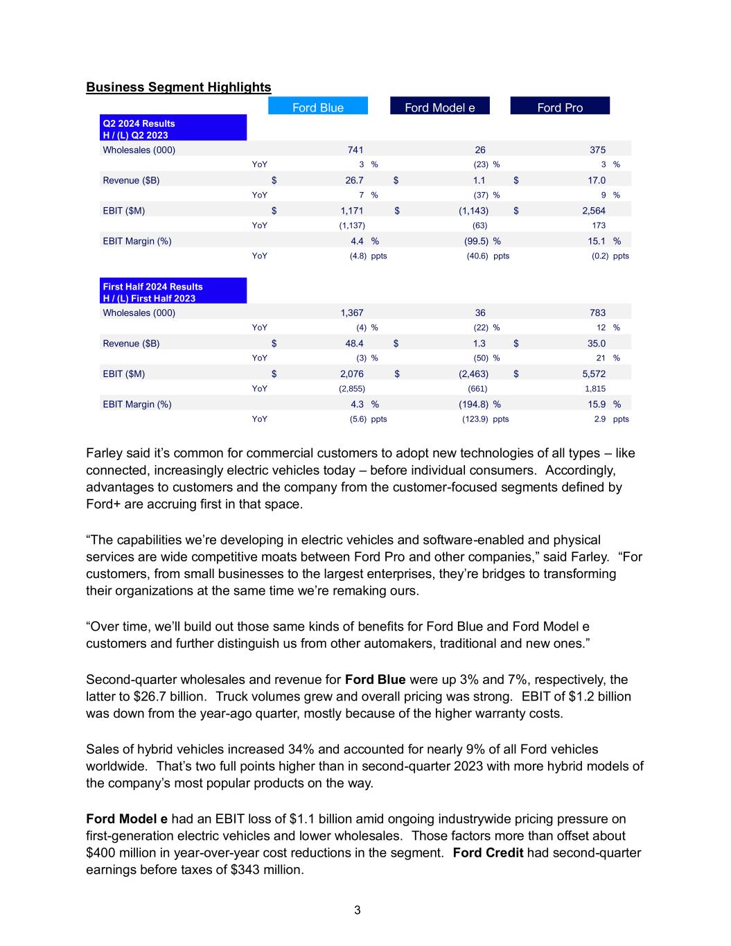 3 Business Segment Highlights Ford Blue Ford Model e Ford Pro Q2 2024 Results H / (L) Q2 2023 Wholesales (000) 741 26 375 YoY 3 % (23) % 3 % Revenue ($B) $ 26.7 $ 1.1 $ 17.0 YoY 7 % (37) % 9 % EBIT ($M) $ 1,171 $ (1,143) $ 2,564 YoY (1,137) (63) 173 EBIT Margin (%) 4.4 % (99.5) % 15.1 % YoY (4.8) ppts (40.6) ppts (0.2) ppts First Half 2024 Results H / (L) First Half 2023 Wholesales (000) 1,367 36 783 YoY (4) % (22) % 12 % Revenue ($B) $ 48.4 $ 1.3 $ 35.0 YoY (3) % (50) % 21 % EBIT ($M) $ 2,076 $ (2,463) $ 5,572 YoY (2,855) (661) 1,815 EBIT Margin (%) 4.3 % (194.8) % 15.9 % YoY (5.6) ppts (123.9) ppts 2.9 ppts Farley said it’s common for commercial customers to adopt new technologies of all types – like connected, increasingly electric vehicles today – before individual consumers. Accordingly, advantages to customers and the company from the customer-focused segments defined by Ford+ are accruing first in that space. “The capabilities we’re developing in electric vehicles and software-enabled and physical services are wide competitive moats between Ford Pro and other companies,” said Farley. “For customers, from small businesses to the largest enterprises, they’re bridges to transforming their organizations at the same time we’re remaking ours. “Over time, we’ll build out those same kinds of benefits for Ford Blue and Ford Model e customers and further distinguish us from other automakers, traditional and new ones.” Second-quarter wholesales and revenue for Ford Blue were up 3% and 7%, respectively, the latter to $26.7 billion. Truck volumes grew and overall pricing was strong. EBIT of $1.2 billion was down from the year-ago quarter, mostly because of the higher warranty costs. Sales of hybrid vehicles increased 34% and accounted for nearly 9% of all Ford vehicles worldwide. That’s two full points higher than in second-quarter 2023 with more hybrid models of the company’s most popular products on the way. Ford Model e had an EBIT loss of $1.1 billion amid ongoing industrywide pricing pressure on first-generation electric vehicles and lower wholesales. Those factors more than offset about $400 million in year-over-year cost reductions in the segment. Ford Credit had second-quarter earnings before taxes of $343 million.