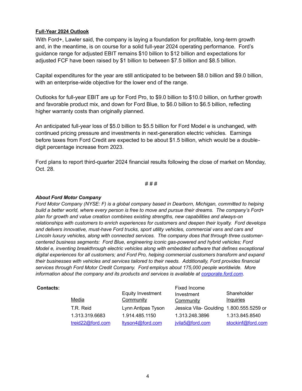 4 Full-Year 2024 Outlook With Ford+, Lawler said, the company is laying a foundation for profitable, long-term growth and, in the meantime, is on course for a solid full-year 2024 operating performance. Ford’s guidance range for adjusted EBIT remains $10 billion to $12 billion and expectations for adjusted FCF have been raised by $1 billion to between $7.5 billion and $8.5 billion. Capital expenditures for the year are still anticipated to be between $8.0 billion and $9.0 billion, with an enterprise-wide objective for the lower end of the range. Outlooks for full-year EBIT are up for Ford Pro, to $9.0 billion to $10.0 billion, on further growth and favorable product mix, and down for Ford Blue, to $6.0 billion to $6.5 billion, reflecting higher warranty costs than originally planned. An anticipated full-year loss of $5.0 billion to $5.5 billion for Ford Model e is unchanged, with continued pricing pressure and investments in next-generation electric vehicles. Earnings before taxes from Ford Credit are expected to be about $1.5 billion, which would be a double- digit percentage increase from 2023. Ford plans to report third-quarter 2024 financial results following the close of market on Monday, Oct. 28. # # # About Ford Motor Company Ford Motor Company (NYSE: F) is a global company based in Dearborn, Michigan, committed to helping build a better world, where every person is free to move and pursue their dreams. The company’s Ford+ plan for growth and value creation combines existing strengths, new capabilities and always-on relationships with customers to enrich experiences for customers and deepen their loyalty. Ford develops and delivers innovative, must-have Ford trucks, sport utility vehicles, commercial vans and cars and Lincoln luxury vehicles, along with connected services. The company does that through three customer- centered business segments: Ford Blue, engineering iconic gas-powered and hybrid vehicles; Ford Model e, inventing breakthrough electric vehicles along with embedded software that defines exceptional digital experiences for all customers; and Ford Pro, helping commercial customers transform and expand their businesses with vehicles and services tailored to their needs. Additionally, Ford provides financial services through Ford Motor Credit Company. Ford employs about 175,000 people worldwide. More information about the company and its products and services is available at corporate.ford.com. Contacts: Media Equity Investment Community Fixed Income Investment Community Shareholder Inquiries T.R. Reid Lynn Antipas Tyson Jessica Vila- Goulding 1.800.555.5259 or 1.313.319.6683 1.914.485.1150 1.313.248.3896 1.313.845.8540 treid22@ford.com ltyson4@ford.com jvila5@ford.com stockinf@ford.com