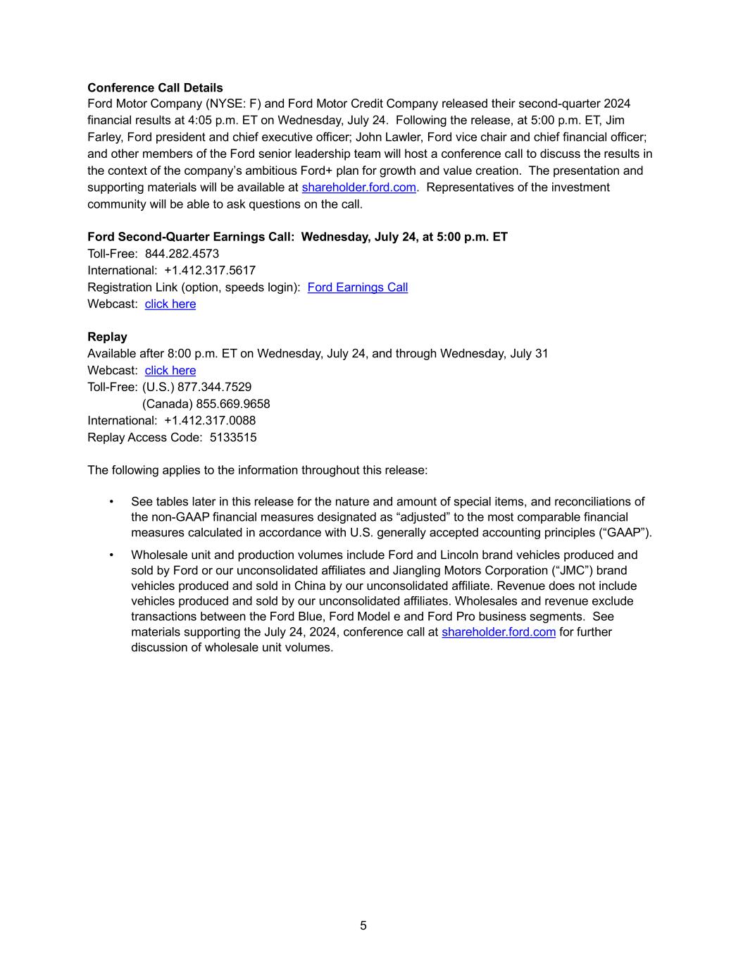 5 Conference Call Details Ford Motor Company (NYSE: F) and Ford Motor Credit Company released their second-quarter 2024 financial results at 4:05 p.m. ET on Wednesday, July 24. Following the release, at 5:00 p.m. ET, Jim Farley, Ford president and chief executive officer; John Lawler, Ford vice chair and chief financial officer; and other members of the Ford senior leadership team will host a conference call to discuss the results in the context of the company’s ambitious Ford+ plan for growth and value creation. The presentation and supporting materials will be available at shareholder.ford.com. Representatives of the investment community will be able to ask questions on the call. Ford Second-Quarter Earnings Call: Wednesday, July 24, at 5:00 p.m. ET Toll-Free: 844.282.4573 International: +1.412.317.5617 Registration Link (option, speeds login): Ford Earnings Call Webcast: click here Replay Available after 8:00 p.m. ET on Wednesday, July 24, and through Wednesday, July 31 Webcast: click here Toll-Free: (U.S.) 877.344.7529 (Canada) 855.669.9658 International: +1.412.317.0088 Replay Access Code: 5133515 The following applies to the information throughout this release: • See tables later in this release for the nature and amount of special items, and reconciliations of the non-GAAP financial measures designated as “adjusted” to the most comparable financial measures calculated in accordance with U.S. generally accepted accounting principles (“GAAP”). • Wholesale unit and production volumes include Ford and Lincoln brand vehicles produced and sold by Ford or our unconsolidated affiliates and Jiangling Motors Corporation (“JMC”) brand vehicles produced and sold in China by our unconsolidated affiliate. Revenue does not include vehicles produced and sold by our unconsolidated affiliates. Wholesales and revenue exclude transactions between the Ford Blue, Ford Model e and Ford Pro business segments. See materials supporting the July 24, 2024, conference call at shareholder.ford.com for further discussion of wholesale unit volumes.