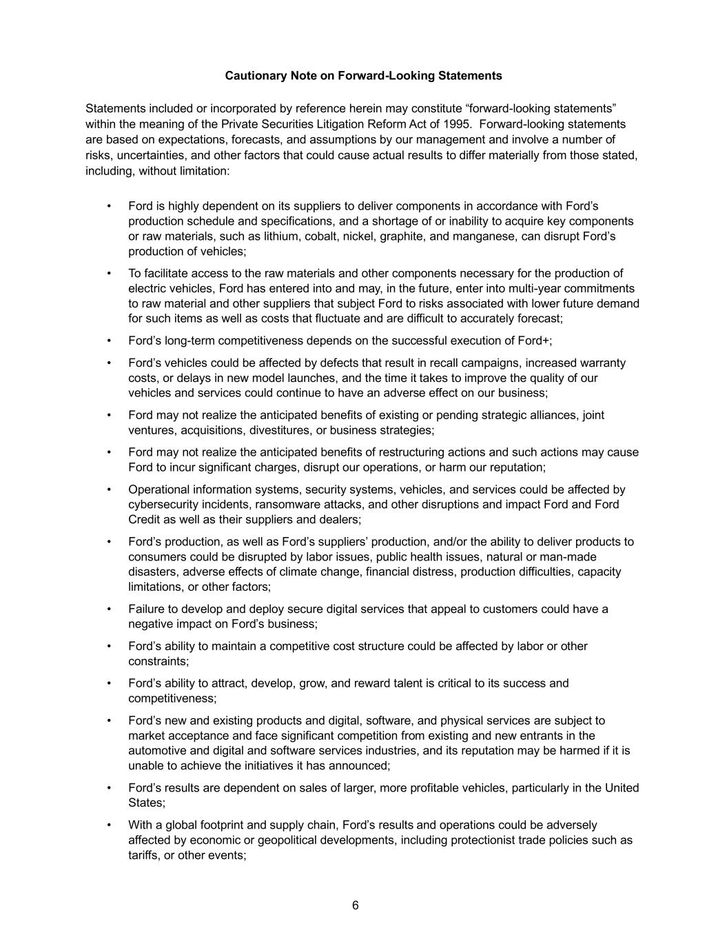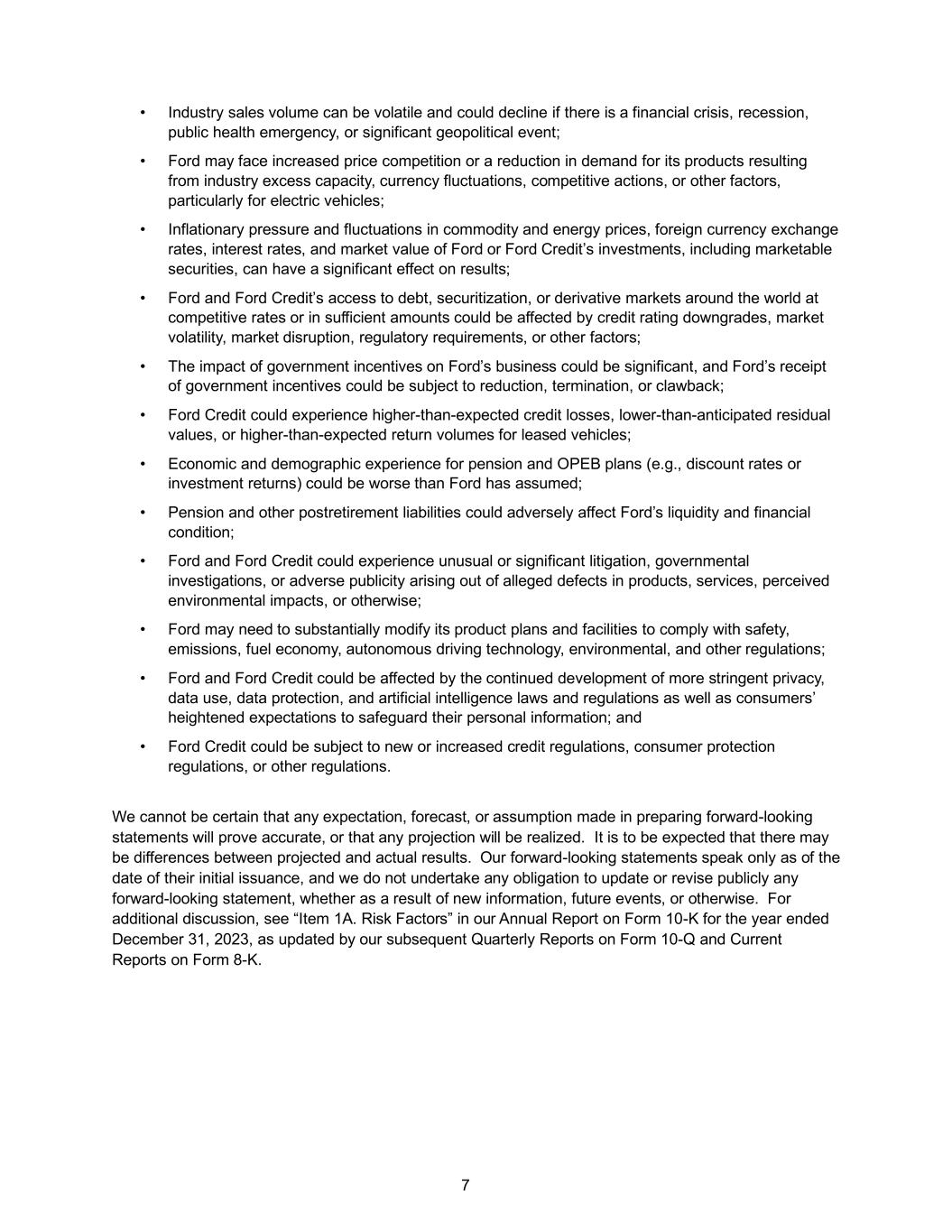 7 • Industry sales volume can be volatile and could decline if there is a financial crisis, recession, public health emergency, or significant geopolitical event; • Ford may face increased price competition or a reduction in demand for its products resulting from industry excess capacity, currency fluctuations, competitive actions, or other factors, particularly for electric vehicles; • Inflationary pressure and fluctuations in commodity and energy prices, foreign currency exchange rates, interest rates, and market value of Ford or Ford Credit’s investments, including marketable securities, can have a significant effect on results; • Ford and Ford Credit’s access to debt, securitization, or derivative markets around the world at competitive rates or in sufficient amounts could be affected by credit rating downgrades, market volatility, market disruption, regulatory requirements, or other factors; • The impact of government incentives on Ford’s business could be significant, and Ford’s receipt of government incentives could be subject to reduction, termination, or clawback; • Ford Credit could experience higher-than-expected credit losses, lower-than-anticipated residual values, or higher-than-expected return volumes for leased vehicles; • Economic and demographic experience for pension and OPEB plans (e.g., discount rates or investment returns) could be worse than Ford has assumed; • Pension and other postretirement liabilities could adversely affect Ford’s liquidity and financial condition; • Ford and Ford Credit could experience unusual or significant litigation, governmental investigations, or adverse publicity arising out of alleged defects in products, services, perceived environmental impacts, or otherwise; • Ford may need to substantially modify its product plans and facilities to comply with safety, emissions, fuel economy, autonomous driving technology, environmental, and other regulations; • Ford and Ford Credit could be affected by the continued development of more stringent privacy, data use, data protection, and artificial intelligence laws and regulations as well as consumers’ heightened expectations to safeguard their personal information; and • Ford Credit could be subject to new or increased credit regulations, consumer protection regulations, or other regulations. We cannot be certain that any expectation, forecast, or assumption made in preparing forward-looking statements will prove accurate, or that any projection will be realized. It is to be expected that there may be differences between projected and actual results. Our forward-looking statements speak only as of the date of their initial issuance, and we do not undertake any obligation to update or revise publicly any forward-looking statement, whether as a result of new information, future events, or otherwise. For additional discussion, see “Item 1A. Risk Factors” in our Annual Report on Form 10-K for the year ended December 31, 2023, as updated by our subsequent Quarterly Reports on Form 10-Q and Current Reports on Form 8-K.