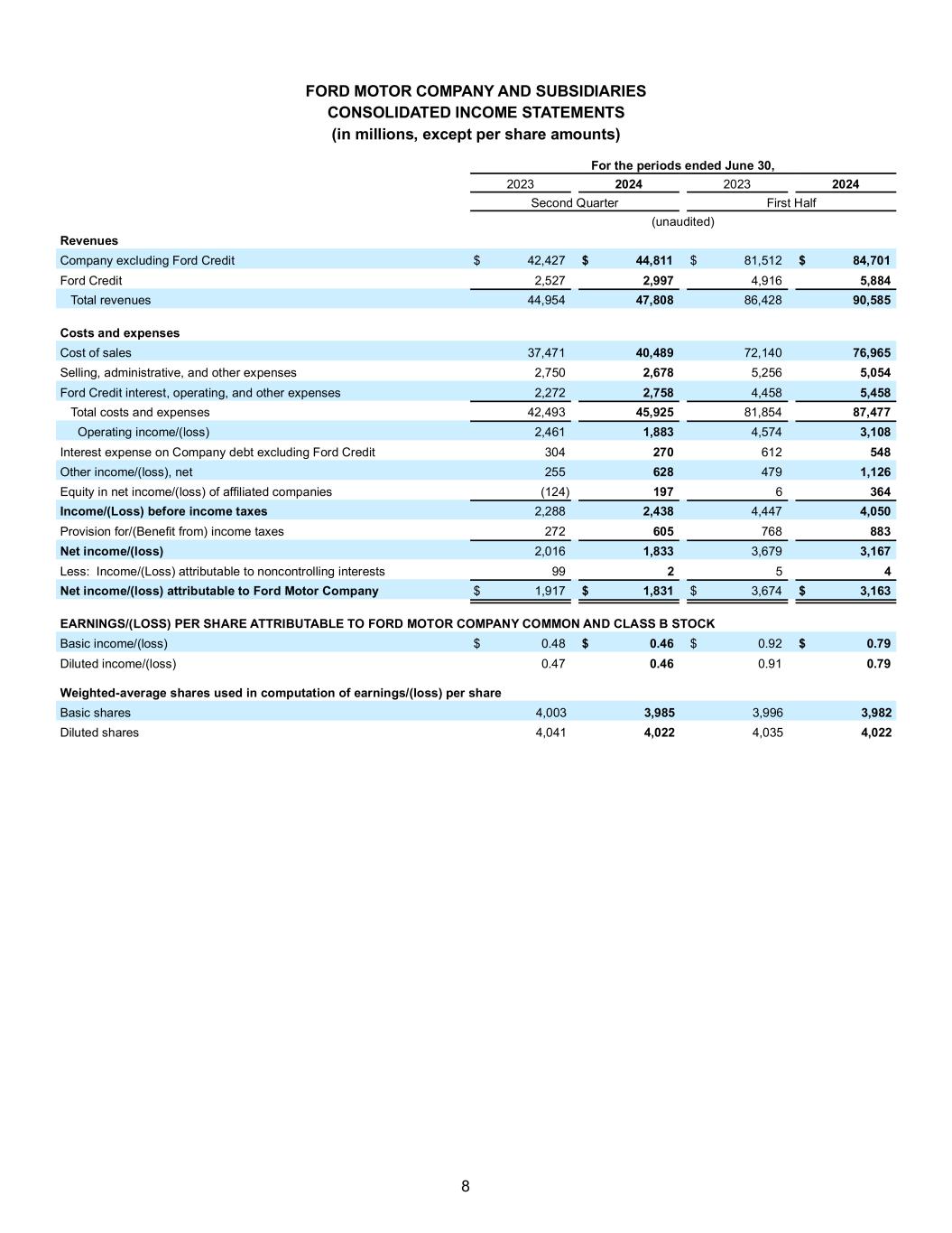 8 FORD MOTOR COMPANY AND SUBSIDIARIES CONSOLIDATED INCOME STATEMENTS (in millions, except per share amounts) For the periods ended June 30, 2023 2024 2023 2024 Second Quarter First Half (unaudited) Revenues Company excluding Ford Credit $ 42,427 $ 44,811 $ 81,512 $ 84,701 Ford Credit 2,527 2,997 4,916 5,884 Total revenues 44,954 47,808 86,428 90,585 Costs and expenses Cost of sales 37,471 40,489 72,140 76,965 Selling, administrative, and other expenses 2,750 2,678 5,256 5,054 Ford Credit interest, operating, and other expenses 2,272 2,758 4,458 5,458 Total costs and expenses 42,493 45,925 81,854 87,477 Operating income/(loss) 2,461 1,883 4,574 3,108 Interest expense on Company debt excluding Ford Credit 304 270 612 548 Other income/(loss), net 255 628 479 1,126 Equity in net income/(loss) of affiliated companies (124) 197 6 364 Income/(Loss) before income taxes 2,288 2,438 4,447 4,050 Provision for/(Benefit from) income taxes 272 605 768 883 Net income/(loss) 2,016 1,833 3,679 3,167 Less: Income/(Loss) attributable to noncontrolling interests 99 2 5 4 Net income/(loss) attributable to Ford Motor Company $ 1,917 $ 1,831 $ 3,674 $ 3,163 EARNINGS/(LOSS) PER SHARE ATTRIBUTABLE TO FORD MOTOR COMPANY COMMON AND CLASS B STOCK Basic income/(loss) $ 0.48 $ 0.46 $ 0.92 $ 0.79 Diluted income/(loss) 0.47 0.46 0.91 0.79 Weighted-average shares used in computation of earnings/(loss) per share Basic shares 4,003 3,985 3,996 3,982 Diluted shares 4,041 4,022 4,035 4,022