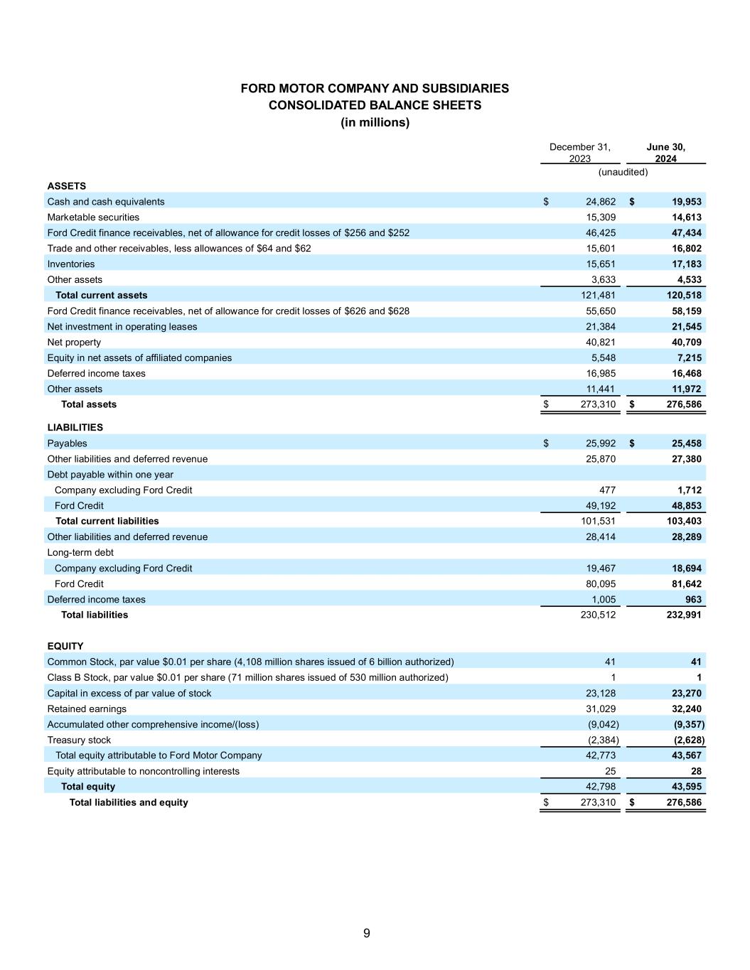 9 FORD MOTOR COMPANY AND SUBSIDIARIES CONSOLIDATED BALANCE SHEETS (in millions) December 31, 2023 June 30, 2024 (unaudited) ASSETS Cash and cash equivalents $ 24,862 $ 19,953 Marketable securities 15,309 14,613 Ford Credit finance receivables, net of allowance for credit losses of $256 and $252 46,425 47,434 Trade and other receivables, less allowances of $64 and $62 15,601 16,802 Inventories 15,651 17,183 Other assets 3,633 4,533 Total current assets 121,481 120,518 Ford Credit finance receivables, net of allowance for credit losses of $626 and $628 55,650 58,159 Net investment in operating leases 21,384 21,545 Net property 40,821 40,709 Equity in net assets of affiliated companies 5,548 7,215 Deferred income taxes 16,985 16,468 Other assets 11,441 11,972 Total assets $ 273,310 $ 276,586 LIABILITIES Payables $ 25,992 $ 25,458 Other liabilities and deferred revenue 25,870 27,380 Debt payable within one year Company excluding Ford Credit 477 1,712 Ford Credit 49,192 48,853 Total current liabilities 101,531 103,403 Other liabilities and deferred revenue 28,414 28,289 Long-term debt Company excluding Ford Credit 19,467 18,694 Ford Credit 80,095 81,642 Deferred income taxes 1,005 963 Total liabilities 230,512 232,991 EQUITY Common Stock, par value $0.01 per share (4,108 million shares issued of 6 billion authorized) 41 41 Class B Stock, par value $0.01 per share (71 million shares issued of 530 million authorized) 1 1 Capital in excess of par value of stock 23,128 23,270 Retained earnings 31,029 32,240 Accumulated other comprehensive income/(loss) (9,042) (9,357) Treasury stock (2,384) (2,628) Total equity attributable to Ford Motor Company 42,773 43,567 Equity attributable to noncontrolling interests 25 28 Total equity 42,798 43,595 Total liabilities and equity $ 273,310 $ 276,586