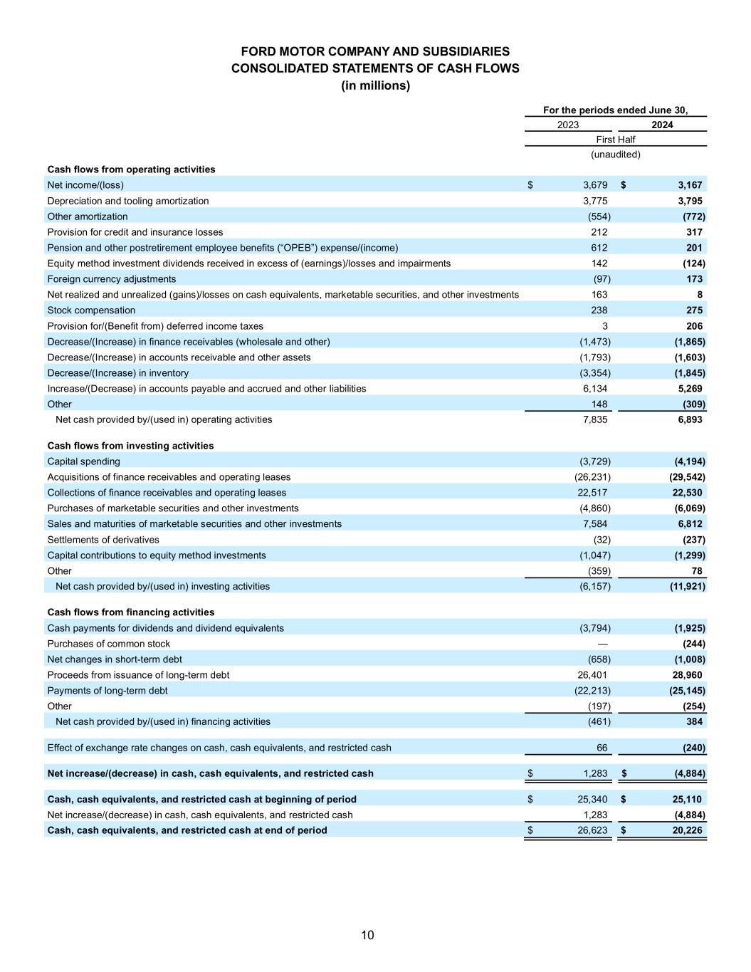 10 FORD MOTOR COMPANY AND SUBSIDIARIES CONSOLIDATED STATEMENTS OF CASH FLOWS (in millions) For the periods ended June 30, 2023 2024 First Half (unaudited) Cash flows from operating activities Net income/(loss) $ 3,679 $ 3,167 Depreciation and tooling amortization 3,775 3,795 Other amortization (554) (772) Provision for credit and insurance losses 212 317 Pension and other postretirement employee benefits (“OPEB”) expense/(income) 612 201 Equity method investment dividends received in excess of (earnings)/losses and impairments 142 (124) Foreign currency adjustments (97) 173 Net realized and unrealized (gains)/losses on cash equivalents, marketable securities, and other investments 163 8 Stock compensation 238 275 Provision for/(Benefit from) deferred income taxes 3 206 Decrease/(Increase) in finance receivables (wholesale and other) (1,473) (1,865) Decrease/(Increase) in accounts receivable and other assets (1,793) (1,603) Decrease/(Increase) in inventory (3,354) (1,845) Increase/(Decrease) in accounts payable and accrued and other liabilities 6,134 5,269 Other 148 (309) Net cash provided by/(used in) operating activities 7,835 6,893 Cash flows from investing activities Capital spending (3,729) (4,194) Acquisitions of finance receivables and operating leases (26,231) (29,542) Collections of finance receivables and operating leases 22,517 22,530 Purchases of marketable securities and other investments (4,860) (6,069) Sales and maturities of marketable securities and other investments 7,584 6,812 Settlements of derivatives (32) (237) Capital contributions to equity method investments (1,047) (1,299) Other (359) 78 Net cash provided by/(used in) investing activities (6,157) (11,921) Cash flows from financing activities Cash payments for dividends and dividend equivalents (3,794) (1,925) Purchases of common stock — (244) Net changes in short-term debt (658) (1,008) Proceeds from issuance of long-term debt 26,401 28,960 Payments of long-term debt (22,213) (25,145) Other (197) (254) Net cash provided by/(used in) financing activities (461) 384 Effect of exchange rate changes on cash, cash equivalents, and restricted cash 66 (240) Net increase/(decrease) in cash, cash equivalents, and restricted cash $ 1,283 $ (4,884) Cash, cash equivalents, and restricted cash at beginning of period $ 25,340 $ 25,110 Net increase/(decrease) in cash, cash equivalents, and restricted cash 1,283 (4,884) Cash, cash equivalents, and restricted cash at end of period $ 26,623 $ 20,226