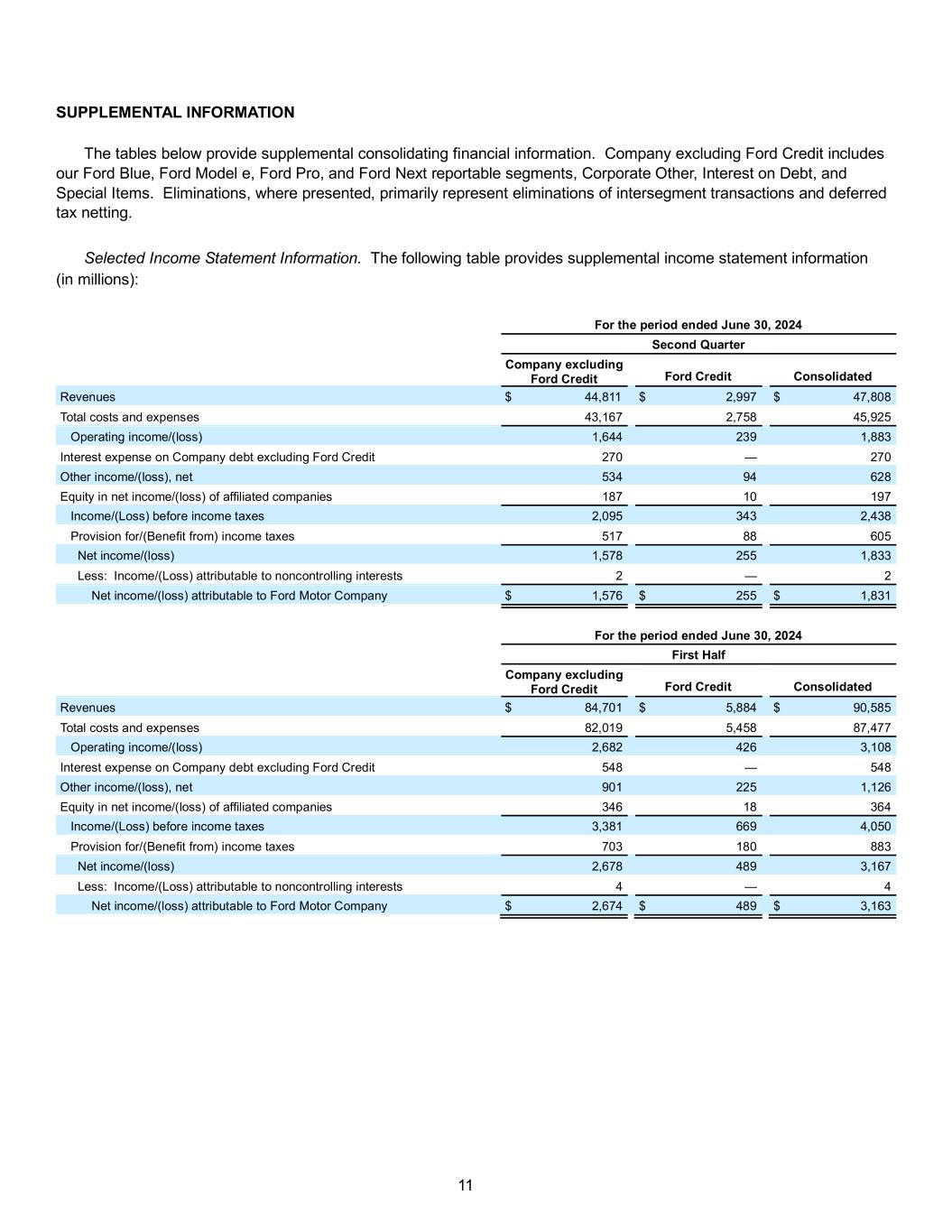 11 SUPPLEMENTAL INFORMATION The tables below provide supplemental consolidating financial information. Company excluding Ford Credit includes our Ford Blue, Ford Model e, Ford Pro, and Ford Next reportable segments, Corporate Other, Interest on Debt, and Special Items. Eliminations, where presented, primarily represent eliminations of intersegment transactions and deferred tax netting. Selected Income Statement Information. The following table provides supplemental income statement information (in millions): For the period ended June 30, 2024 Second Quarter Company excluding Ford Credit Ford Credit Consolidated Revenues $ 44,811 $ 2,997 $ 47,808 Total costs and expenses 43,167 2,758 45,925 Operating income/(loss) 1,644 239 1,883 Interest expense on Company debt excluding Ford Credit 270 — 270 Other income/(loss), net 534 94 628 Equity in net income/(loss) of affiliated companies 187 10 197 Income/(Loss) before income taxes 2,095 343 2,438 Provision for/(Benefit from) income taxes 517 88 605 Net income/(loss) 1,578 255 1,833 Less: Income/(Loss) attributable to noncontrolling interests 2 — 2 Net income/(loss) attributable to Ford Motor Company $ 1,576 $ 255 $ 1,831 For the period ended June 30, 2024 First Half Company excluding Ford Credit Ford Credit Consolidated Revenues $ 84,701 $ 5,884 $ 90,585 Total costs and expenses 82,019 5,458 87,477 Operating income/(loss) 2,682 426 3,108 Interest expense on Company debt excluding Ford Credit 548 — 548 Other income/(loss), net 901 225 1,126 Equity in net income/(loss) of affiliated companies 346 18 364 Income/(Loss) before income taxes 3,381 669 4,050 Provision for/(Benefit from) income taxes 703 180 883 Net income/(loss) 2,678 489 3,167 Less: Income/(Loss) attributable to noncontrolling interests 4 — 4 Net income/(loss) attributable to Ford Motor Company $ 2,674 $ 489 $ 3,163