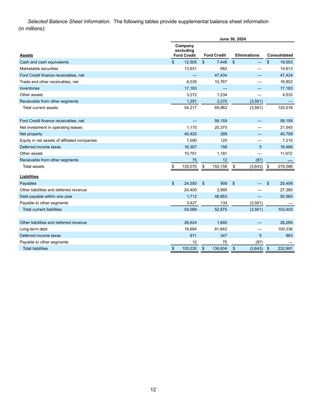 12 Selected Balance Sheet Information. The following tables provide supplemental balance sheet information (in millions): June 30, 2024 Assets Company excluding Ford Credit Ford Credit Eliminations Consolidated Cash and cash equivalents $ 12,505 $ 7,448 $ — $ 19,953 Marketable securities 13,931 682 — 14,613 Ford Credit finance receivables, net — 47,434 — 47,434 Trade and other receivables, net 6,035 10,767 — 16,802 Inventories 17,183 — — 17,183 Other assets 3,272 1,234 — 4,533 Receivable from other segments 1,291 2,270 (3,561) — Total current assets 54,217 69,862 (3,561) 120,518 Ford Credit finance receivables, net — 58,159 — 58,159 Net investment in operating leases 1,170 20,375 — 21,545 Net property 40,420 289 — 40,709 Equity in net assets of affiliated companies 7,090 125 — 7,215 Deferred income taxes 16,307 156 5 16,468 Other assets 10,791 1,181 — 11,972 Receivable from other segments 75 12 (87) — Total assets $ 130,070 $ 150,159 $ (3,643) $ 276,586 Liabilities Payables $ 24,550 $ 908 $ — $ 25,458 Other liabilities and deferred revenue 24,400 2,980 — 27,380 Debt payable within one year 1,712 48,853 — 50,565 Payable to other segments 3,427 134 (3,561) — Total current liabilities 54,089 52,875 (3,561) 103,403 Other liabilities and deferred revenue 26,624 1,665 — 28,289 Long-term debt 18,694 81,642 — 100,336 Deferred income taxes 611 347 5 963 Payable to other segments 12 75 (87) — Total liabilities $ 100,030 $ 136,604 $ (3,643) $ 232,991