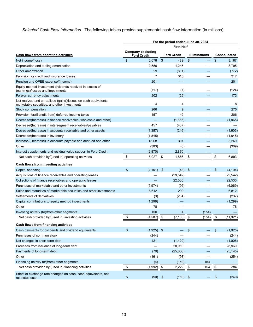 13 Selected Cash Flow Information. The following tables provide supplemental cash flow information (in millions): For the period ended June 30, 2024 First Half Cash flows from operating activities Company excluding Ford Credit Ford Credit Eliminations Consolidated Net income/(loss) $ 2,678 $ 489 $ — $ 3,167 Depreciation and tooling amortization 2,550 1,245 — 3,795 Other amortization 29 (801) — (772) Provision for credit and insurance losses 7 310 — 317 Pension and OPEB expense/(income) 201 — — 201 Equity method investment dividends received in excess of (earnings)/losses and impairments (117) (7) — (124) Foreign currency adjustments 202 (29) — 173 Net realized and unrealized (gains)/losses on cash equivalents, marketable securities, and other investments 4 4 — 8 Stock compensation 266 9 — 275 Provision for/(Benefit from) deferred income taxes 157 49 — 206 Decrease/(Increase) in finance receivables (wholesale and other) — (1,865) — (1,865) Decrease/(Increase) in intersegment receivables/payables 457 (457) — — Decrease/(Increase) in accounts receivable and other assets (1,357) (246) — (1,603) Decrease/(Increase) in inventory (1,845) — — (1,845) Increase/(Decrease) in accounts payable and accrued and other liabilities 4,968 301 — 5,269 Other (303) (6) — (309) Interest supplements and residual value support to Ford Credit (2,870) 2,870 — — Net cash provided by/(used in) operating activities $ 5,027 $ 1,866 $ — $ 6,893 Cash flows from investing activities Capital spending $ (4,151) $ (43) $ — $ (4,194) Acquisitions of finance receivables and operating leases — (29,542) — (29,542) Collections of finance receivables and operating leases — 22,530 — 22,530 Purchases of marketable and other investments (5,974) (95) — (6,069) Sales and maturities of marketable securities and other investments 6,612 200 — 6,812 Settlements of derivatives (3) (234) — (237) Capital contributions to equity method investments (1,299) — — (1,299) Other 78 — — 78 Investing activity (to)/from other segments 150 4 (154) — Net cash provided by/(used in) investing activities $ (4,587) $ (7,180) $ (154) $ (11,921) Cash flows from financing activities Cash payments for dividends and dividend equivalents $ (1,925) $ — $ — $ (1,925) Purchases of common stock (244) — — (244) Net changes in short-term debt 421 (1,429) — (1,008) Proceeds from issuance of long-term debt — 28,960 — 28,960 Payments of long-term debt (79) (25,066) — (25,145) Other (161) (93) — (254) Financing activity to/(from) other segments (4) (150) 154 — Net cash provided by/(used in) financing activities $ (1,992) $ 2,222 $ 154 $ 384 Effect of exchange rate changes on cash, cash equivalents, and restricted cash $ (90) $ (150) $ — $ (240)