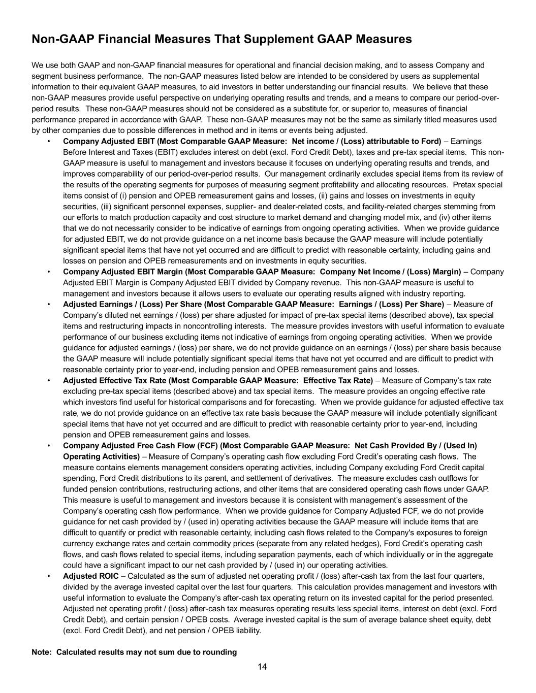 14 Non-GAAP Financial Measures That Supplement GAAP Measures We use both GAAP and non-GAAP financial measures for operational and financial decision making, and to assess Company and segment business performance. The non-GAAP measures listed below are intended to be considered by users as supplemental information to their equivalent GAAP measures, to aid investors in better understanding our financial results. We believe that these non-GAAP measures provide useful perspective on underlying operating results and trends, and a means to compare our period-over- period results. These non-GAAP measures should not be considered as a substitute for, or superior to, measures of financial performance prepared in accordance with GAAP. These non-GAAP measures may not be the same as similarly titled measures used by other companies due to possible differences in method and in items or events being adjusted. • Company Adjusted EBIT (Most Comparable GAAP Measure: Net income / (Loss) attributable to Ford) – Earnings Before Interest and Taxes (EBIT) excludes interest on debt (excl. Ford Credit Debt), taxes and pre-tax special items. This non- GAAP measure is useful to management and investors because it focuses on underlying operating results and trends, and improves comparability of our period-over-period results. Our management ordinarily excludes special items from its review of the results of the operating segments for purposes of measuring segment profitability and allocating resources. Pretax special items consist of (i) pension and OPEB remeasurement gains and losses, (ii) gains and losses on investments in equity securities, (iii) significant personnel expenses, supplier- and dealer-related costs, and facility-related charges stemming from our efforts to match production capacity and cost structure to market demand and changing model mix, and (iv) other items that we do not necessarily consider to be indicative of earnings from ongoing operating activities. When we provide guidance for adjusted EBIT, we do not provide guidance on a net income basis because the GAAP measure will include potentially significant special items that have not yet occurred and are difficult to predict with reasonable certainty, including gains and losses on pension and OPEB remeasurements and on investments in equity securities. • Company Adjusted EBIT Margin (Most Comparable GAAP Measure: Company Net Income / (Loss) Margin) – Company Adjusted EBIT Margin is Company Adjusted EBIT divided by Company revenue. This non-GAAP measure is useful to management and investors because it allows users to evaluate our operating results aligned with industry reporting. • Adjusted Earnings / (Loss) Per Share (Most Comparable GAAP Measure: Earnings / (Loss) Per Share) – Measure of Company’s diluted net earnings / (loss) per share adjusted for impact of pre-tax special items (described above), tax special items and restructuring impacts in noncontrolling interests. The measure provides investors with useful information to evaluate performance of our business excluding items not indicative of earnings from ongoing operating activities. When we provide guidance for adjusted earnings / (loss) per share, we do not provide guidance on an earnings / (loss) per share basis because the GAAP measure will include potentially significant special items that have not yet occurred and are difficult to predict with reasonable certainty prior to year-end, including pension and OPEB remeasurement gains and losses. • Adjusted Effective Tax Rate (Most Comparable GAAP Measure: Effective Tax Rate) – Measure of Company’s tax rate excluding pre-tax special items (described above) and tax special items. The measure provides an ongoing effective rate which investors find useful for historical comparisons and for forecasting. When we provide guidance for adjusted effective tax rate, we do not provide guidance on an effective tax rate basis because the GAAP measure will include potentially significant special items that have not yet occurred and are difficult to predict with reasonable certainty prior to year-end, including pension and OPEB remeasurement gains and losses. • Company Adjusted Free Cash Flow (FCF) (Most Comparable GAAP Measure: Net Cash Provided By / (Used In) Operating Activities) – Measure of Company’s operating cash flow excluding Ford Credit’s operating cash flows. The measure contains elements management considers operating activities, including Company excluding Ford Credit capital spending, Ford Credit distributions to its parent, and settlement of derivatives. The measure excludes cash outflows for funded pension contributions, restructuring actions, and other items that are considered operating cash flows under GAAP. This measure is useful to management and investors because it is consistent with management’s assessment of the Company’s operating cash flow performance. When we provide guidance for Company Adjusted FCF, we do not provide guidance for net cash provided by / (used in) operating activities because the GAAP measure will include items that are difficult to quantify or predict with reasonable certainty, including cash flows related to the Company's exposures to foreign currency exchange rates and certain commodity prices (separate from any related hedges), Ford Credit's operating cash flows, and cash flows related to special items, including separation payments, each of which individually or in the aggregate could have a significant impact to our net cash provided by / (used in) our operating activities. • Adjusted ROIC – Calculated as the sum of adjusted net operating profit / (loss) after-cash tax from the last four quarters, divided by the average invested capital over the last four quarters. This calculation provides management and investors with useful information to evaluate the Company’s after-cash tax operating return on its invested capital for the period presented. Adjusted net oper