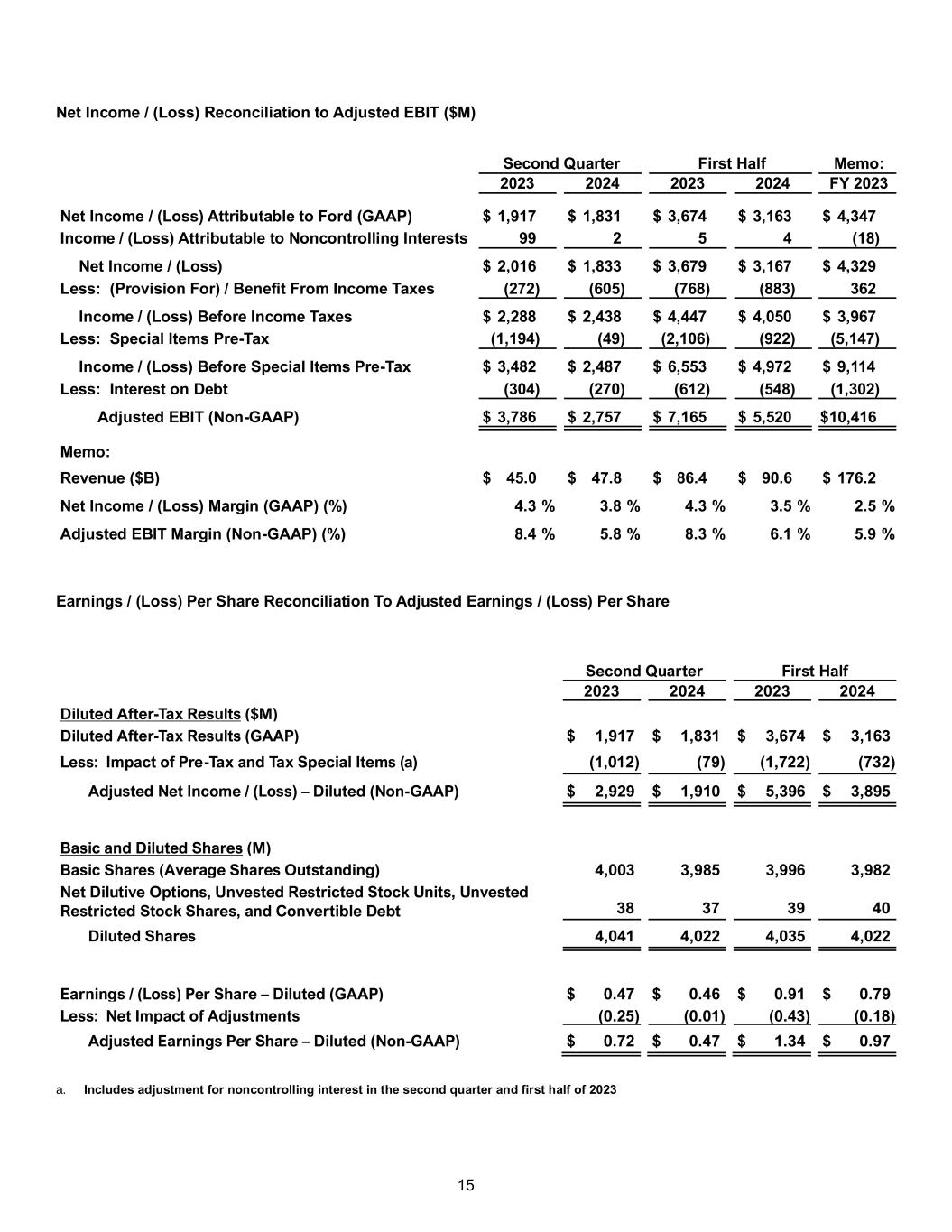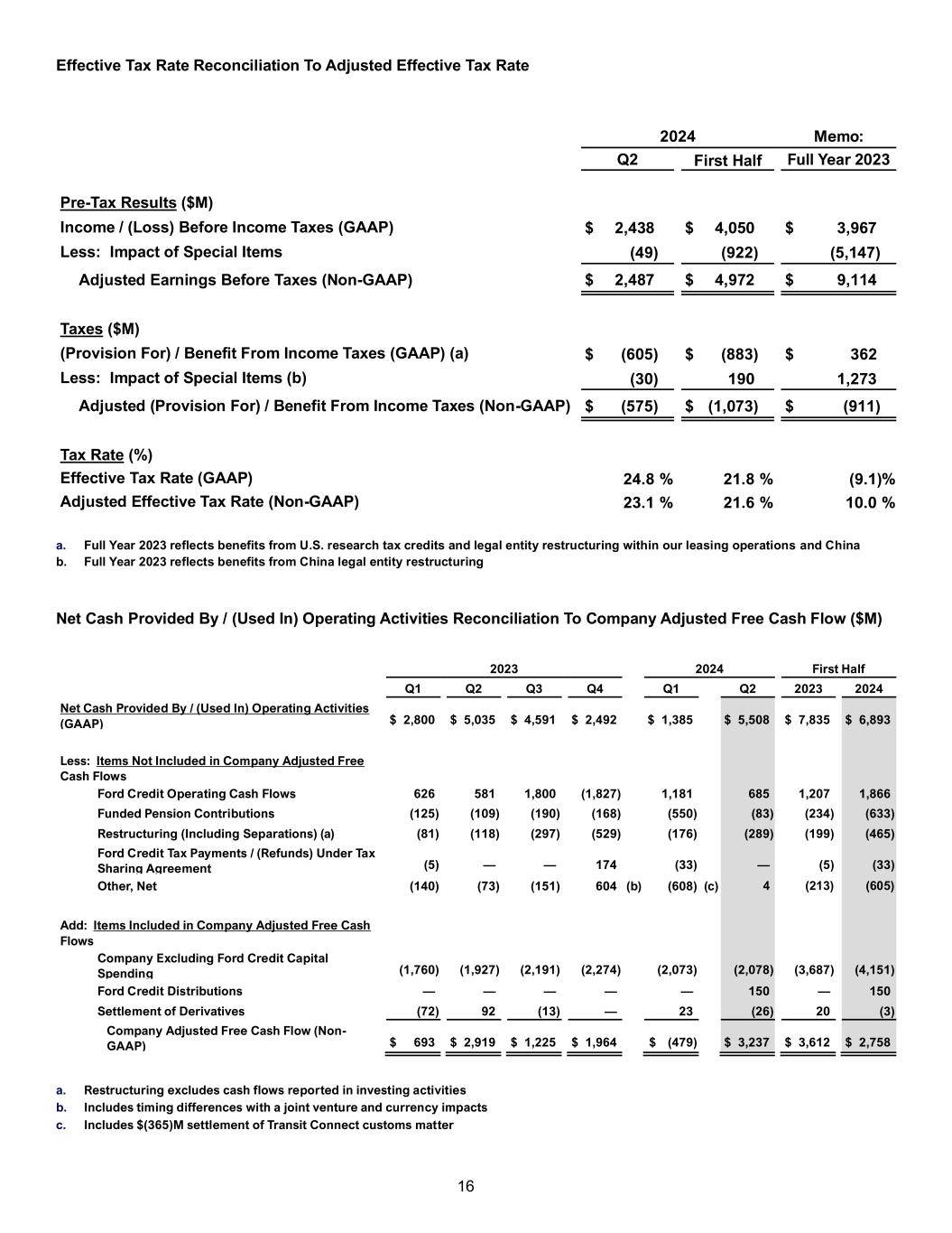 15 Net Income / (Loss) Reconciliation to Adjusted EBIT ($M) Second Quarter First Half Memo: 2023 2024 2023 2024 FY 2023 Net Income / (Loss) Attributable to Ford (GAAP) $ 1,917 $ 1,831 $ 3,674 $ 3,163 $ 4,347 Income / (Loss) Attributable to Noncontrolling Interests 99 2 5 4 (18) Net Income / (Loss) $ 2,016 $ 1,833 $ 3,679 $ 3,167 $ 4,329 Less: (Provision For) / Benefit From Income Taxes (272) (605) (768) (883) 362 Income / (Loss) Before Income Taxes $ 2,288 $ 2,438 $ 4,447 $ 4,050 $ 3,967 Less: Special Items Pre-Tax (1,194) (49) (2,106) (922) (5,147) Income / (Loss) Before Special Items Pre-Tax $ 3,482 $ 2,487 $ 6,553 $ 4,972 $ 9,114 Less: Interest on Debt (304) (270) (612) (548) (1,302) Adjusted EBIT (Non-GAAP) $ 3,786 $ 2,757 $ 7,165 $ 5,520 $ 10,416 Memo: Revenue ($B) $ 45.0 $ 47.8 $ 86.4 $ 90.6 $ 176.2 Net Income / (Loss) Margin (GAAP) (%) 4.3 % 3.8 % 4.3 % 3.5 % 2.5 % Adjusted EBIT Margin (Non-GAAP) (%) 8.4 % 5.8 % 8.3 % 6.1 % 5.9 % Earnings / (Loss) Per Share Reconciliation To Adjusted Earnings / (Loss) Per Share Second Quarter First Half 2023 2024 2023 2024 Diluted After-Tax Results ($M) Diluted After-Tax Results (GAAP) $ 1,917 $ 1,831 $ 3,674 $ 3,163 Less: Impact of Pre-Tax and Tax Special Items (a) (1,012) (79) (1,722) (732) Adjusted Net Income / (Loss) – Diluted (Non-GAAP) $ 2,929 $ 1,910 $ 5,396 $ 3,895 Basic and Diluted Shares (M) Basic Shares (Average Shares Outstanding) 4,003 3,985 3,996 3,982 Net Dilutive Options, Unvested Restricted Stock Units, Unvested Restricted Stock Shares, and Convertible Debt 38 37 39 40 Diluted Shares 4,041 4,022 4,035 4,022 Earnings / (Loss) Per Share – Diluted (GAAP) $ 0.47 $ 0.46 $ 0.91 $ 0.79 Less: Net Impact of Adjustments (0.25) (0.01) (0.43) (0.18) Adjusted Earnings Per Share – Diluted (Non-GAAP) $ 0.72 $ 0.47 $ 1.34 $ 0.97 a. Includes adjustment for noncontrolling interest in the second quarter and first half of 2023