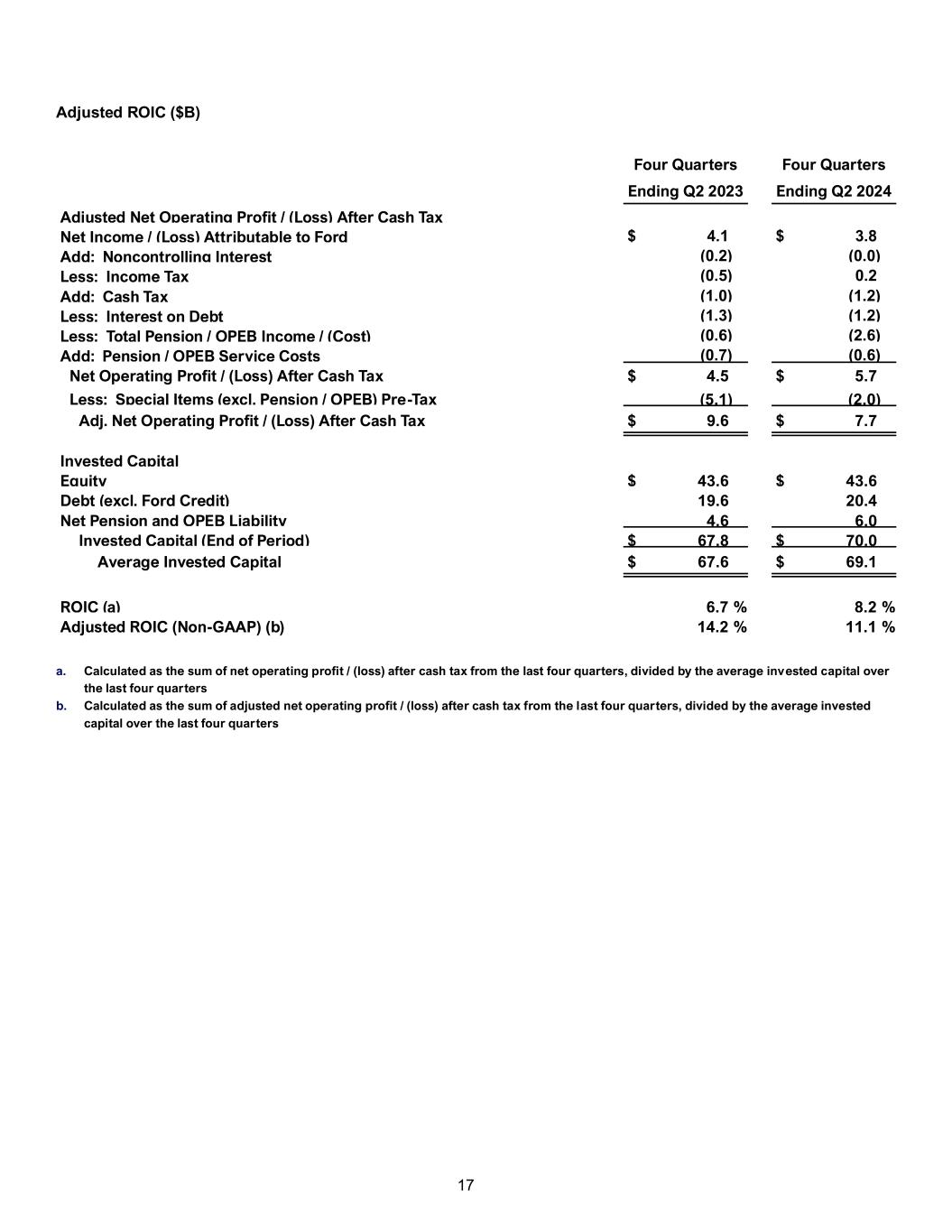 16 Effective Tax Rate Reconciliation To Adjusted Effective Tax Rate 2024 Memo: Q2 First Half Full Year 2023 Pre-Tax Results ($M) Income / (Loss) Before Income Taxes (GAAP) $ 2,438 $ 4,050 $ 3,967 Less: Impact of Special Items (49) (922) (5,147) Adjusted Earnings Before Taxes (Non-GAAP) $ 2,487 $ 4,972 $ 9,114 Taxes ($M) (Provision For) / Benefit From Income Taxes (GAAP) (a) $ (605) $ (883) $ 362 Less: Impact of Special Items (b) (30) 190 1,273 Adjusted (Provision For) / Benefit From Income Taxes (Non-GAAP) $ (575) $ (1,073) $ (911) Tax Rate (%) Effective Tax Rate (GAAP) 24.8 % 21.8 % (9.1)% Adjusted Effective Tax Rate (Non-GAAP) 23.1 % 21.6 % 10.0 % a. Full Year 2023 reflects benefits from U.S. research tax credits and legal entity restructuring within our leasing operations and China b. Full Year 2023 reflects benefits from China legal entity restructuring Net Cash Provided By / (Used In) Operating Activities Reconciliation To Company Adjusted Free Cash Flow ($M) 2023 2024 First Half Q1 Q2 Q3 Q4 Q1 Q2 2023 2024 Net Cash Provided By / (Used In) Operating Activities (GAAP) $ 2,800 $ 5,035 $ 4,591 $ 2,492 $ 1,385 $ 5,508 $ 7,835 $ 6,893 Less: Items Not Included in Company Adjusted Free Cash Flows Ford Credit Operating Cash Flows 626 581 1,800 (1,827) 1,181 685 1,207 1,866 Funded Pension Contributions (125) (109) (190) (168) (550) (83) (234) (633) Restructuring (Including Separations) (a) (81) (118) (297) (529) (176) (289) (199) (465) Ford Credit Tax Payments / (Refunds) Under Tax Sharing Agreement (5) — — 174 (33) — (5) (33) Other, Net (140) (73) (151) 604 (b) (608) (c) 4 (213) (605) Add: Items Included in Company Adjusted Free Cash Flows Company Excluding Ford Credit Capital Spending (1,760) (1,927) (2,191) (2,274) (2,073) (2,078) (3,687) (4,151) Ford Credit Distributions — — — — — 150 — 150 Settlement of Derivatives (72) 92 (13) — 23 (26) 20 (3) Company Adjusted Free Cash Flow (Non- GAAP) $ 693 $ 2,919 $ 1,225 $ 1,964 $ (479) $ 3,237 $ 3,612 $ 2,758 a. Restructuring excludes cash flows reported in investing activities b. Includes timing differences with a joint venture and currency impacts c. Includes $(365)M settlement of Transit Connect customs matter