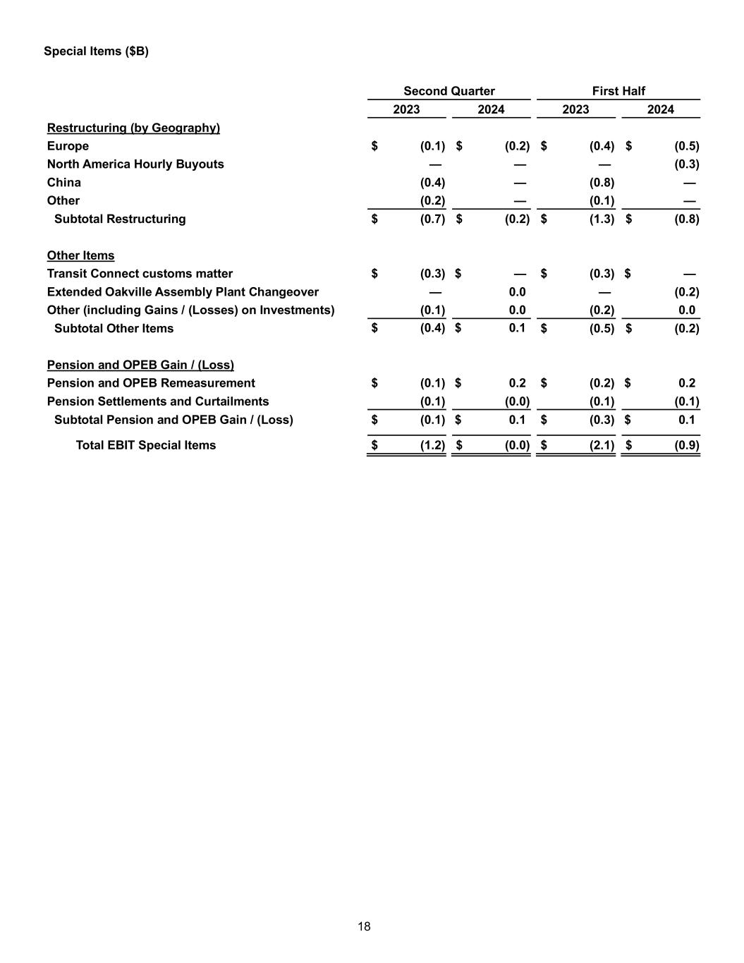 17 Adjusted ROIC ($B) Four Quarters Ending Q2 2023 Four Quarters Ending Q2 2024 Adjusted Net Operating Profit / (Loss) After Cash Tax Net Income / (Loss) Attributable to Ford $ 4.1 $ 3.8 Add: Noncontrolling Interest (0.2) (0.0) Less: Income Tax (0.5) 0.2 Add: Cash Tax (1.0) (1.2) Less: Interest on Debt (1.3) (1.2) Less: Total Pension / OPEB Income / (Cost) (0.6) (2.6) Add: Pension / OPEB Service Costs (0.7) (0.6) Net Operating Profit / (Loss) After Cash Tax $ 4.5 $ 5.7 Less: Special Items (excl. Pension / OPEB) Pre-Tax (5.1) (2.0) Adj. Net Operating Profit / (Loss) After Cash Tax $ 9.6 $ 7.7 Invested Capital Equity $ 43.6 $ 43.6 Debt (excl. Ford Credit) 19.6 20.4 Net Pension and OPEB Liability 4.6 6.0 Invested Capital (End of Period) $ 67.8 $ 70.0 Average Invested Capital $ 67.6 $ 69.1 ROIC (a) 6.7 % 8.2 % Adjusted ROIC (Non-GAAP) (b) 14.2 % 11.1 % a. Calculated as the sum of net operating profit / (loss) after cash tax from the last four quarters, divided by the average invested capital over the last four quarters b. Calculated as the sum of adjusted net operating profit / (loss) after cash tax from the last four quarters, divided by the average invested capital over the last four quarters