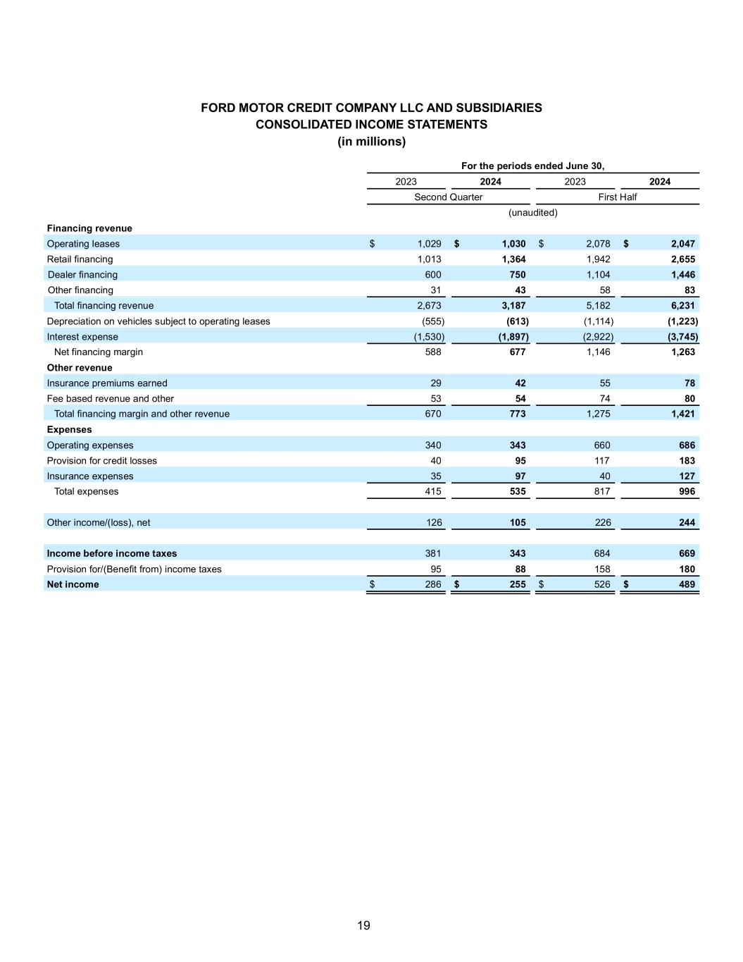 19 FORD MOTOR CREDIT COMPANY LLC AND SUBSIDIARIES CONSOLIDATED INCOME STATEMENTS (in millions) For the periods ended June 30, 2023 2024 2023 2024 Second Quarter First Half (unaudited) Financing revenue Operating leases $ 1,029 $ 1,030 $ 2,078 $ 2,047 Retail financing 1,013 1,364 1,942 2,655 Dealer financing 600 750 1,104 1,446 Other financing 31 43 58 83 Total financing revenue 2,673 3,187 5,182 6,231 Depreciation on vehicles subject to operating leases (555) (613) (1,114) (1,223) Interest expense (1,530) (1,897) (2,922) (3,745) Net financing margin 588 677 1,146 1,263 Other revenue Insurance premiums earned 29 42 55 78 Fee based revenue and other 53 54 74 80 Total financing margin and other revenue 670 773 1,275 1,421 Expenses Operating expenses 340 343 660 686 Provision for credit losses 40 95 117 183 Insurance expenses 35 97 40 127 Total expenses 415 535 817 996 Other income/(loss), net 126 105 226 244 Income before income taxes 381 343 684 669 Provision for/(Benefit from) income taxes 95 88 158 180 Net income $ 286 $ 255 $ 526 $ 489