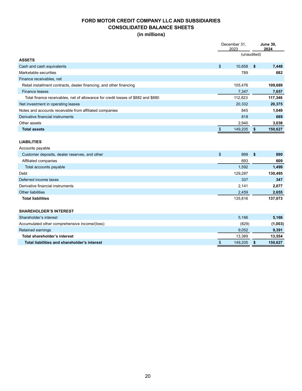 20 FORD MOTOR CREDIT COMPANY LLC AND SUBSIDIARIES CONSOLIDATED BALANCE SHEETS (in millions) December 31, 2023 June 30, 2024 (unaudited) ASSETS Cash and cash equivalents $ 10,658 $ 7,448 Marketable securities 789 682 Finance receivables, net Retail installment contracts, dealer financing, and other financing 105,476 109,689 Finance leases 7,347 7,657 Total finance receivables, net of allowance for credit losses of $882 and $880 112,823 117,346 Net investment in operating leases 20,332 20,375 Notes and accounts receivable from affiliated companies 845 1,049 Derivative financial instruments 818 689 Other assets 2,940 3,038 Total assets $ 149,205 $ 150,627 LIABILITIES Accounts payable Customer deposits, dealer reserves, and other $ 899 $ 890 Affiliated companies 693 609 Total accounts payable 1,592 1,499 Debt 129,287 130,495 Deferred income taxes 337 347 Derivative financial instruments 2,141 2,077 Other liabilities 2,459 2,655 Total liabilities 135,816 137,073 SHAREHOLDER’S INTEREST Shareholder’s interest 5,166 5,166 Accumulated other comprehensive income/(loss) (829) (1,003) Retained earnings 9,052 9,391 Total shareholder’s interest 13,389 13,554 Total liabilities and shareholder’s interest $ 149,205 $ 150,627