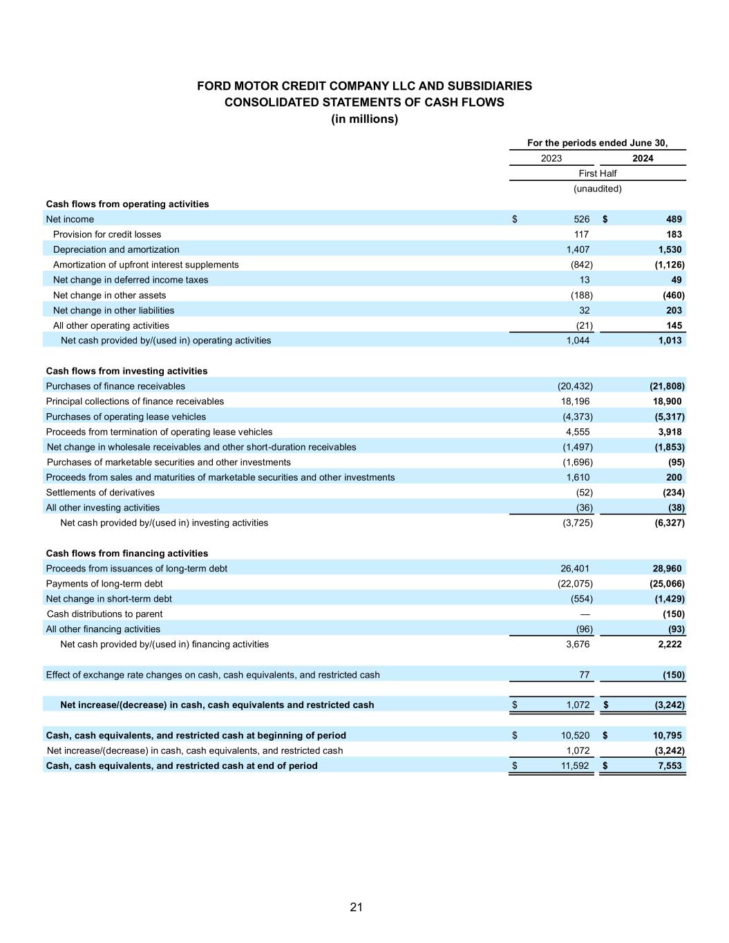 21 FORD MOTOR CREDIT COMPANY LLC AND SUBSIDIARIES CONSOLIDATED STATEMENTS OF CASH FLOWS (in millions) For the periods ended June 30, 2023 2024 First Half (unaudited) Cash flows from operating activities Net income $ 526 $ 489 Provision for credit losses 117 183 Depreciation and amortization 1,407 1,530 Amortization of upfront interest supplements (842) (1,126) Net change in deferred income taxes 13 49 Net change in other assets (188) (460) Net change in other liabilities 32 203 All other operating activities (21) 145 Net cash provided by/(used in) operating activities 1,044 1,013 Cash flows from investing activities Purchases of finance receivables (20,432) (21,808) Principal collections of finance receivables 18,196 18,900 Purchases of operating lease vehicles (4,373) (5,317) Proceeds from termination of operating lease vehicles 4,555 3,918 Net change in wholesale receivables and other short-duration receivables (1,497) (1,853) Purchases of marketable securities and other investments (1,696) (95) Proceeds from sales and maturities of marketable securities and other investments 1,610 200 Settlements of derivatives (52) (234) All other investing activities (36) (38) Net cash provided by/(used in) investing activities (3,725) (6,327) Cash flows from financing activities Proceeds from issuances of long-term debt 26,401 28,960 Payments of long-term debt (22,075) (25,066) Net change in short-term debt (554) (1,429) Cash distributions to parent — (150) All other financing activities (96) (93) Net cash provided by/(used in) financing activities 3,676 2,222 Effect of exchange rate changes on cash, cash equivalents, and restricted cash 77 (150) Net increase/(decrease) in cash, cash equivalents and restricted cash $ 1,072 $ (3,242) Cash, cash equivalents, and restricted cash at beginning of period $ 10,520 $ 10,795 Net increase/(decrease) in cash, cash equivalents, and restricted cash 1,072 (3,242) Cash, cash equivalents, and restricted cash at end of period $ 11,592 $ 7,553