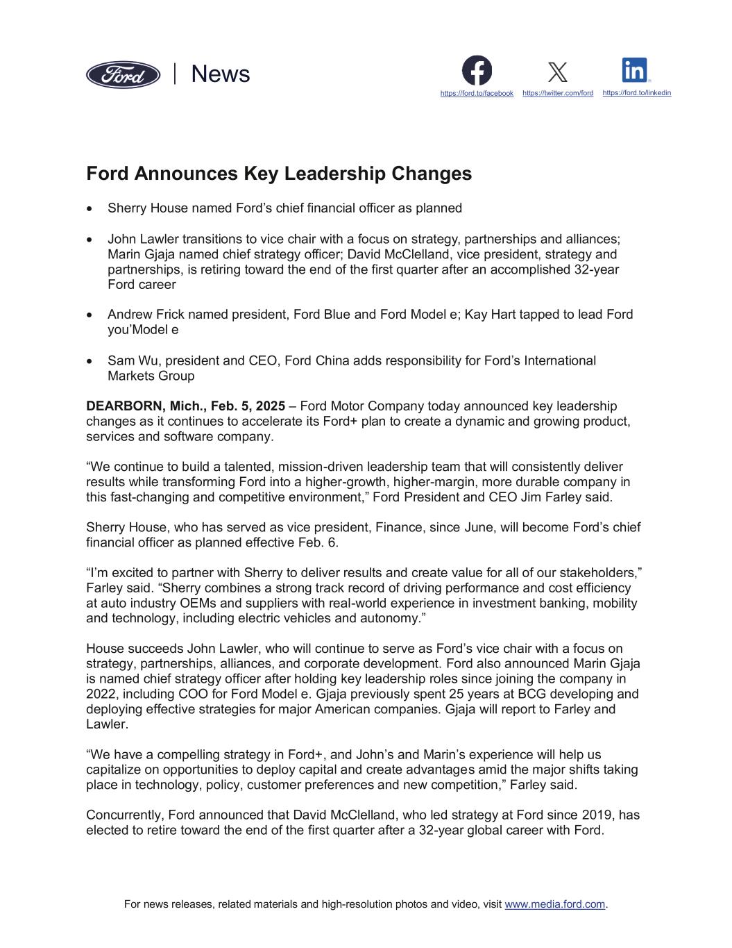 For news releases, related materials and high-resolution photos and video, visit www.media.ford.com. https://twitter.com/fordhttps://ford.to/facebook https://ford.to/linkedin News Ford Announces Key Leadership Changes · Sherry House named Ford’s chief financial officer as planned · John Lawler transitions to vice chair with a focus on strategy, partnerships and alliances; Marin Gjaja named chief strategy officer; David McClelland, vice president, strategy and partnerships, is retiring toward the end of the first quarter after an accomplished 32-year Ford career · Andrew Frick named president, Ford Blue and Ford Model e; Kay Hart tapped to lead Ford you’Model e · Sam Wu, president and CEO, Ford China adds responsibility for Ford’s International Markets Group DEARBORN, Mich., Feb. 5, 2025 – Ford Motor Company today announced key leadership changes as it continues to accelerate its Ford+ plan to create a dynamic and growing product, services and software company. “We continue to build a talented, mission-driven leadership team that will consistently deliver results while transforming Ford into a higher-growth, higher-margin, more durable company in this fast-changing and competitive environment,” Ford President and CEO Jim Farley said. Sherry House, who has served as vice president, Finance, since June, will become Ford’s chief financial officer as planned effective Feb. 6. “I’m excited to partner with Sherry to deliver results and create value for all of our stakeholders,” Farley said. “Sherry combines a strong track record of driving performance and cost efficiency at auto industry OEMs and suppliers with real-world experience in investment banking, mobility and technology, including electric vehicles and autonomy.” House succeeds John Lawler, who will continue to serve as Ford’s vice chair with a focus on strategy, partnerships, alliances, and corporate development. Ford also announced Marin Gjaja is named chief strategy officer after holding key leadership roles since joining the company in 2022, including COO for Ford Model e. Gjaja previously spent 25 years at BCG developing and deploying effective strategies for major American companies. Gjaja will report to Farley and Lawler. “We have a compelling strategy in Ford+, and John’s and Marin’s experience will help us capitalize on opportunities to deploy capital and create advantages amid the major shifts taking place in technology, policy, customer preferences and new competition,” Farley said. Concurrently, Ford announced that David McClelland, who led strategy at Ford since 2019, has elected to retire toward the end of the first quarter after a 32-year global career with Ford.