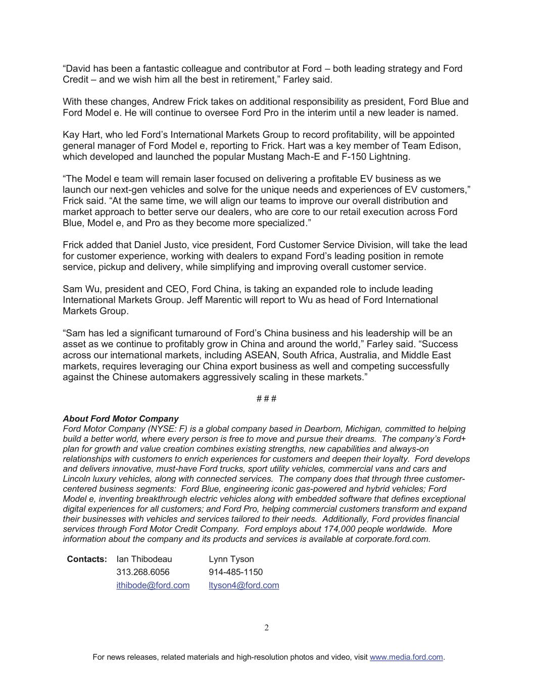 For news releases, related materials and high-resolution photos and video, visit www.media.ford.com. 2 “David has been a fantastic colleague and contributor at Ford – both leading strategy and Ford Credit – and we wish him all the best in retirement,” Farley said. With these changes, Andrew Frick takes on additional responsibility as president, Ford Blue and Ford Model e. He will continue to oversee Ford Pro in the interim until a new leader is named. Kay Hart, who led Ford’s International Markets Group to record profitability, will be appointed general manager of Ford Model e, reporting to Frick. Hart was a key member of Team Edison, which developed and launched the popular Mustang Mach-E and F-150 Lightning. “The Model e team will remain laser focused on delivering a profitable EV business as we launch our next-gen vehicles and solve for the unique needs and experiences of EV customers,” Frick said. “At the same time, we will align our teams to improve our overall distribution and market approach to better serve our dealers, who are core to our retail execution across Ford Blue, Model e, and Pro as they become more specialized.” Frick added that Daniel Justo, vice president, Ford Customer Service Division, will take the lead for customer experience, working with dealers to expand Ford’s leading position in remote service, pickup and delivery, while simplifying and improving overall customer service. Sam Wu, president and CEO, Ford China, is taking an expanded role to include leading International Markets Group. Jeff Marentic will report to Wu as head of Ford International Markets Group. “Sam has led a significant turnaround of Ford’s China business and his leadership will be an asset as we continue to profitably grow in China and around the world,” Farley said. “Success across our international markets, including ASEAN, South Africa, Australia, and Middle East markets, requires leveraging our China export business as well and competing successfully against the Chinese automakers aggressively scaling in these markets.” # # # About Ford Motor Company Ford Motor Company (NYSE: F) is a global company based in Dearborn, Michigan, committed to helping build a better world, where every person is free to move and pursue their dreams. The company’s Ford+ plan for growth and value creation combines existing strengths, new capabilities and always-on relationships with customers to enrich experiences for customers and deepen their loyalty. Ford develops and delivers innovative, must-have Ford trucks, sport utility vehicles, commercial vans and cars and Lincoln luxury vehicles, along with connected services. The company does that through three customer- centered business segments: Ford Blue, engineering iconic gas-powered and hybrid vehicles; Ford Model e, inventing breakthrough electric vehicles along with embedded software that defines exceptional digital experiences for all customers; and Ford Pro, helping commercial customers transform and expand their businesses with vehicles and services tailored to their needs. Additionally, Ford provides financial services through Ford Motor Credit Company. Ford employs about 174,000 people worldwide. More information about the company and its products and services is available at corporate.ford.com. Contacts: Ian Thibodeau Lynn Tyson 313.268.6056 914-485-1150 ithibode@ford.com ltyson4@ford.com