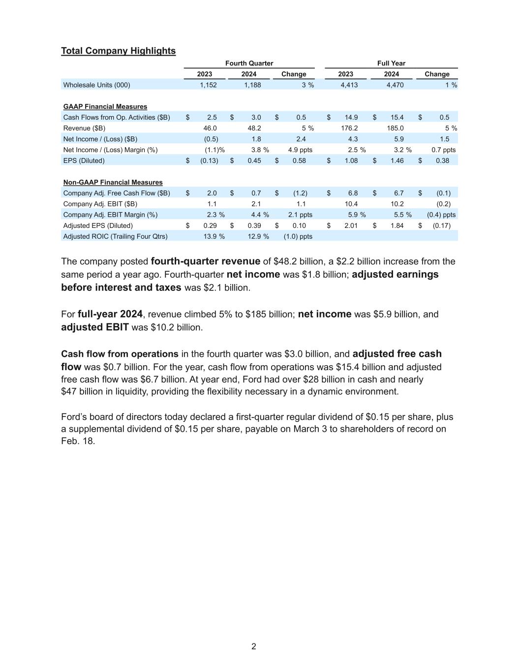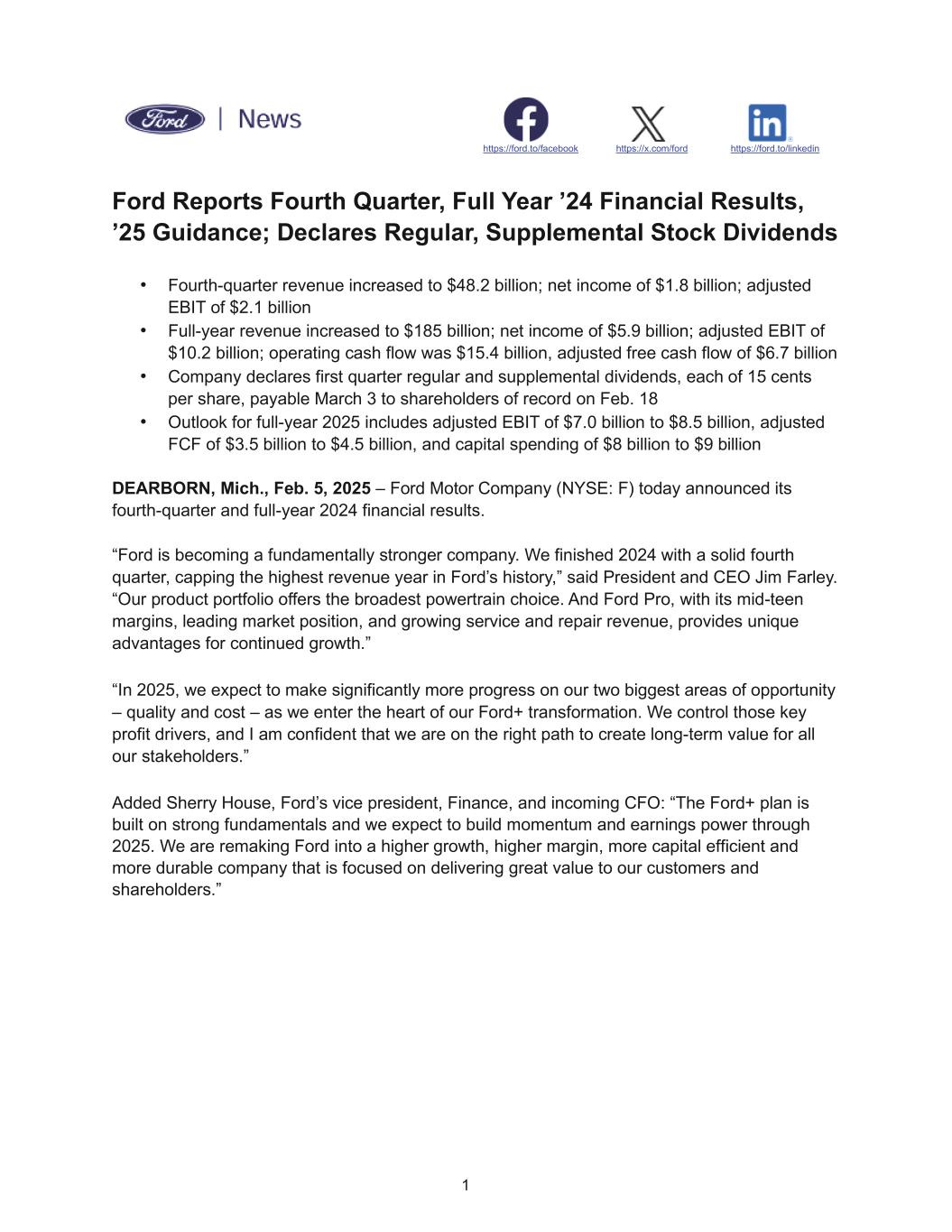 1 https://ford.to/facebook https://x.com/ford https://ford.to/linkedin Ford Reports Fourth Quarter, Full Year ’24 Financial Results, ’25 Guidance; Declares Regular, Supplemental Stock Dividends • Fourth-quarter revenue increased to $48.2 billion; net income of $1.8 billion; adjusted EBIT of $2.1 billion • Full-year revenue increased to $185 billion; net income of $5.9 billion; adjusted EBIT of $10.2 billion; operating cash flow was $15.4 billion, adjusted free cash flow of $6.7 billion • Company declares first quarter regular and supplemental dividends, each of 15 cents per share, payable March 3 to shareholders of record on Feb. 18 • Outlook for full-year 2025 includes adjusted EBIT of $7.0 billion to $8.5 billion, adjusted FCF of $3.5 billion to $4.5 billion, and capital spending of $8 billion to $9 billion DEARBORN, Mich., Feb. 5, 2025 – Ford Motor Company (NYSE: F) today announced its fourth-quarter and full-year 2024 financial results. “Ford is becoming a fundamentally stronger company. We finished 2024 with a solid fourth quarter, capping the highest revenue year in Ford’s history,” said President and CEO Jim Farley. “Our product portfolio offers the broadest powertrain choice. And Ford Pro, with its mid-teen margins, leading market position, and growing service and repair revenue, provides unique advantages for continued growth.” “In 2025, we expect to make significantly more progress on our two biggest areas of opportunity – quality and cost – as we enter the heart of our Ford+ transformation. We control those key profit drivers, and I am confident that we are on the right path to create long-term value for all our stakeholders.” Added Sherry House, Ford’s vice president, Finance, and incoming CFO: “The Ford+ plan is built on strong fundamentals and we expect to build momentum and earnings power through 2025. We are remaking Ford into a higher growth, higher margin, more capital efficient and more durable company that is focused on delivering great value to our customers and shareholders.”