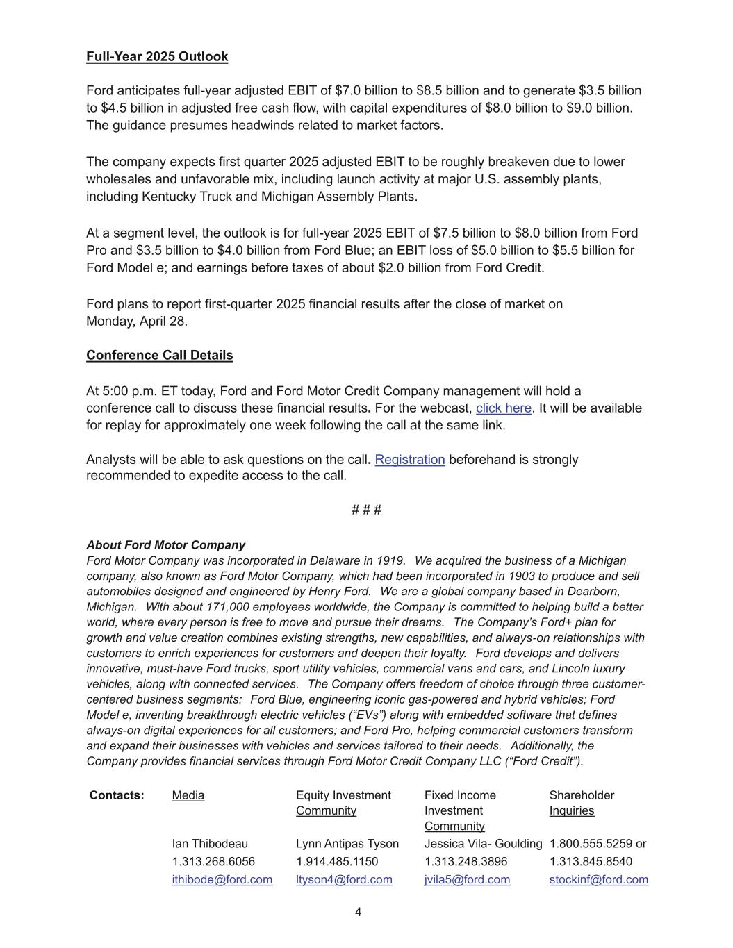 4 Full-Year 2025 Outlook Ford anticipates full-year adjusted EBIT of $7.0 billion to $8.5 billion and to generate $3.5 billion to $4.5 billion in adjusted free cash flow, with capital expenditures of $8.0 billion to $9.0 billion. The guidance presumes headwinds related to market factors. The company expects first quarter 2025 adjusted EBIT to be roughly breakeven due to lower wholesales and unfavorable mix, including launch activity at major U.S. assembly plants, including Kentucky Truck and Michigan Assembly Plants. At a segment level, the outlook is for full-year 2025 EBIT of $7.5 billion to $8.0 billion from Ford Pro and $3.5 billion to $4.0 billion from Ford Blue; an EBIT loss of $5.0 billion to $5.5 billion for Ford Model e; and earnings before taxes of about $2.0 billion from Ford Credit. Ford plans to report first-quarter 2025 financial results after the close of market on Monday, April 28. Conference Call Details At 5:00 p.m. ET today, Ford and Ford Motor Credit Company management will hold a conference call to discuss these financial results. For the webcast, click here. It will be available for replay for approximately one week following the call at the same link. Analysts will be able to ask questions on the call. Registration beforehand is strongly recommended to expedite access to the call. # # # About Ford Motor Company Ford Motor Company was incorporated in Delaware in 1919. We acquired the business of a Michigan company, also known as Ford Motor Company, which had been incorporated in 1903 to produce and sell automobiles designed and engineered by Henry Ford. We are a global company based in Dearborn, Michigan. With about 171,000 employees worldwide, the Company is committed to helping build a better world, where every person is free to move and pursue their dreams. The Company’s Ford+ plan for growth and value creation combines existing strengths, new capabilities, and always-on relationships with customers to enrich experiences for customers and deepen their loyalty. Ford develops and delivers innovative, must-have Ford trucks, sport utility vehicles, commercial vans and cars, and Lincoln luxury vehicles, along with connected services. The Company offers freedom of choice through three customer- centered business segments: Ford Blue, engineering iconic gas-powered and hybrid vehicles; Ford Model e, inventing breakthrough electric vehicles (“EVs”) along with embedded software that defines always-on digital experiences for all customers; and Ford Pro, helping commercial customers transform and expand their businesses with vehicles and services tailored to their needs. Additionally, the Company provides financial services through Ford Motor Credit Company LLC (“Ford Credit”). Contacts: Media Equity Investment Community Fixed Income Investment Community Shareholder Inquiries Ian Thibodeau Lynn Antipas Tyson Jessica Vila- Goulding 1.800.555.5259 or 1.313.268.6056 1.914.485.1150 1.313.248.3896 1.313.845.8540 ithibode@ford.com ltyson4@ford.com jvila5@ford.com stockinf@ford.com