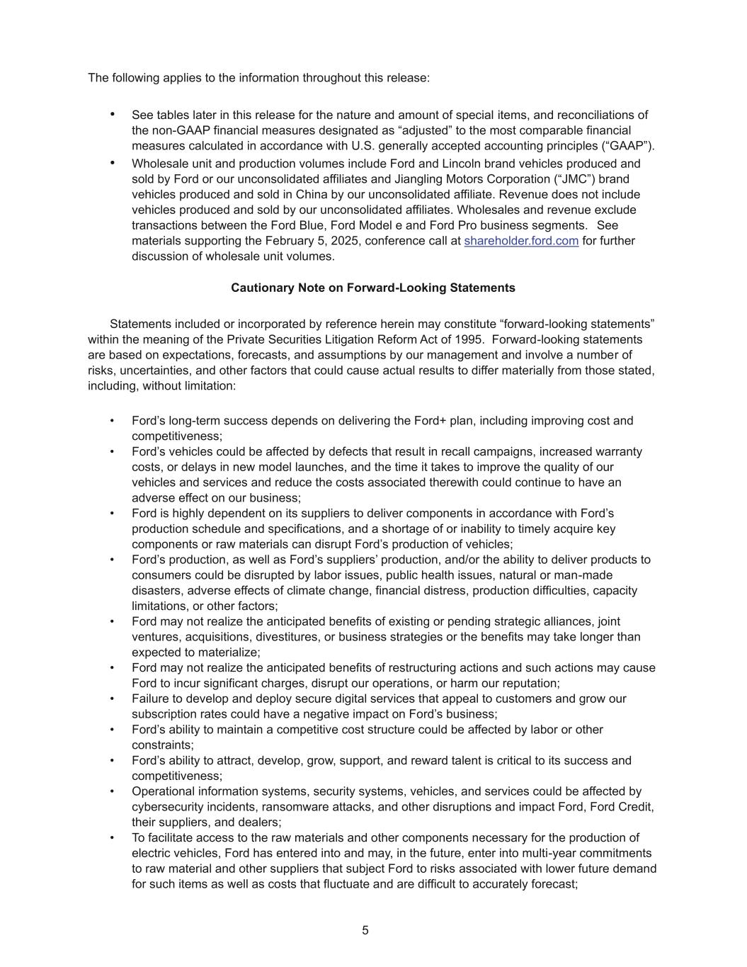 5 The following applies to the information throughout this release: • See tables later in this release for the nature and amount of special items, and reconciliations of the non-GAAP financial measures designated as “adjusted” to the most comparable financial measures calculated in accordance with U.S. generally accepted accounting principles (“GAAP”). • Wholesale unit and production volumes include Ford and Lincoln brand vehicles produced and sold by Ford or our unconsolidated affiliates and Jiangling Motors Corporation (“JMC”) brand vehicles produced and sold in China by our unconsolidated affiliate. Revenue does not include vehicles produced and sold by our unconsolidated affiliates. Wholesales and revenue exclude transactions between the Ford Blue, Ford Model e and Ford Pro business segments. See materials supporting the February 5, 2025, conference call at shareholder.ford.com for further discussion of wholesale unit volumes. Cautionary Note on Forward-Looking Statements Statements included or incorporated by reference herein may constitute “forward-looking statements” within the meaning of the Private Securities Litigation Reform Act of 1995. Forward-looking statements are based on expectations, forecasts, and assumptions by our management and involve a number of risks, uncertainties, and other factors that could cause actual results to differ materially from those stated, including, without limitation: • Ford’s long-term success depends on delivering the Ford+ plan, including improving cost and competitiveness; • Ford’s vehicles could be affected by defects that result in recall campaigns, increased warranty costs, or delays in new model launches, and the time it takes to improve the quality of our vehicles and services and reduce the costs associated therewith could continue to have an adverse effect on our business; • Ford is highly dependent on its suppliers to deliver components in accordance with Ford’s production schedule and specifications, and a shortage of or inability to timely acquire key components or raw materials can disrupt Ford’s production of vehicles; • Ford’s production, as well as Ford’s suppliers’ production, and/or the ability to deliver products to consumers could be disrupted by labor issues, public health issues, natural or man-made disasters, adverse effects of climate change, financial distress, production difficulties, capacity limitations, or other factors; • Ford may not realize the anticipated benefits of existing or pending strategic alliances, joint ventures, acquisitions, divestitures, or business strategies or the benefits may take longer than expected to materialize; • Ford may not realize the anticipated benefits of restructuring actions and such actions may cause Ford to incur significant charges, disrupt our operations, or harm our reputation; • Failure to develop and deploy secure digital services that appeal to customers and grow our subscription rates could have a negative impact on Ford’s business; • Ford’s ability to maintain a competitive cost structure could be affected by labor or other constraints; • Ford’s ability to attract, develop, grow, support, and reward talent is critical to its success and competitiveness; • Operational information systems, security systems, vehicles, and services could be affected by cybersecurity incidents, ransomware attacks, and other disruptions and impact Ford, Ford Credit, their suppliers, and dealers; • To facilitate access to the raw materials and other components necessary for the production of electric vehicles, Ford has entered into and may, in the future, enter into multi-year commitments to raw material and other suppliers that subject Ford to risks associated with lower future demand for such items as well as costs that fluctuate and are difficult to accurately forecast;
