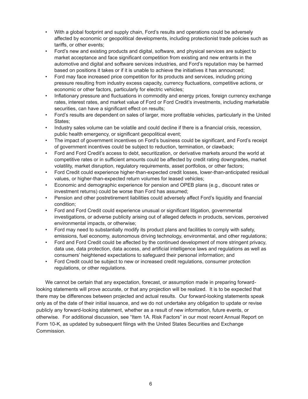 6 • With a global footprint and supply chain, Ford’s results and operations could be adversely affected by economic or geopolitical developments, including protectionist trade policies such as tariffs, or other events; • Ford’s new and existing products and digital, software, and physical services are subject to market acceptance and face significant competition from existing and new entrants in the automotive and digital and software services industries, and Ford’s reputation may be harmed based on positions it takes or if it is unable to achieve the initiatives it has announced; • Ford may face increased price competition for its products and services, including pricing pressure resulting from industry excess capacity, currency fluctuations, competitive actions, or economic or other factors, particularly for electric vehicles; • Inflationary pressure and fluctuations in commodity and energy prices, foreign currency exchange rates, interest rates, and market value of Ford or Ford Credit’s investments, including marketable securities, can have a significant effect on results; • Ford’s results are dependent on sales of larger, more profitable vehicles, particularly in the United States; • Industry sales volume can be volatile and could decline if there is a financial crisis, recession, public health emergency, or significant geopolitical event; • The impact of government incentives on Ford’s business could be significant, and Ford’s receipt of government incentives could be subject to reduction, termination, or clawback; • Ford and Ford Credit’s access to debt, securitization, or derivative markets around the world at competitive rates or in sufficient amounts could be affected by credit rating downgrades, market volatility, market disruption, regulatory requirements, asset portfolios, or other factors; • Ford Credit could experience higher-than-expected credit losses, lower-than-anticipated residual values, or higher-than-expected return volumes for leased vehicles; • Economic and demographic experience for pension and OPEB plans (e.g., discount rates or investment returns) could be worse than Ford has assumed; • Pension and other postretirement liabilities could adversely affect Ford’s liquidity and financial condition; • Ford and Ford Credit could experience unusual or significant litigation, governmental investigations, or adverse publicity arising out of alleged defects in products, services, perceived environmental impacts, or otherwise; • Ford may need to substantially modify its product plans and facilities to comply with safety, emissions, fuel economy, autonomous driving technology, environmental, and other regulations; • Ford and Ford Credit could be affected by the continued development of more stringent privacy, data use, data protection, data access, and artificial intelligence laws and regulations as well as consumers’ heightened expectations to safeguard their personal information; and • Ford Credit could be subject to new or increased credit regulations, consumer protection regulations, or other regulations. We cannot be certain that any expectation, forecast, or assumption made in preparing forward- looking statements will prove accurate, or that any projection will be realized. It is to be expected that there may be differences between projected and actual results. Our forward-looking statements speak only as of the date of their initial issuance, and we do not undertake any obligation to update or revise publicly any forward-looking statement, whether as a result of new information, future events, or otherwise. For additional discussion, see “Item 1A. Risk Factors” in our most recent Annual Report on Form 10-K, as updated by subsequent filings with the United States Securities and Exchange Commission.
