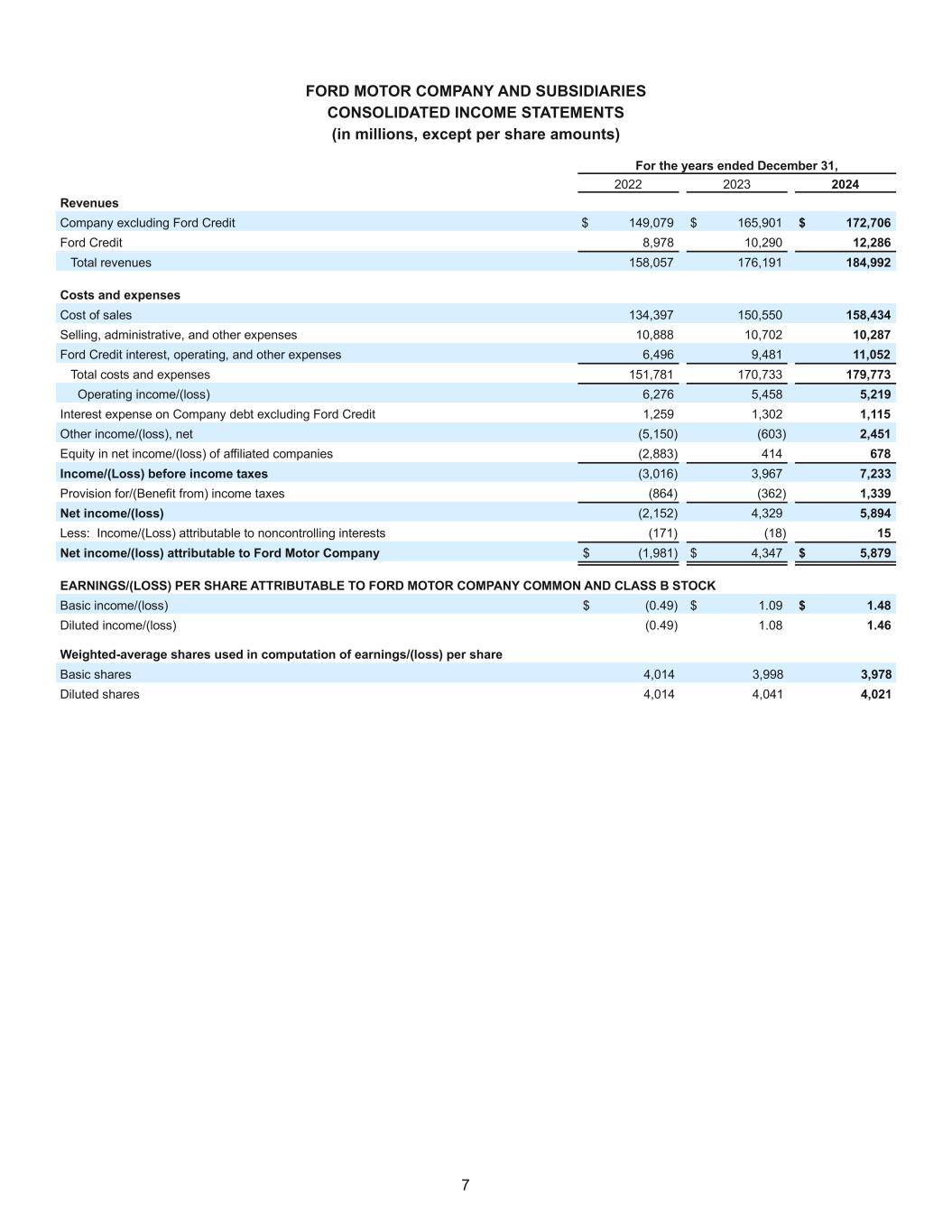 7 FORD MOTOR COMPANY AND SUBSIDIARIES CONSOLIDATED INCOME STATEMENTS (in millions, except per share amounts) For the years ended December 31, 2022 2023 2024 Revenues Company excluding Ford Credit $ 149,079 $ 165,901 $ 172,706 Ford Credit 8,978 10,290 12,286 Total revenues 158,057 176,191 184,992 Costs and expenses Cost of sales 134,397 150,550 158,434 Selling, administrative, and other expenses 10,888 10,702 10,287 Ford Credit interest, operating, and other expenses 6,496 9,481 11,052 Total costs and expenses 151,781 170,733 179,773 Operating income/(loss) 6,276 5,458 5,219 Interest expense on Company debt excluding Ford Credit 1,259 1,302 1,115 Other income/(loss), net (5,150) (603) 2,451 Equity in net income/(loss) of affiliated companies (2,883) 414 678 Income/(Loss) before income taxes (3,016) 3,967 7,233 Provision for/(Benefit from) income taxes (864) (362) 1,339 Net income/(loss) (2,152) 4,329 5,894 Less: Income/(Loss) attributable to noncontrolling interests (171) (18) 15 Net income/(loss) attributable to Ford Motor Company $ (1,981) $ 4,347 $ 5,879 EARNINGS/(LOSS) PER SHARE ATTRIBUTABLE TO FORD MOTOR COMPANY COMMON AND CLASS B STOCK Basic income/(loss) $ (0.49) $ 1.09 $ 1.48 Diluted income/(loss) (0.49) 1.08 1.46 Weighted-average shares used in computation of earnings/(loss) per share Basic shares 4,014 3,998 3,978 Diluted shares 4,014 4,041 4,021
