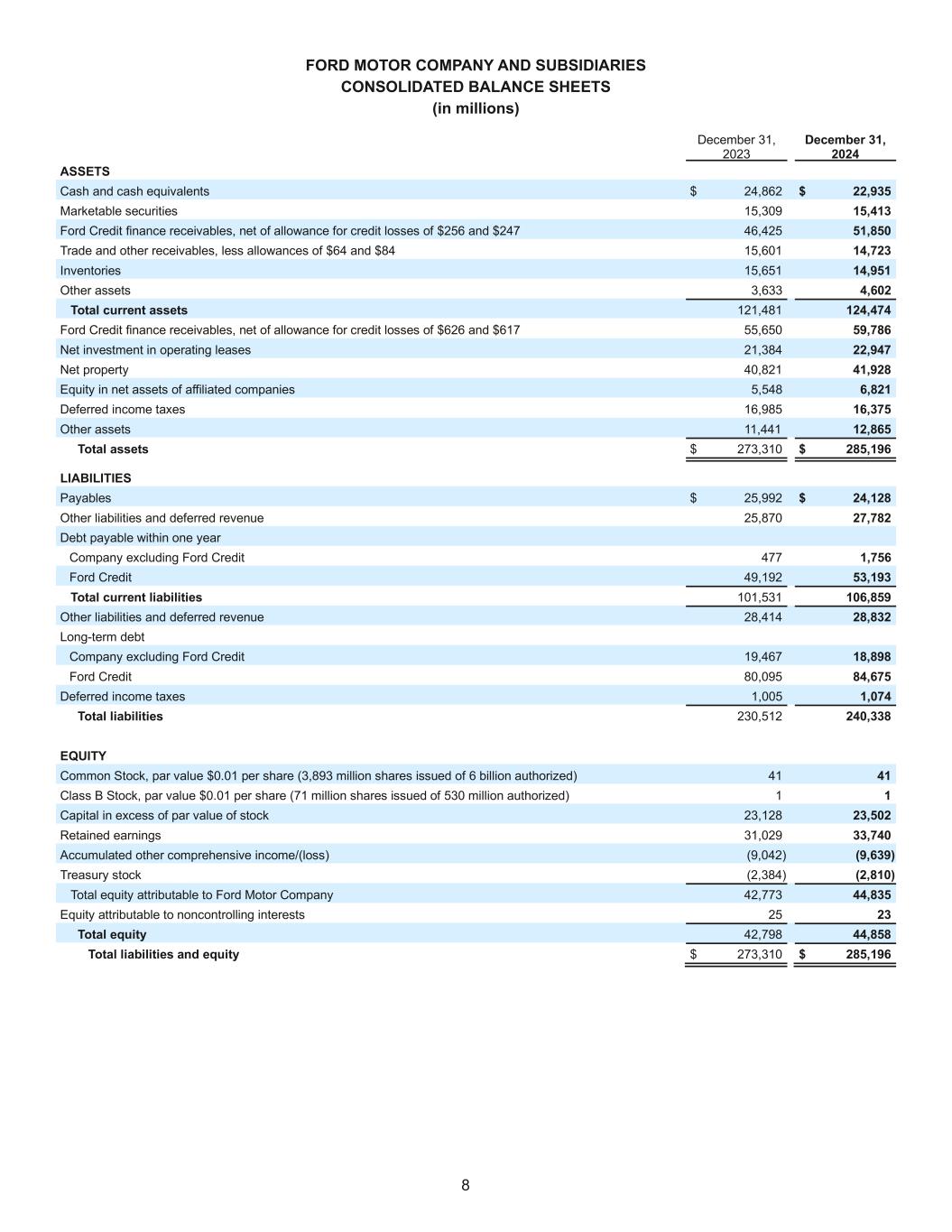 8 FORD MOTOR COMPANY AND SUBSIDIARIES CONSOLIDATED BALANCE SHEETS (in millions) December 31, 2023 December 31, 2024 ASSETS Cash and cash equivalents $ 24,862 $ 22,935 Marketable securities 15,309 15,413 Ford Credit finance receivables, net of allowance for credit losses of $256 and $247 46,425 51,850 Trade and other receivables, less allowances of $64 and $84 15,601 14,723 Inventories 15,651 14,951 Other assets 3,633 4,602 Total current assets 121,481 124,474 Ford Credit finance receivables, net of allowance for credit losses of $626 and $617 55,650 59,786 Net investment in operating leases 21,384 22,947 Net property 40,821 41,928 Equity in net assets of affiliated companies 5,548 6,821 Deferred income taxes 16,985 16,375 Other assets 11,441 12,865 Total assets $ 273,310 $ 285,196 LIABILITIES Payables $ 25,992 $ 24,128 Other liabilities and deferred revenue 25,870 27,782 Debt payable within one year Company excluding Ford Credit 477 1,756 Ford Credit 49,192 53,193 Total current liabilities 101,531 106,859 Other liabilities and deferred revenue 28,414 28,832 Long-term debt Company excluding Ford Credit 19,467 18,898 Ford Credit 80,095 84,675 Deferred income taxes 1,005 1,074 Total liabilities 230,512 240,338 EQUITY Common Stock, par value $0.01 per share (3,893 million shares issued of 6 billion authorized) 41 41 Class B Stock, par value $0.01 per share (71 million shares issued of 530 million authorized) 1 1 Capital in excess of par value of stock 23,128 23,502 Retained earnings 31,029 33,740 Accumulated other comprehensive income/(loss) (9,042) (9,639) Treasury stock (2,384) (2,810) Total equity attributable to Ford Motor Company 42,773 44,835 Equity attributable to noncontrolling interests 25 23 Total equity 42,798 44,858 Total liabilities and equity $ 273,310 $ 285,196