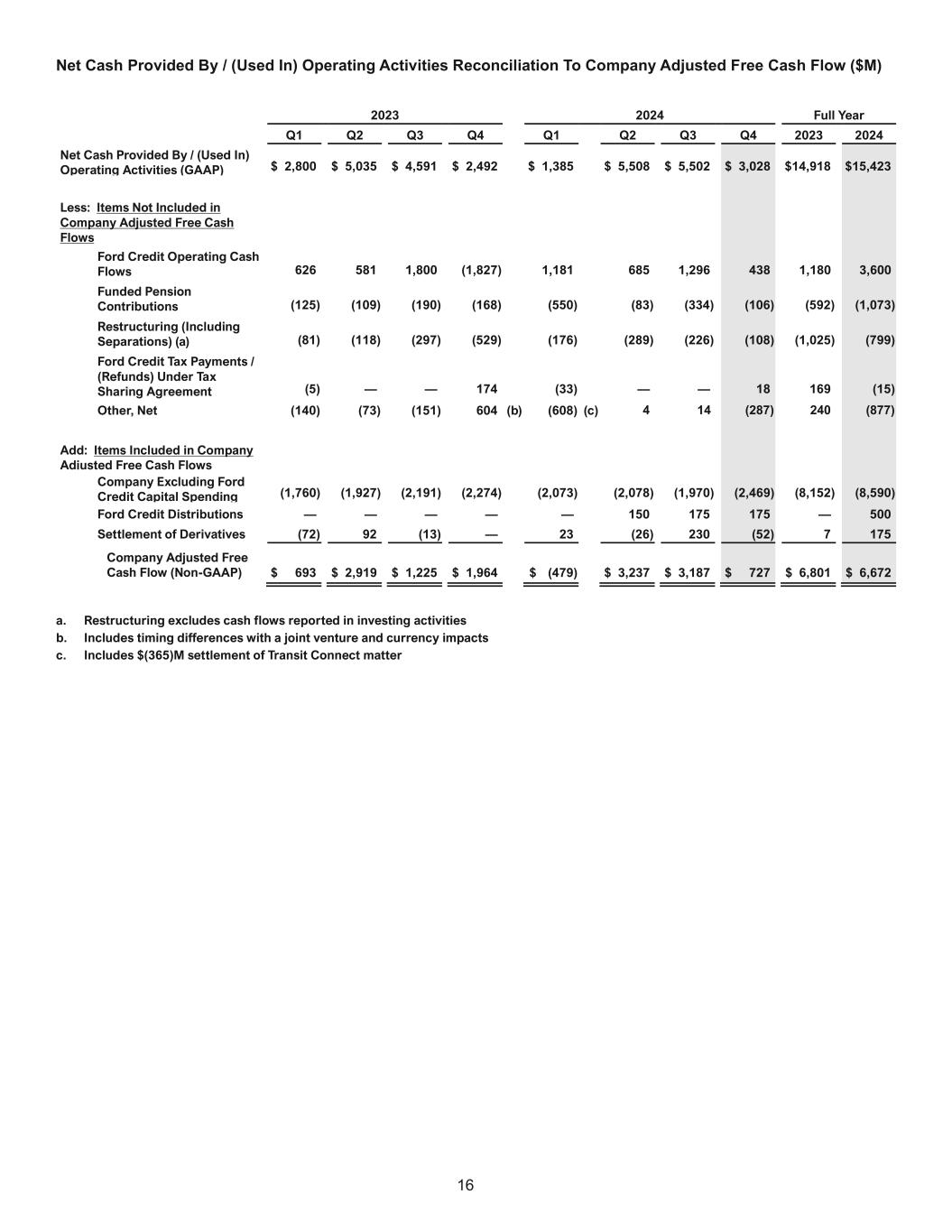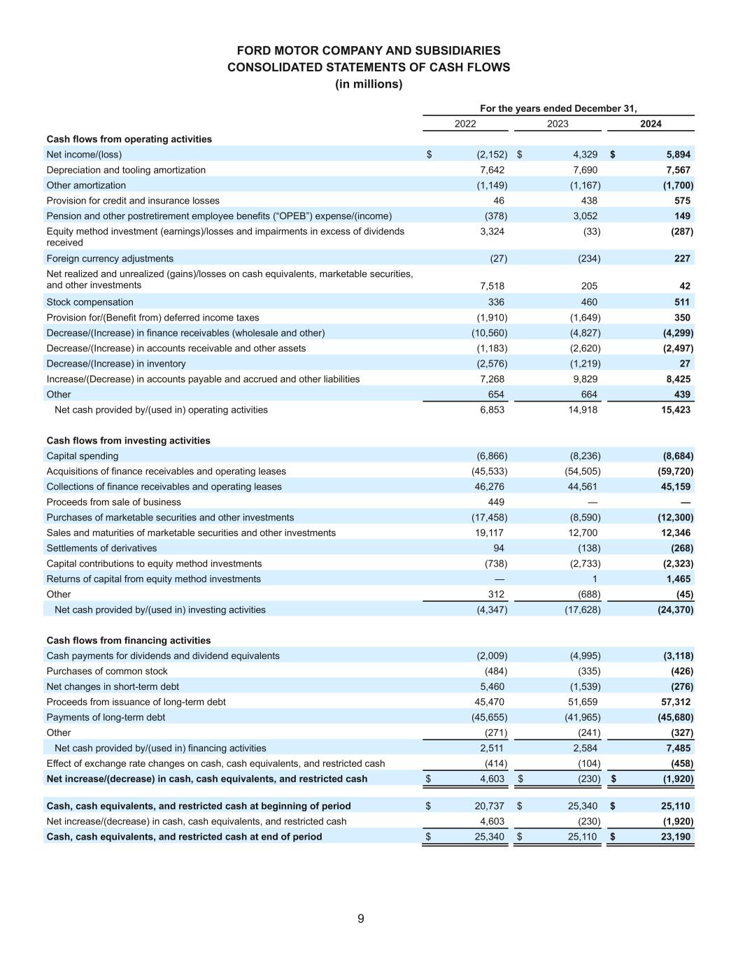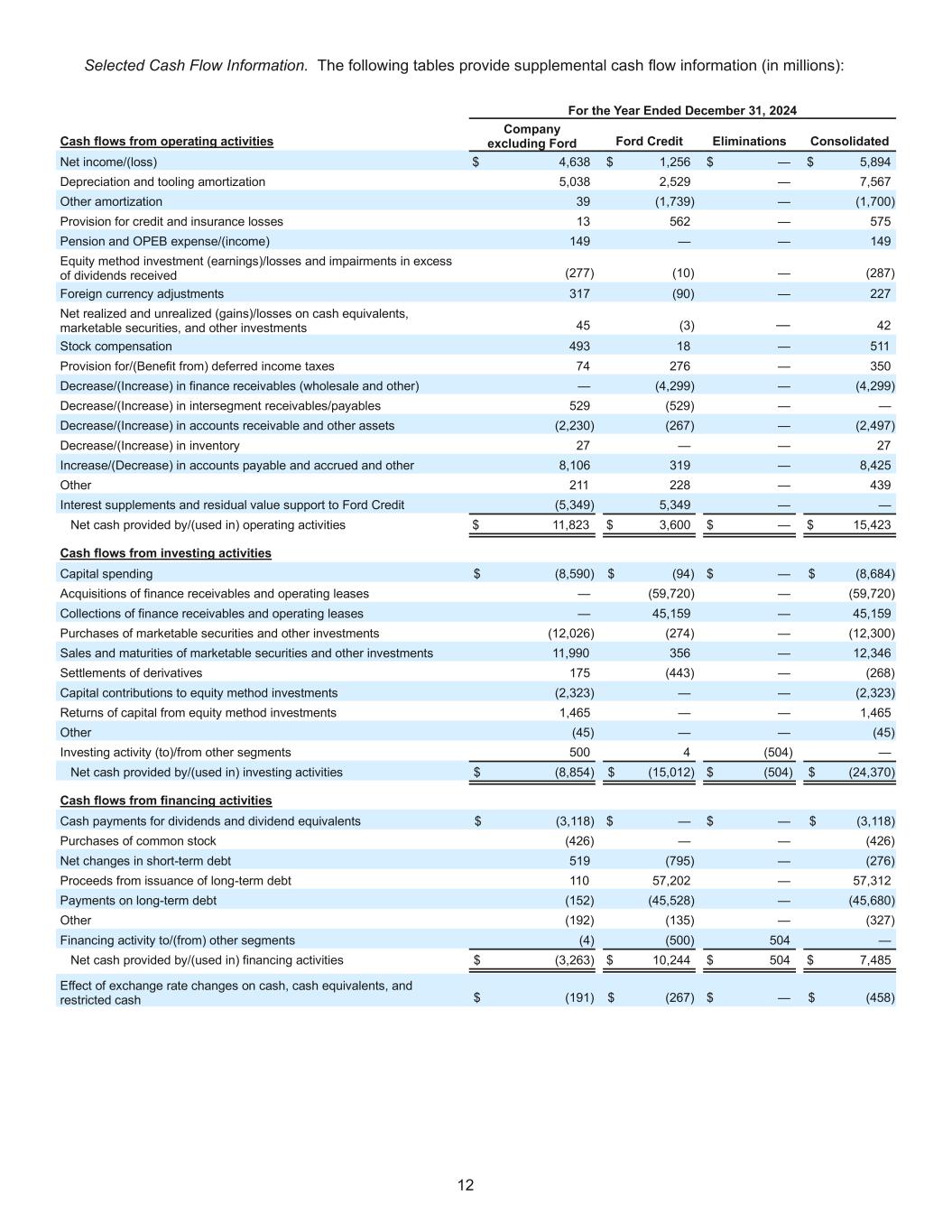 12 Selected Cash Flow Information. The following tables provide supplemental cash flow information (in millions): For the Year Ended December 31, 2024 Cash flows from operating activities Company excluding Ford Ford Credit Eliminations Consolidated Net income/(loss) $ 4,638 $ 1,256 $ — $ 5,894 Depreciation and tooling amortization 5,038 2,529 — 7,567 Other amortization 39 (1,739) — (1,700) Provision for credit and insurance losses 13 562 — 575 Pension and OPEB expense/(income) 149 — — 149 Equity method investment (earnings)/losses and impairments in excess of dividends received (277) (10) — (287) Foreign currency adjustments 317 (90) — 227 Net realized and unrealized (gains)/losses on cash equivalents, marketable securities, and other investments 45 (3) — 42 Stock compensation 493 18 — 511 Provision for/(Benefit from) deferred income taxes 74 276 — 350 Decrease/(Increase) in finance receivables (wholesale and other) — (4,299) — (4,299) Decrease/(Increase) in intersegment receivables/payables 529 (529) — — Decrease/(Increase) in accounts receivable and other assets (2,230) (267) — (2,497) Decrease/(Increase) in inventory 27 — — 27 Increase/(Decrease) in accounts payable and accrued and other 8,106 319 — 8,425 Other 211 228 — 439 Interest supplements and residual value support to Ford Credit (5,349) 5,349 — — Net cash provided by/(used in) operating activities $ 11,823 $ 3,600 $ — $ 15,423 Cash flows from investing activities Capital spending $ (8,590) $ (94) $ — $ (8,684) Acquisitions of finance receivables and operating leases — (59,720) — (59,720) Collections of finance receivables and operating leases — 45,159 — 45,159 Purchases of marketable securities and other investments (12,026) (274) — (12,300) Sales and maturities of marketable securities and other investments 11,990 356 — 12,346 Settlements of derivatives 175 (443) — (268) Capital contributions to equity method investments (2,323) — — (2,323) Returns of capital from equity method investments 1,465 — — 1,465 Other (45) — — (45) Investing activity (to)/from other segments 500 4 (504) — Net cash provided by/(used in) investing activities $ (8,854) $ (15,012) $ (504) $ (24,370) Cash flows from financing activities Cash payments for dividends and dividend equivalents $ (3,118) $ — $ — $ (3,118) Purchases of common stock (426) — — (426) Net changes in short-term debt 519 (795) — (276) Proceeds from issuance of long-term debt 110 57,202 — 57,312 Payments on long-term debt (152) (45,528) — (45,680) Other (192) (135) — (327) Financing activity to/(from) other segments (4) (500) 504 — Net cash provided by/(used in) financing activities $ (3,263) $ 10,244 $ 504 $ 7,485 Effect of exchange rate changes on cash, cash equivalents, and restricted cash $ (191) $ (267) $ — $ (458)