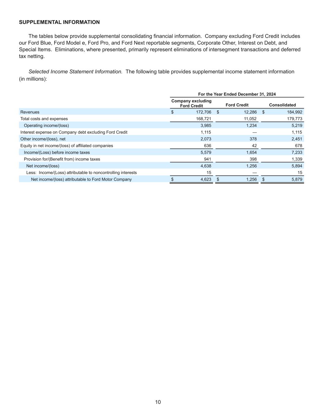10 SUPPLEMENTAL INFORMATION The tables below provide supplemental consolidating financial information. Company excluding Ford Credit includes our Ford Blue, Ford Model e, Ford Pro, and Ford Next reportable segments, Corporate Other, Interest on Debt, and Special Items. Eliminations, where presented, primarily represent eliminations of intersegment transactions and deferred tax netting. Selected Income Statement Information. The following table provides supplemental income statement information (in millions): For the Year Ended December 31, 2024 Company excluding Ford Credit Ford Credit Consolidated Revenues $ 172,706 $ 12,286 $ 184,992 Total costs and expenses 168,721 11,052 179,773 Operating income/(loss) 3,985 1,234 5,219 Interest expense on Company debt excluding Ford Credit 1,115 — 1,115 Other income/(loss), net 2,073 378 2,451 Equity in net income/(loss) of affiliated companies 636 42 678 Income/(Loss) before income taxes 5,579 1,654 7,233 Provision for/(Benefit from) income taxes 941 398 1,339 Net income/(loss) 4,638 1,256 5,894 Less: Income/(Loss) attributable to noncontrolling interests 15 — 15 Net income/(loss) attributable to Ford Motor Company $ 4,623 $ 1,256 $ 5,879