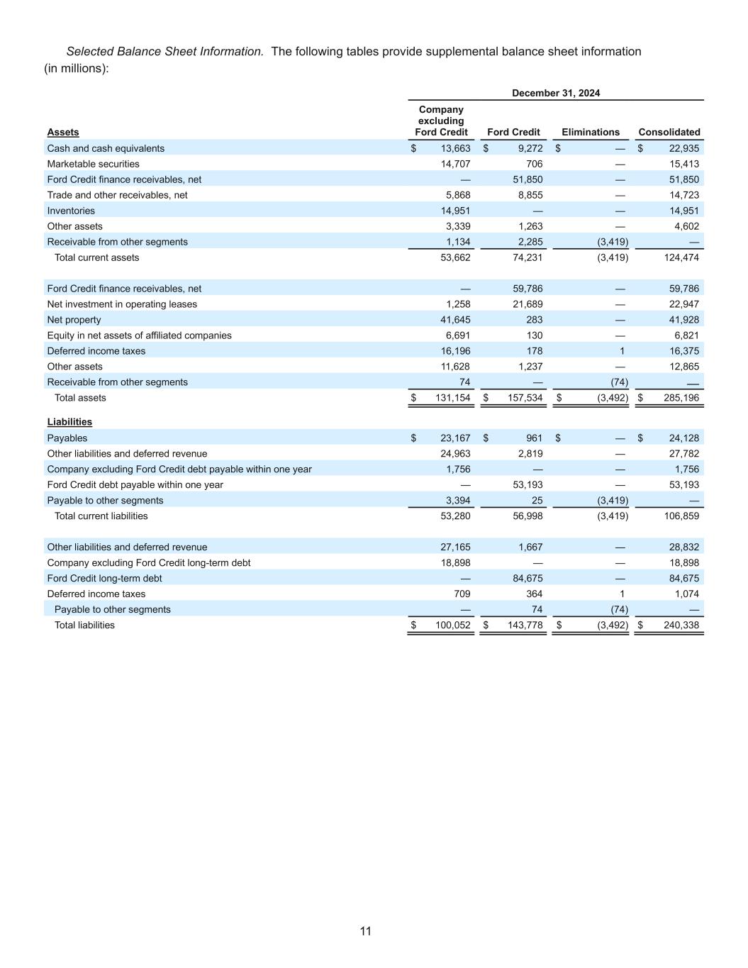 11 Selected Balance Sheet Information. The following tables provide supplemental balance sheet information (in millions): December 31, 2024 Assets Company excluding Ford Credit Ford Credit Eliminations Consolidated Cash and cash equivalents $ 13,663 $ 9,272 $ — $ 22,935 Marketable securities 14,707 706 — 15,413 Ford Credit finance receivables, net — 51,850 — 51,850 Trade and other receivables, net 5,868 8,855 — 14,723 Inventories 14,951 — — 14,951 Other assets 3,339 1,263 — 4,602 Receivable from other segments 1,134 2,285 (3,419) — Total current assets 53,662 74,231 (3,419) 124,474 Ford Credit finance receivables, net — 59,786 — 59,786 Net investment in operating leases 1,258 21,689 — 22,947 Net property 41,645 283 — 41,928 Equity in net assets of affiliated companies 6,691 130 — 6,821 Deferred income taxes 16,196 178 1 16,375 Other assets 11,628 1,237 — 12,865 Receivable from other segments 74 — (74) — Total assets $ 131,154 $ 157,534 $ (3,492) $ 285,196 Liabilities Payables $ 23,167 $ 961 $ — $ 24,128 Other liabilities and deferred revenue 24,963 2,819 — 27,782 Company excluding Ford Credit debt payable within one year 1,756 — — 1,756 Ford Credit debt payable within one year — 53,193 — 53,193 Payable to other segments 3,394 25 (3,419) — Total current liabilities 53,280 56,998 (3,419) 106,859 Other liabilities and deferred revenue 27,165 1,667 — 28,832 Company excluding Ford Credit long-term debt 18,898 — — 18,898 Ford Credit long-term debt — 84,675 — 84,675 Deferred income taxes 709 364 1 1,074 Payable to other segments — 74 (74) — Total liabilities $ 100,052 $ 143,778 $ (3,492) $ 240,338