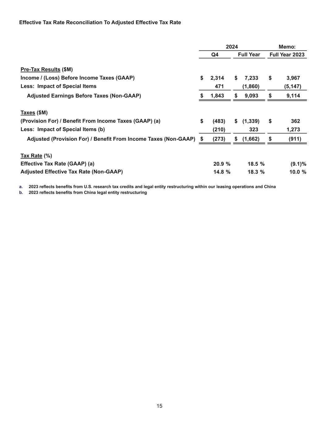 15 Effective Tax Rate Reconciliation To Adjusted Effective Tax Rate 2024 Memo: Q4 Full Year Full Year 2023 Pre-Tax Results ($M) Income / (Loss) Before Income Taxes (GAAP) $ 2,314 $ 7,233 $ 3,967 Less: Impact of Special Items 471 (1,860) (5,147) Adjusted Earnings Before Taxes (Non-GAAP) $ 1,843 $ 9,093 $ 9,114 Taxes ($M) (Provision For) / Benefit From Income Taxes (GAAP) (a) $ (483) $ (1,339) $ 362 Less: Impact of Special Items (b) (210) 323 1,273 Adjusted (Provision For) / Benefit From Income Taxes (Non-GAAP) $ (273) $ (1,662) $ (911) Tax Rate (%) Effective Tax Rate (GAAP) (a) 20.9 % 18.5 % (9.1) % Adjusted Effective Tax Rate (Non-GAAP) 14.8 % 18.3 % 10.0 % a. 2023 reflects benefits from U.S. research tax credits and legal entity restructuring within our leasing operations and China b. 2023 reflects benefits from China legal entity restructuring