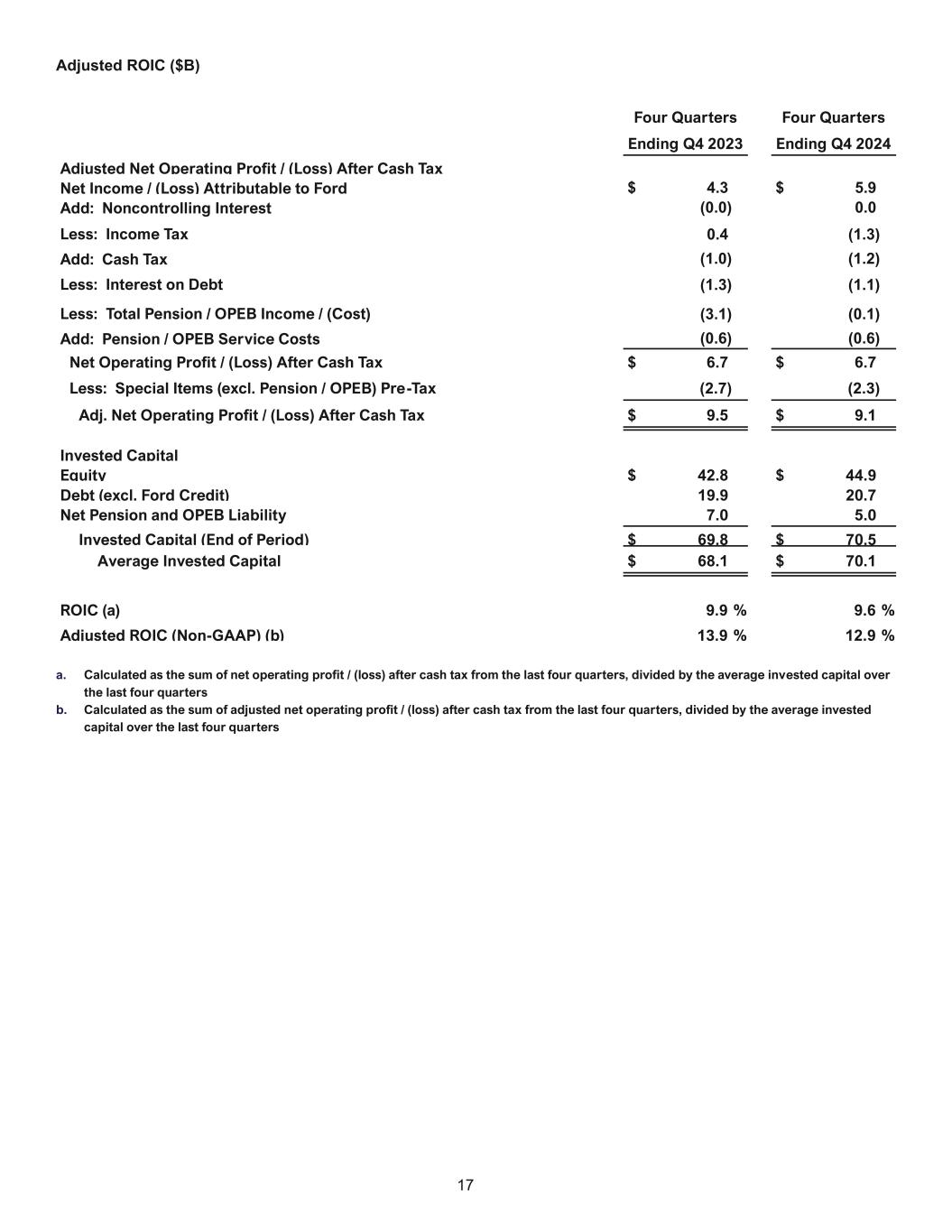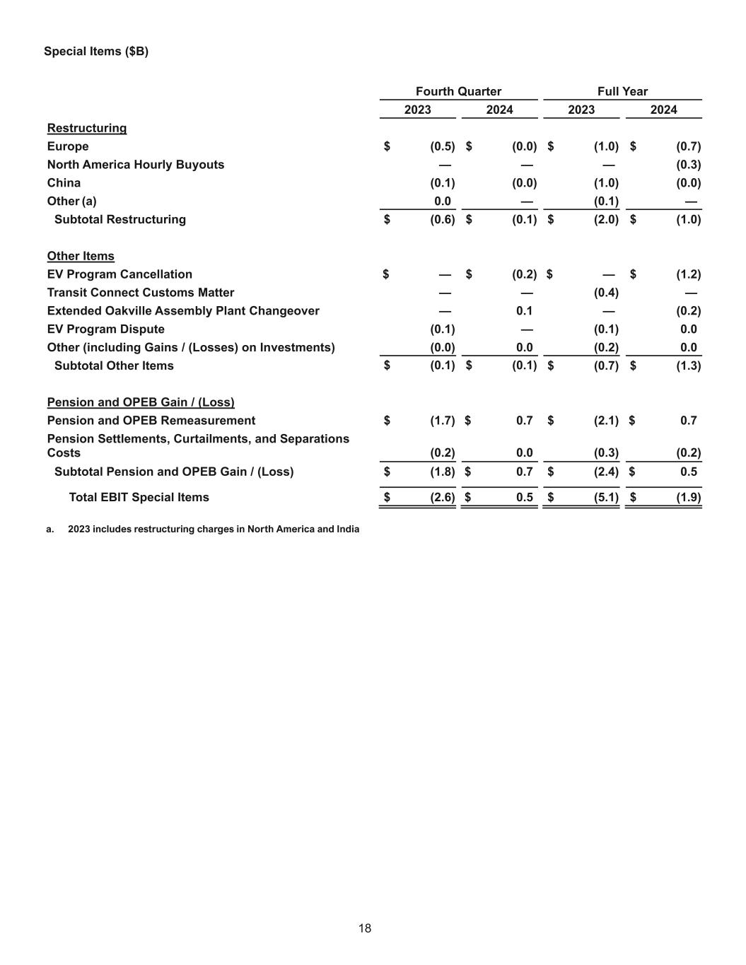 17 Adjusted ROIC ($B) Four Quarters Ending Q4 2023 Four Quarters Ending Q4 2024 Adjusted Net Operating Profit / (Loss) After Cash Tax Net Income / (Loss) Attributable to Ford $ 4.3 $ 5.9 Add: Noncontrolling Interest (0.0) 0.0 Less: Income Tax 0.4 (1.3) Add: Cash Tax (1.0) (1.2) Less: Interest on Debt (1.3) (1.1) Less: Total Pension / OPEB Income / (Cost) (3.1) (0.1) Add: Pension / OPEB Service Costs (0.6) (0.6) Net Operating Profit / (Loss) After Cash Tax $ 6.7 $ 6.7 Less: Special Items (excl. Pension / OPEB) Pre-Tax (2.7) (2.3) Adj. Net Operating Profit / (Loss) After Cash Tax $ 9.5 $ 9.1 Invested Capital Equity $ 42.8 $ 44.9 Debt (excl. Ford Credit) 19.9 20.7 Net Pension and OPEB Liability 7.0 5.0 Invested Capital (End of Period) $ 69.8 $ 70.5 Average Invested Capital $ 68.1 $ 70.1 ROIC (a) 9.9 % 9.6 % Adjusted ROIC (Non-GAAP) (b) 13.9 % 12.9 % a. Calculated as the sum of net operating profit / (loss) after cash tax from the last four quarters, divided by the average invested capital over the last four quarters b. Calculated as the sum of adjusted net operating profit / (loss) after cash tax from the last four quarters, divided by the average invested capital over the last four quarters
