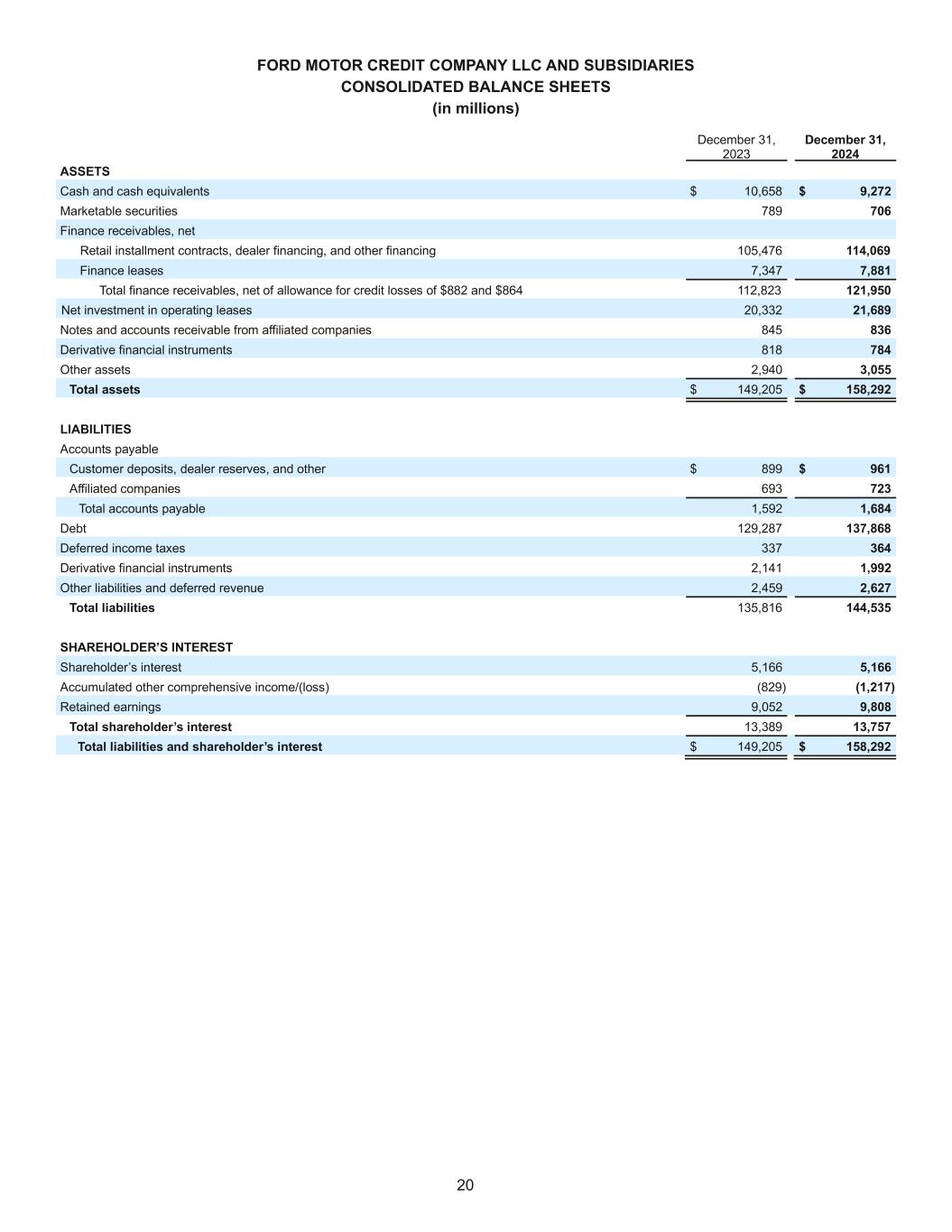 20 FORD MOTOR CREDIT COMPANY LLC AND SUBSIDIARIES CONSOLIDATED BALANCE SHEETS (in millions) December 31, 2023 December 31, 2024 ASSETS Cash and cash equivalents $ 10,658 $ 9,272 Marketable securities 789 706 Finance receivables, net Retail installment contracts, dealer financing, and other financing 105,476 114,069 Finance leases 7,347 7,881 Total finance receivables, net of allowance for credit losses of $882 and $864 112,823 121,950 Net investment in operating leases 20,332 21,689 Notes and accounts receivable from affiliated companies 845 836 Derivative financial instruments 818 784 Other assets 2,940 3,055 Total assets $ 149,205 $ 158,292 LIABILITIES Accounts payable Customer deposits, dealer reserves, and other $ 899 $ 961 Affiliated companies 693 723 Total accounts payable 1,592 1,684 Debt 129,287 137,868 Deferred income taxes 337 364 Derivative financial instruments 2,141 1,992 Other liabilities and deferred revenue 2,459 2,627 Total liabilities 135,816 144,535 SHAREHOLDER’S INTEREST Shareholder’s interest 5,166 5,166 Accumulated other comprehensive income/(loss) (829) (1,217) Retained earnings 9,052 9,808 Total shareholder’s interest 13,389 13,757 Total liabilities and shareholder’s interest $ 149,205 $ 158,292